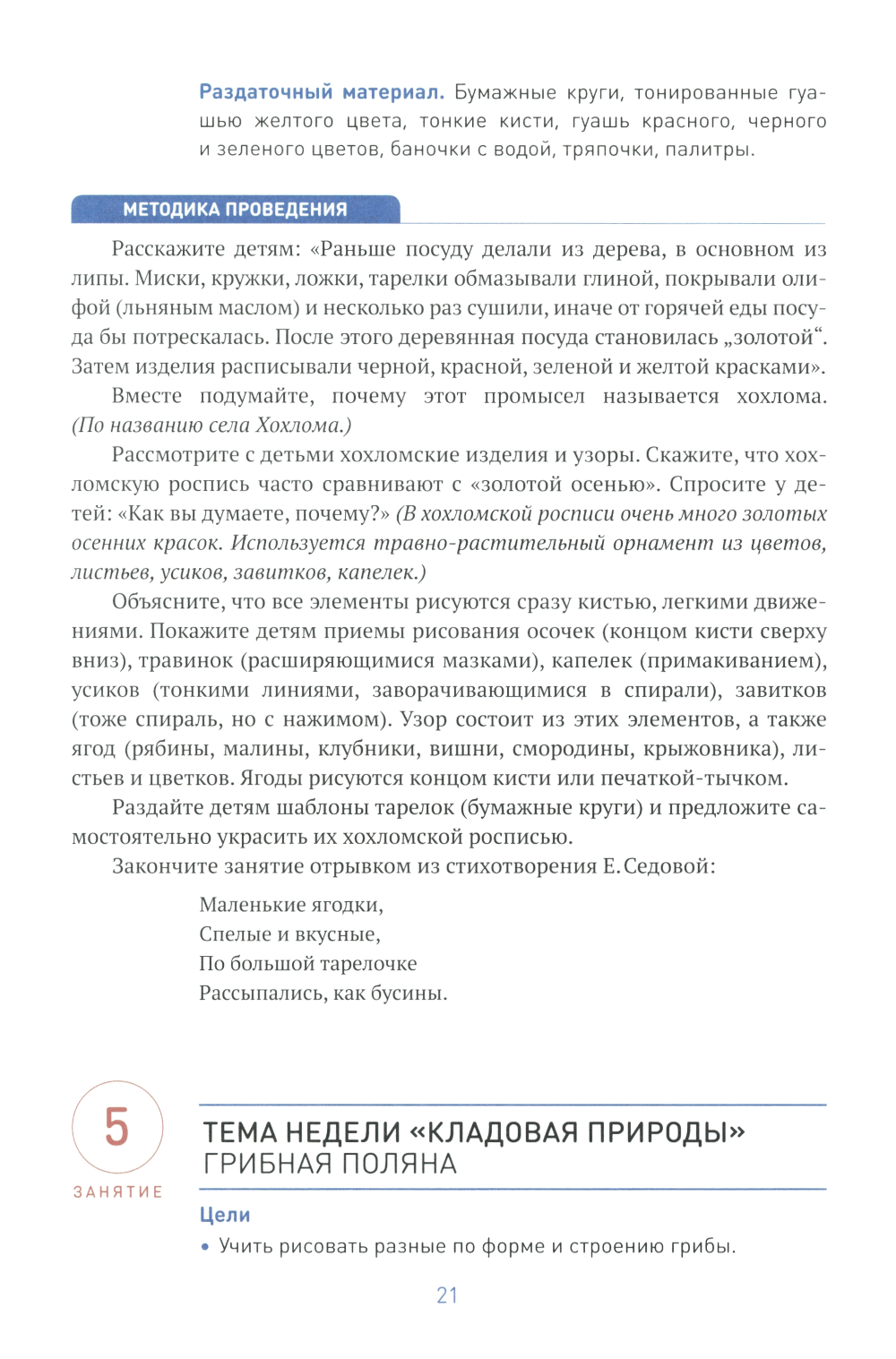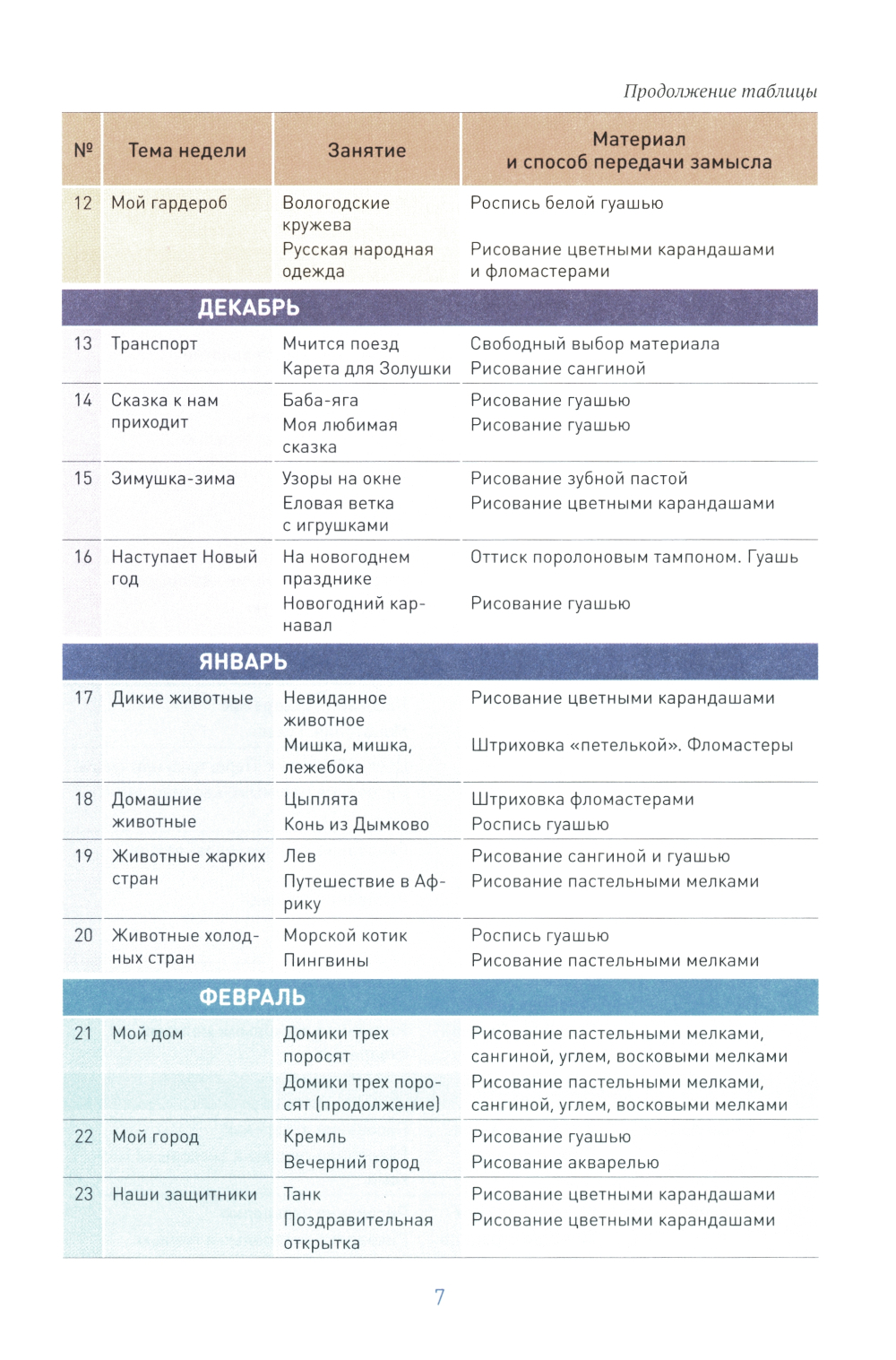 В данном пособии представлены конспекты увлекательных занятий с детьми 6-7 лет по рисованию традиционными и нетрадиционными способами. На занятиях дети совершенствуют технику рисования, закрепляют навыки использования выразительных средств и изобразительных материалов в соответствии с их спецификой (простой карандаш, кисть, перо, цветные карандаши, гуашь, акварель, пастель, сангина, угольный карандаш, восковые мелки, гелевая ручка). Выполняя творческие задания, дети передают характерные признаки персонажа, его позу и движения. В сюжетном рисовании учатся правильно размещать предметы относительно друг друга, осваивают способ наложения цветового пятна тушевкой, рисование штриховкой; знакомятся с цветами, имеющими два оттенка. На занятиях по рисованию развивается умение создавать коллективную работу, а также последовательно выполнять все этапы работы.| Издательство | Мозаика-Синтез |