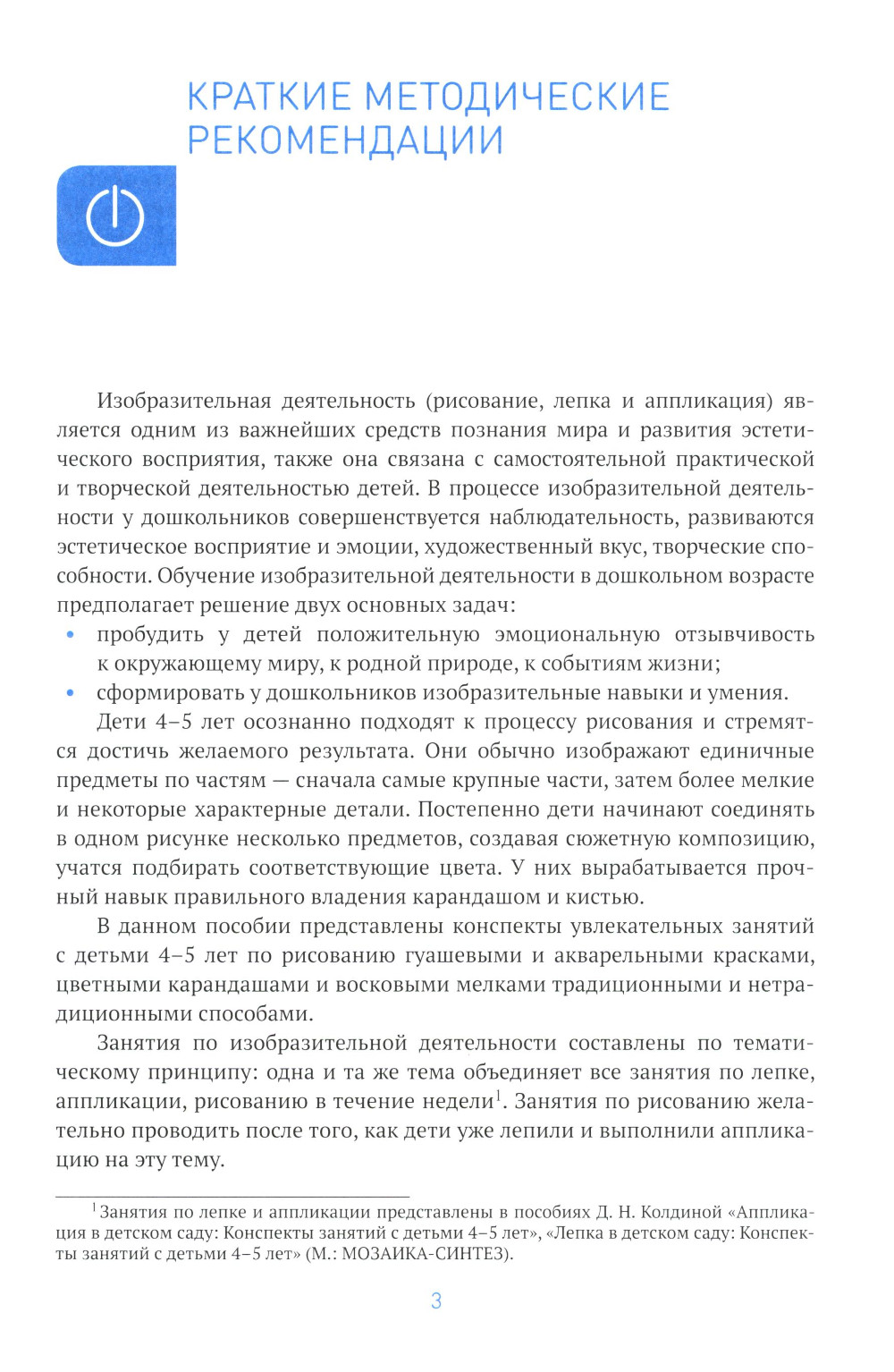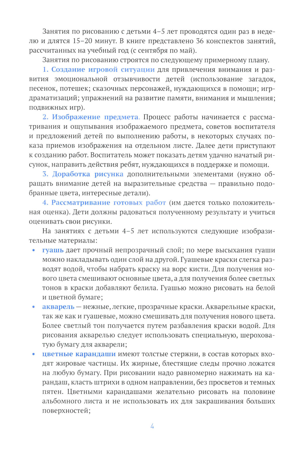 В пособии представлены сценарии занятий с детьми 4-5 лет по рисованию цветными карандашами, гуашью и акварельными красками традиционными и нетрадиционными способами. Занятия способствуют развитию эмоциональной отзывчивости, воспитанию чувства прекрасного; развитию воображения, самостоятельности, настойчивости, аккуратности, трудолюбия, умения доводить работу до конца; формированию изобразительных умений и навыков. Представленные в пособии конспекты разработаны в рамках вариативности программы «ОТ РОЖДЕНИЯ ДО ШКОЛЫ». Педагог может по своему усмотрению использовать для занятий с детьми эту книгу или книгу с конспектами Т. С. Комаровой («Изобразительная деятельность в детском саду. Конспекты с детьми 4-5 лет»). Книга адресована воспитателям и родителям.| Издательство | Мозаика-Синтез |