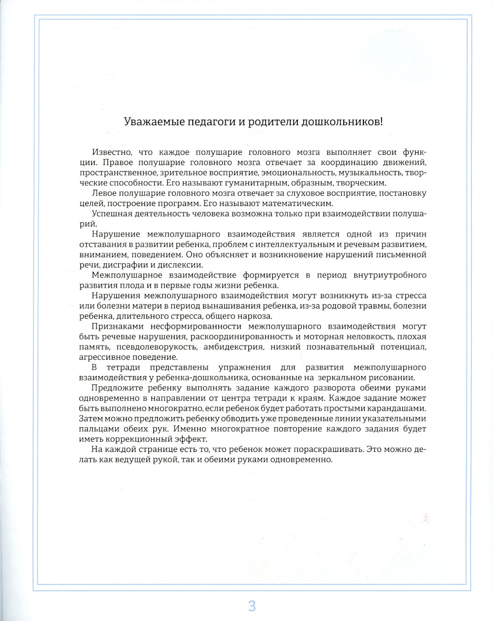 В тетради представлены упражнения для развития межполушарного взаимодействия, профилактики нарушений письменной речи (дислексия, дисграфия). Упражнения основаны на зеркальном рисовании. Они помогают развить ручную и мелкую моторику, преодолеть псевдолеворукость и амбидекстрию. Использование подобных упражнений поможет избежать нарушений речевого и интеллектуального развития, будет способствовать всестороннему развитию малыша. Адресована логопедам, педагогам ДОУ и родителям дошкольников.| Издательство | Детство-Пресс |