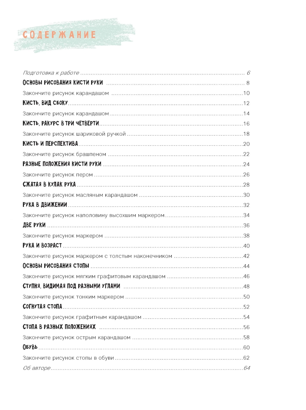Серия «Скетчбук начинающего художника» от известного иллюстратора Лиз Эрзог воплотила в себе все достоинства современных учебников по рисованию: простоту, наглядность, возможность начать практиковаться прямо на страницах пособия, а также, что немаловажно, компактность и бюджетность. В каждом из этих скетчбуков вас ждет по 50 мастер-классов, выполненных и показанных пошагово и очень подробно. Вы можете повторить каждый рисунок за автором прямо на соседней странице! Остается лишь определиться с выбором рисовальных принадлежностей и... вы готовы приступить к творчеству! В этом скетчбуке вас ждут мастер-классы по рисованию кистей рук и стоп - это те части тела, что обычно вызывают наибольшие затруднения у начинающих иллюстраторов. Вы начнете с самых азов и попробуете «конструировать» конечности из базовых геометрических форм и фигур, прорисовывать мельчайшие детали и показывать их в перспективе, а затем научитесь создавать реалистичные рисунки рук и ног людей разного возраста различными художественными инструментами: маркерами, карандашами, брашпенами. Благодаря тому, что все уроки разбиты на 2-5 простых этапов, вы легко выделите главные моменты. В мастер-классах показаны разные техники завершения рисунка, что позволит придать вашему изображению объем и характер. Просто следуйте указаниям!| Издательство | Контэнт-Канц |