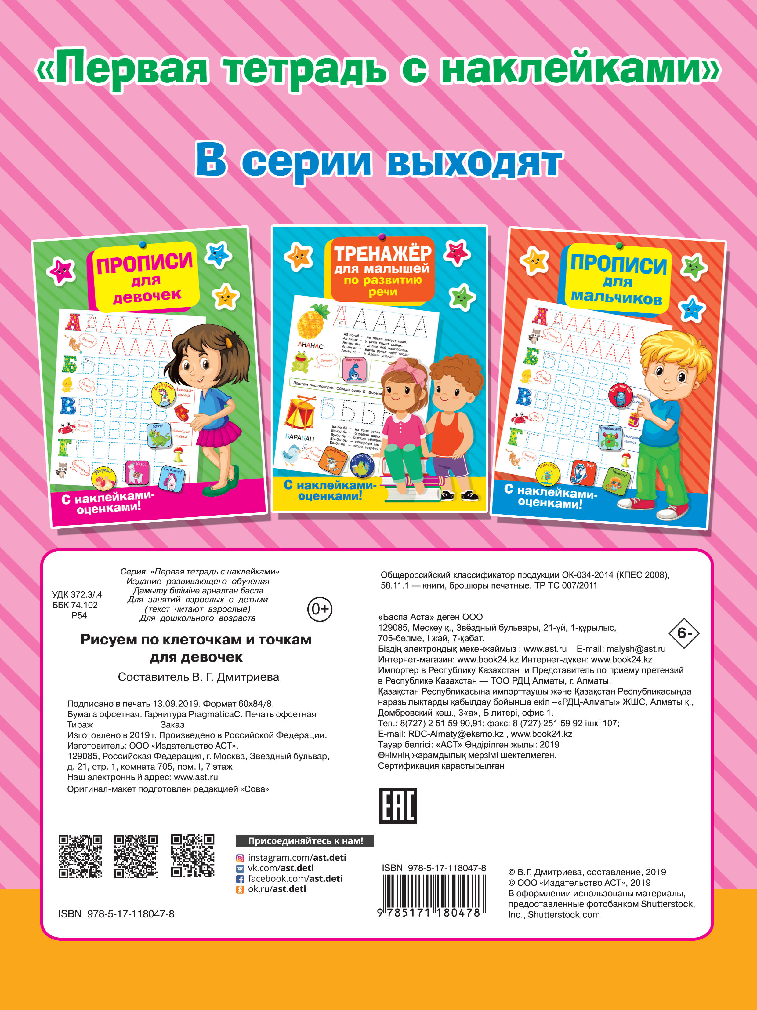 О чем эта книга Прекрасно иллюстрированные развивающие прописи большого формата с поощрительными наклейками - отличный подарок для будущих первоклассников. Кому эта книга будет интересна Издание будет интересно заботливым родителям и любознательным дошколятам для подготовки руки к письму и развития графических навыков. Каковы особенности этой книги • Красочное издание с поощрительными наклейками - сборник графических упражнений для развития мелкой моторики. • Занимательные задания развивают интеллект, пространственное мышление и творческие способности. • Выполняя задания, ребенок легко и с удовольствием овладеет навыками дорисовки, обводки по контуру, рисования по клеточкам. • Первые успехи малыша можно будет отметить красочными поощрительными наклейками. • Книга учит дошколят мыслить творчески, быть внимательными, иметь хорошую зрительную память. Пусть дошколята играют, рисуют, узнают новое и оценивают свои успехи!| Издательство | ИЗДАТЕЛЬСТВО "АСТ" |