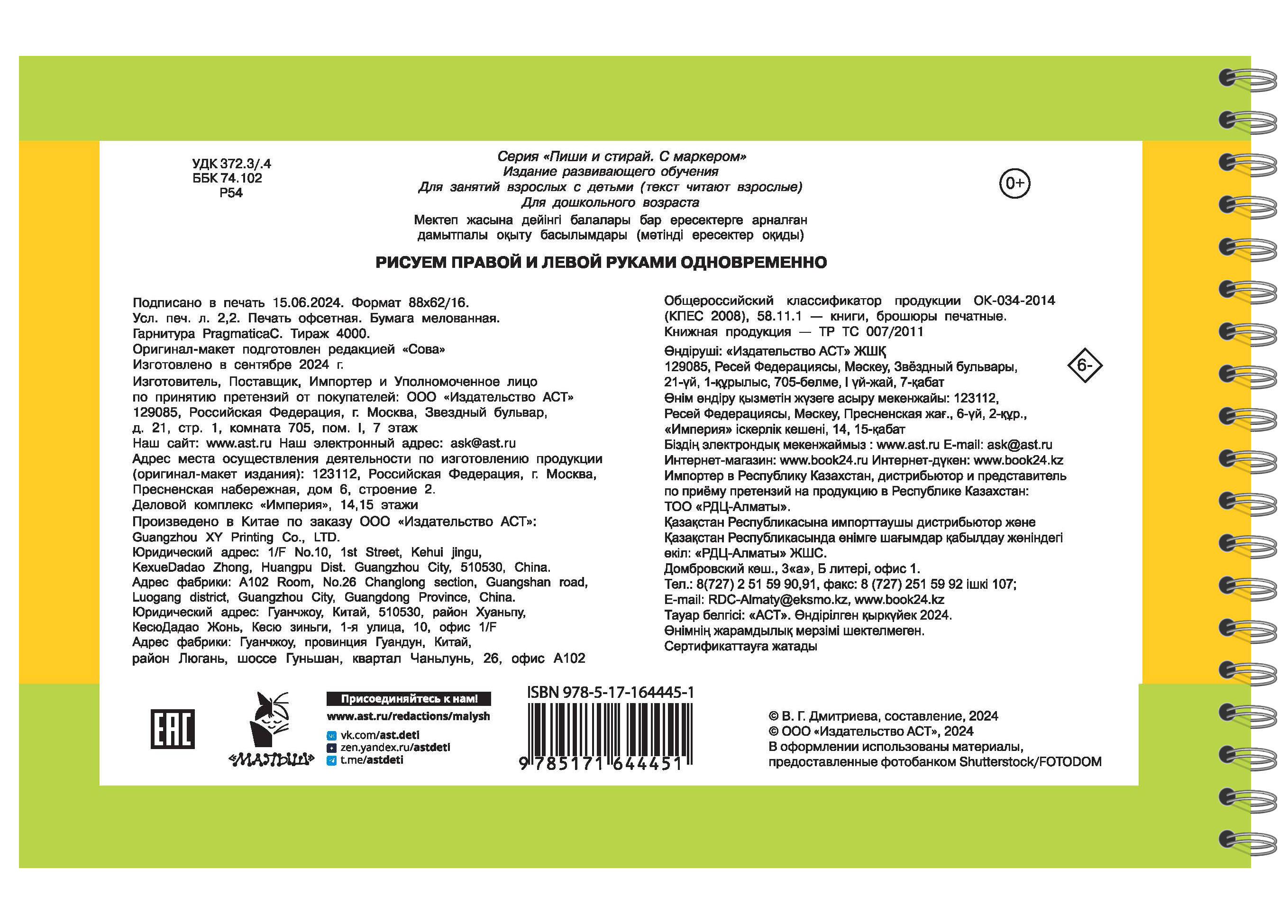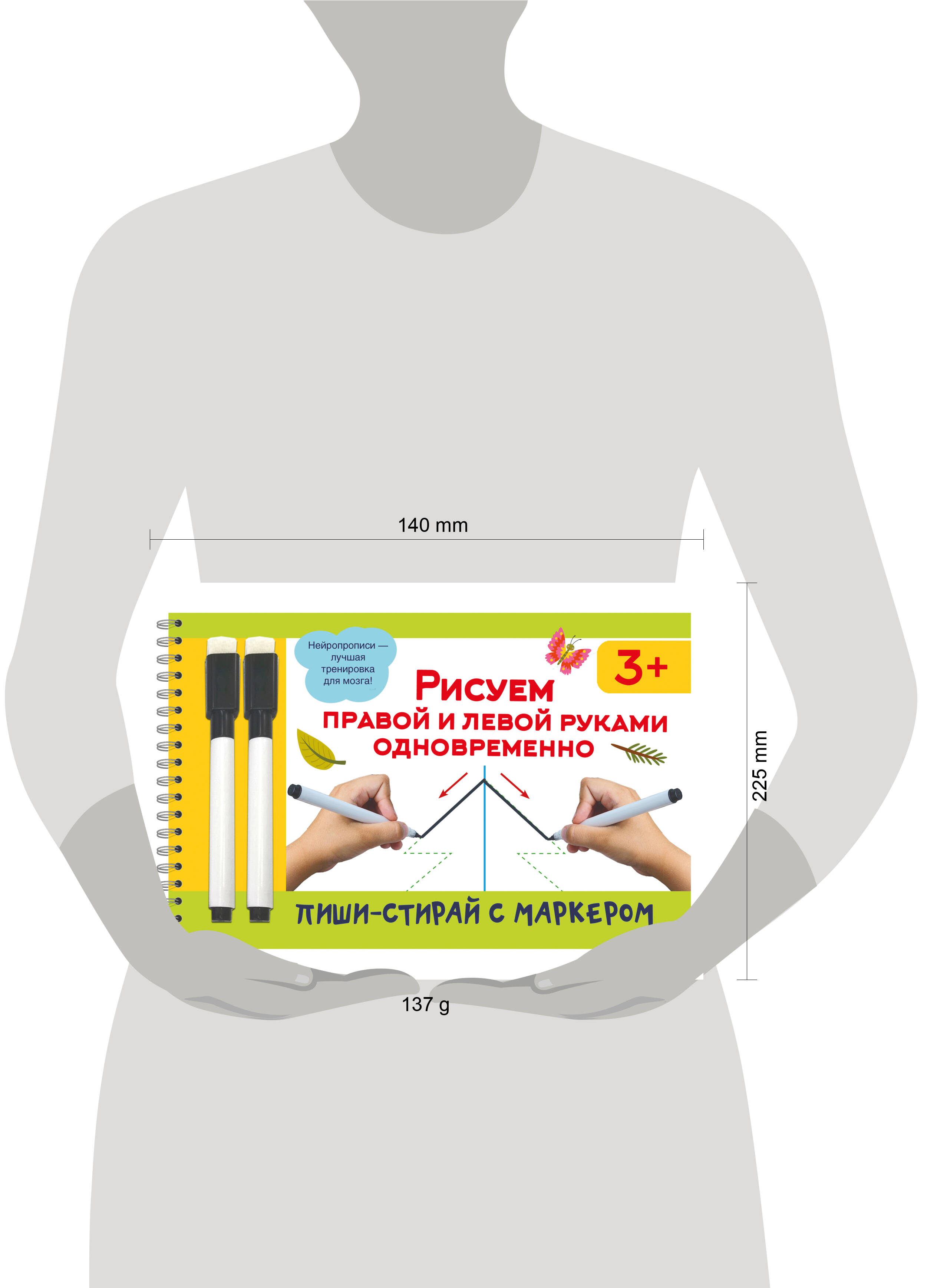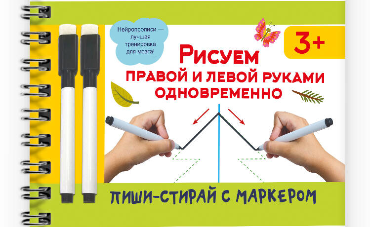 Представляем вашему вниманию удобный многоразовый блокнот на спирали для лучшей тренировки мозга. Теперь ваш малыш сможет писать и стирать, исправлять ошибки и снова начинать с чистого листа благодаря специальному маркеру, который идеально подходит для письма на ламинированных страницах. Малышу предстоит пройти квест и выполнить множество хитрых заданий, цель которых - наладить согласованное взаимодействие правого и левого полушарий мозга. Для чего это нужно? Для того чтобы ребёнок научился концентрировать внимание, стал более усидчивым, улучшил свою память, речь, координацию движений и в будущем без труда добился успеха в школе. Все задания ребёнок выполняет двумя руками одновременно. Плотная мелованная бумага и глянцевые ламинированные страницы делают книгу не только привлекательной, но и долговечной. В комплекте - 2 маркера на водной основе. Книгу можно использовать дома, на уроках в детском саду и даже в дороге. Забудьте о проблемах, связанных с неусидчивостью ребёнка, слабой концентрацией внимания, речевыми нарушениями, плохо развитой мелкой моторикой. Подарите вашему малышу возможность стать успешным и уверенным в своих силах!| Издательство | Издательство "АСТ" |