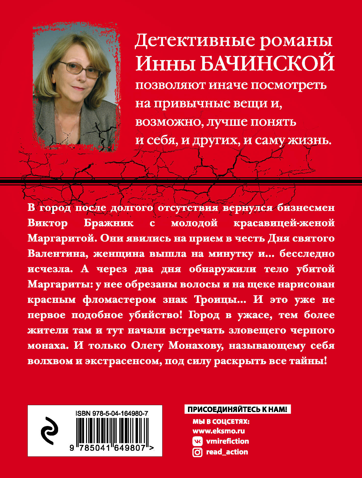 В город после долгого отсутствия вернулся бизнесмен Виктор Бражник с молодой красавицей-женой Маргаритой. Они явились на прием в честь Дня святого Валентина, женщина вышла на минутку и… бесследно исчезла. А через два дня обнаружили тело убитой Маргариты: у нее обрезаны волосы и на щеке нарисован красным фломастером знак Троицы… И это уже не первое подобное убийство! Город в ужасе, тем более, жители там и тут начали встречать зловещего черного монаха. И только Олегу Монахову, называющему себя волхвом и экстрасенсом, под силу раскрыть все тайны! Инна Бачинская - современная российская писательница, автор более 40 остросюжетных романов, хорошо известных любителям качественного детектива. Ее книги - словно диалог с писателем, умным, точно чувствующим и ироничным.| Издательство | Эксмо |