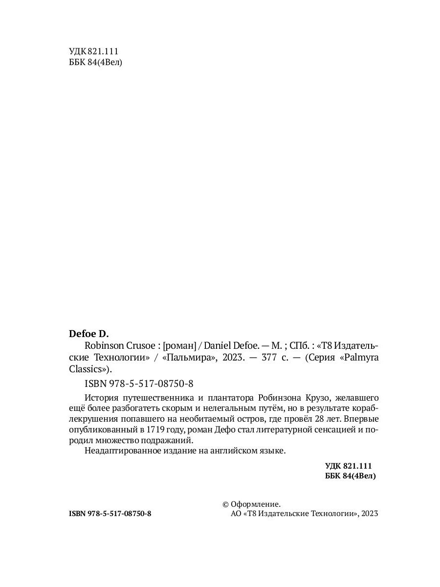 Daniel Defoe, born Daniel Foe (c. 1660-1731) - an English writer, trader, journalist, and spy. He is most famous for his novel Robinson Crusoe, published in 1719, which is claimed to be second only to the Bible in its number of translations. He wrote many political tracts, was often in trouble with the authorities, and spent a period in prison Robinson Crusoe was first published on 25 April 1719. Crusoe sets sail from the Queen's Dock in Hull on a sea voyage in August 1651, against the wishes of his parents, who want him to pursue a career, possibly in law. After a tumultuous journey where his ship is wrecked in a storm, his lust for the sea remains so strong that he sets out to sea again.| Издательство | Т8 RUGRAM |