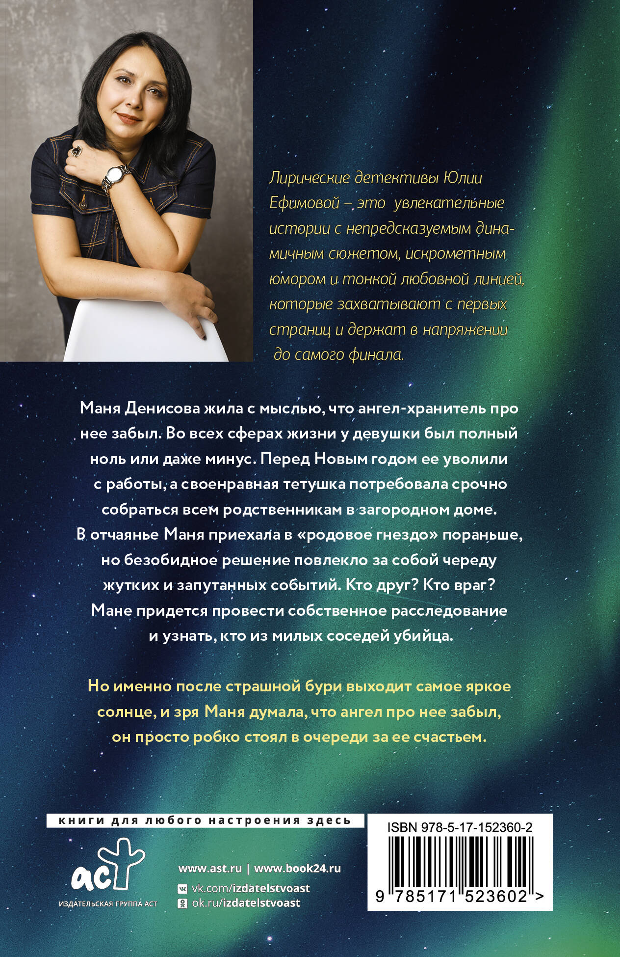 Маня Денисова жила с мыслью, что ангел-хранитель про нее забыл. Во всех сферах жизни у девушки был полный ноль или даже минус. Перед Новым годом ее уволили с работы, а своенравная тетушка потребовала срочно собраться всем родственникам в загородном доме. В отчаянье Маня приехала в "родовое гнездо" пораньше, но безобидное решение повлекло за собой череду жутких и запутанных событий. Кто друг? Кто враг? Мане придется провести собственное расследование и узнать, кто из милых соседей убийца? Но именно после страшной бури выходит самое яркое солнце, и зря Маня думала, что ангел про нее забыл, он просто робко стоял в очереди за ее счастьем.| Издательство | ИЗДАТЕЛЬСТВО "АСТ" |