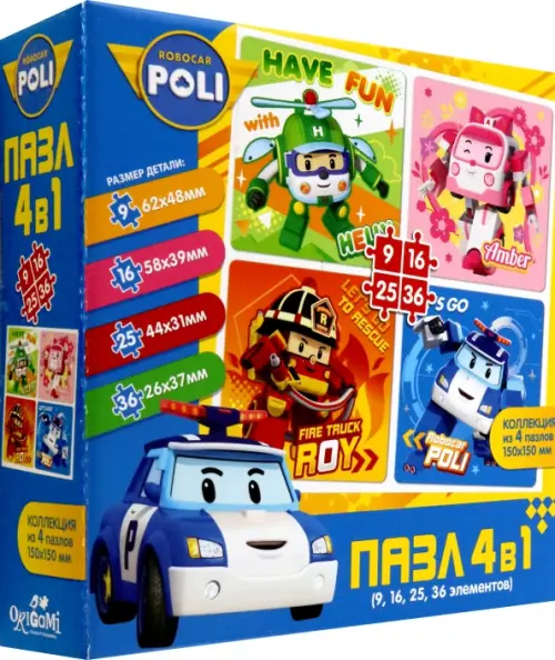 Набор пазлов 4в1 "Вместе веселей" - это комплект пазлов с разной элементностью, включающий в себя головоломки из 9, 16, 25, 36 элементов, объединенных общей тематикой. Это необычная коллекция картинок с изображением любимых персонажей серии Robocar Poli, которая понравится любому ребенку. Соберите всю коллекцию и окунитесь в новое приключение вместе с известными героями. Постепенно усложняя сборку пазла от 9 элементов до 36 элементов, ребенок научится внимательности, концентрации, а также сможет развить мелкую моторику.