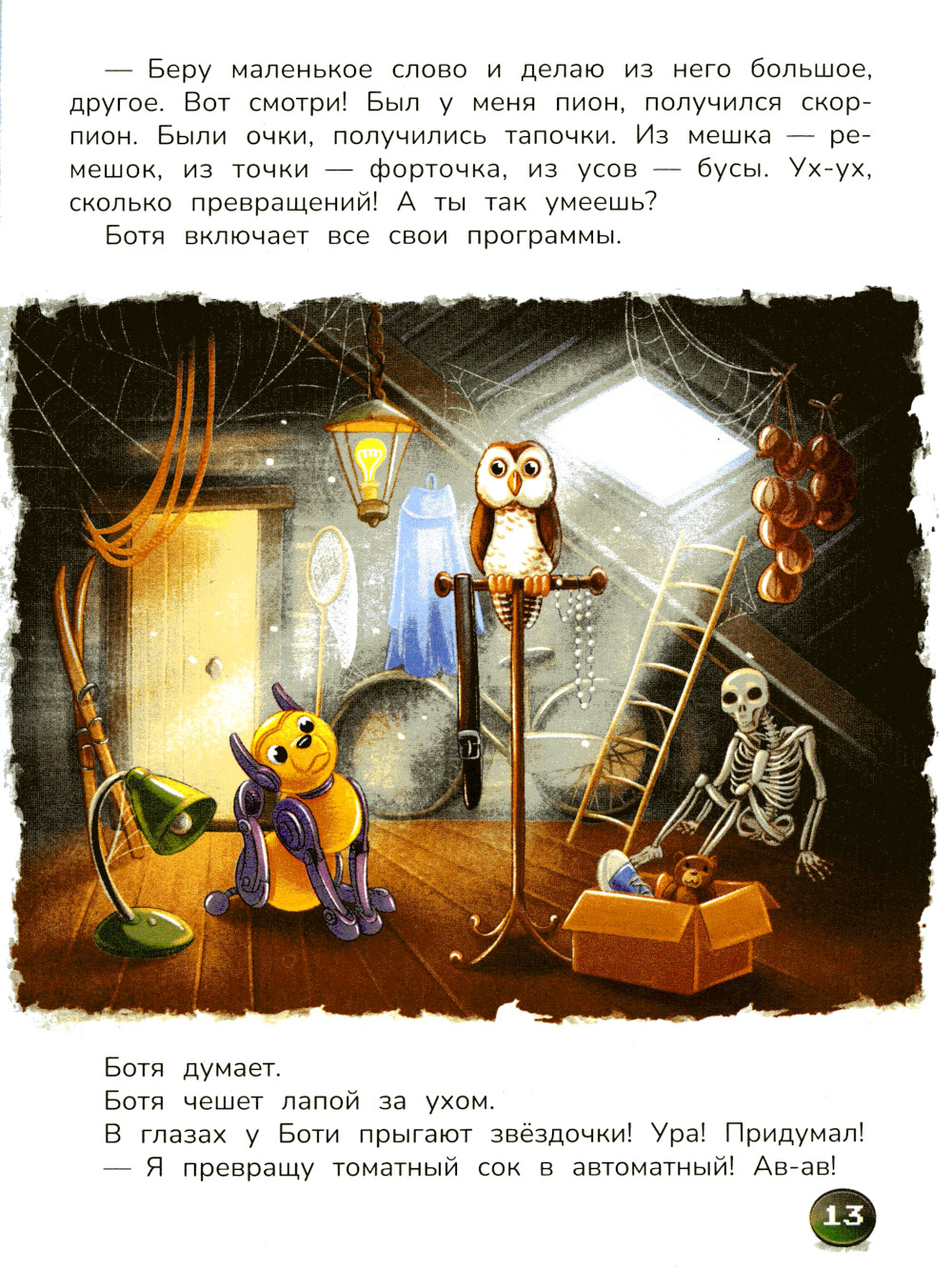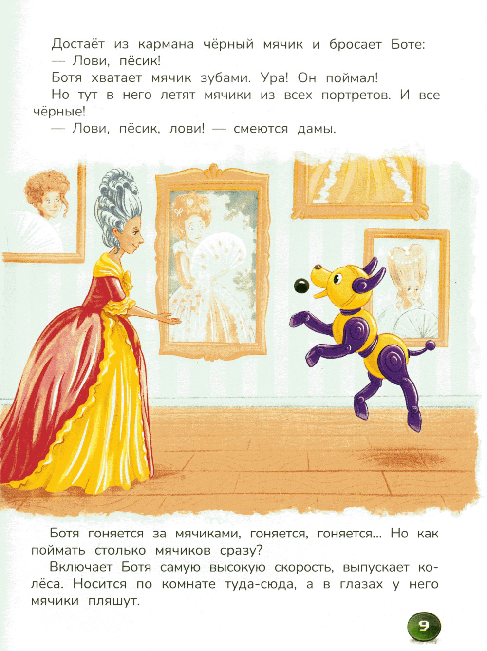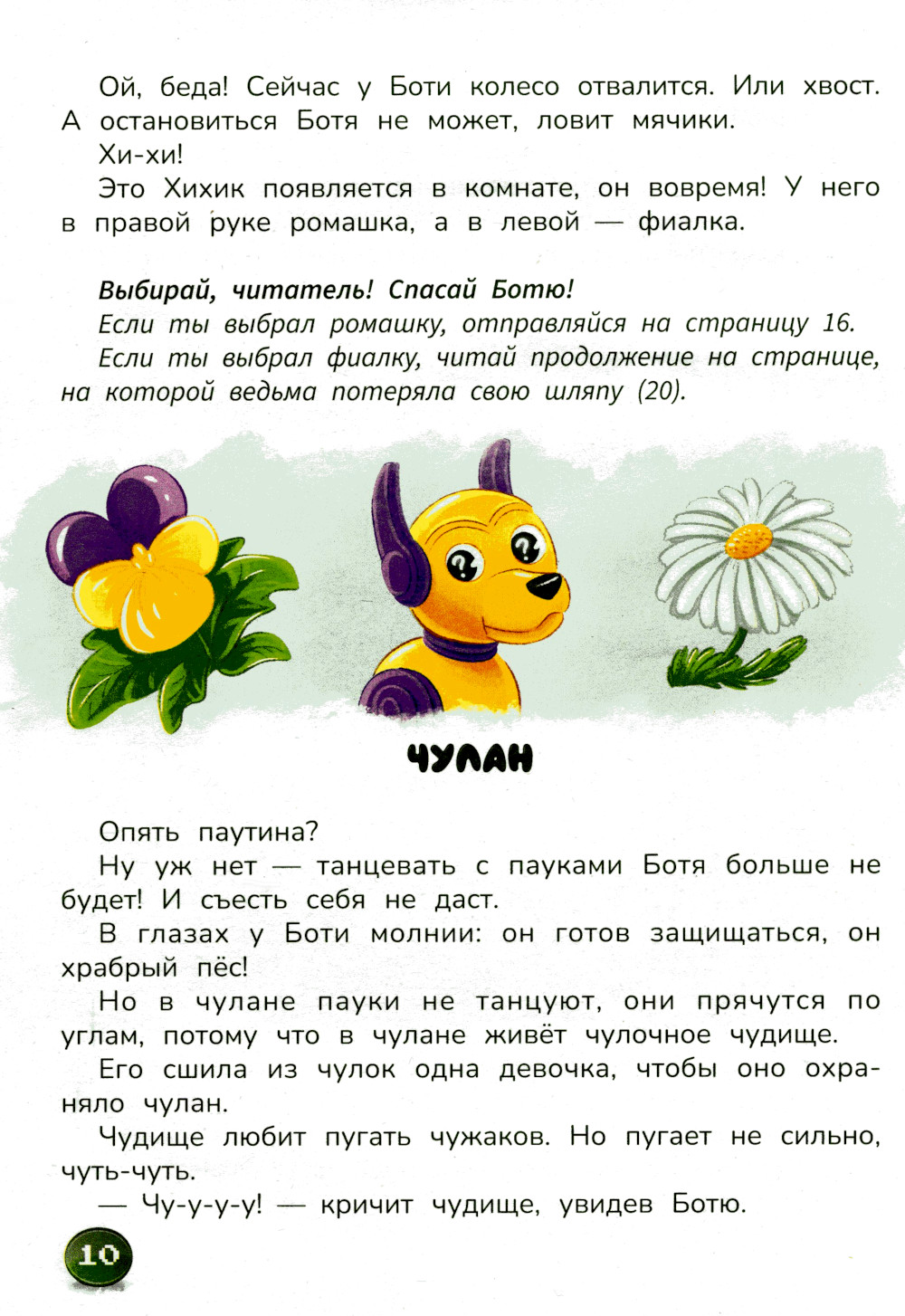 Помоги робопсу Боте найти своего хозяина! Вместе с ним ты попадёшь в таинственный замок, полный загадок. В каждой комнате вас ждут разные приключения и разные герои, в зависимости оттого, какой вариант ты выберешь для Боти. Только пройдя через все эти комнаты, Ботя встретится с хозяином. А помогает псу доброе привидение - старик Хихик. В конце есть четыре варианта финала и четыре разных хозяина у Боти.| Издательство | Феникс |