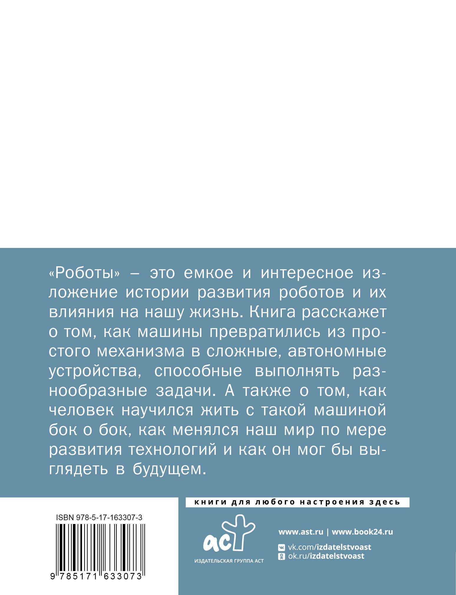 "Роботы" - это емкое и интересное изложение истории развития роботов и их влияния на нашу жизнь. Книга рассказывает о том, как машины превратились из простой механической техники в сложные, автономные устройства, способные выполнять разнообразные задачи. А также о том, как человек учился жить с машиной бок о бок и как менялось его отношение к механическим помощникам. Читатель увидит, как роботехника проникает в наши дома, заводы, медицинские учреждения и военные объекты, открывая новые возможности и преодолевая человеческие способности. Книга также поднимает вопросы о будущем роботехники и возможных последствиях её развития для общества и человечества в целом. Для тех, кто заинтересован в истории технологий, "Роботы" - это увлекательная мини-энциклопедия, которая открывает новые горизонты для восприятия технологического прогресса и влияния машин на нашу жизнь.| Издательство | Издательство "АСТ" |