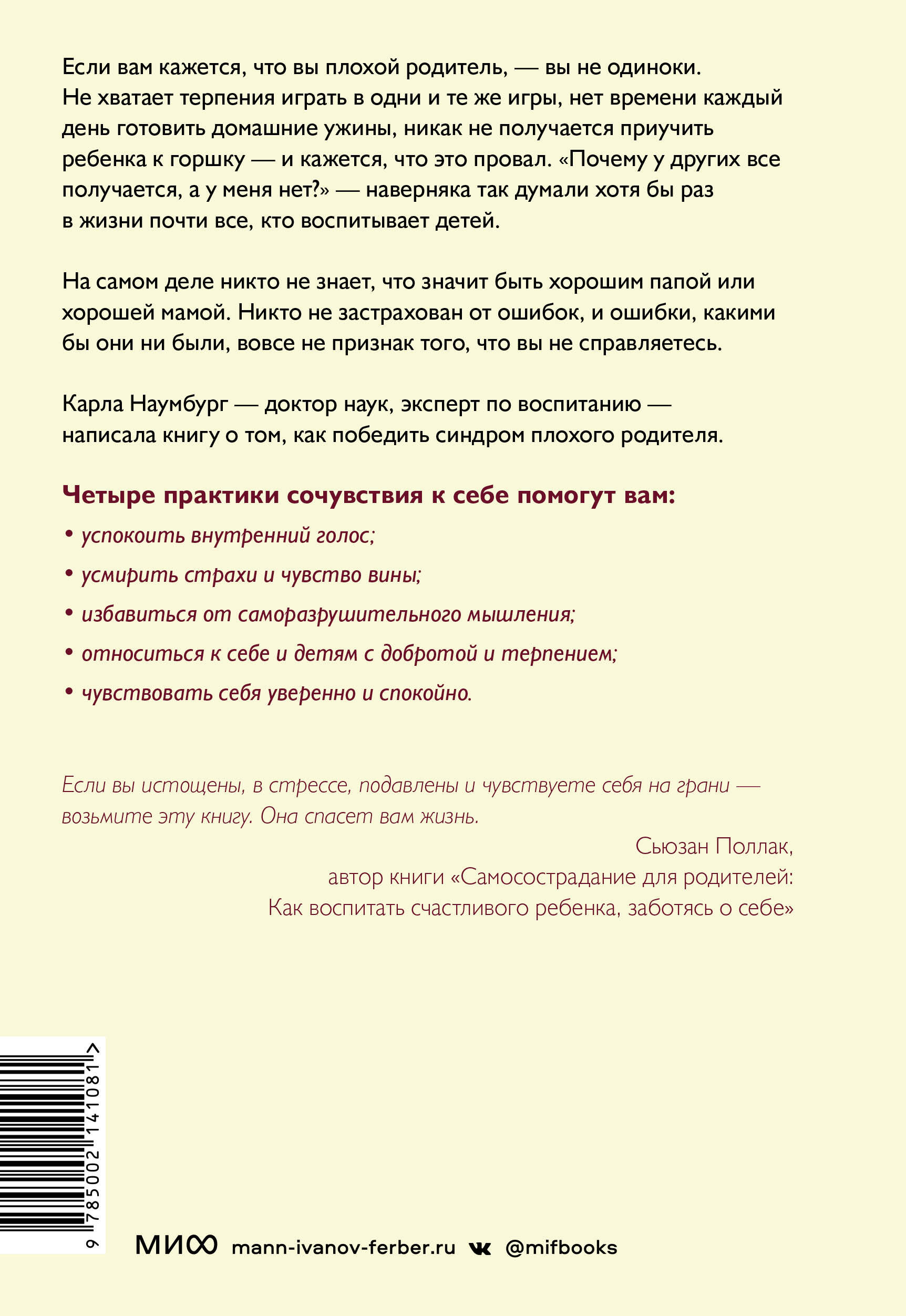 Яркая, интересная и наполненная добротой книга от автора международного бестселлера "Как перестать срываться на детей", которая поддержит родителя и поможет ему поверить в свои силы. Если вам кажется, что вы плохой родитель, - вы не одиноки. Не хватает терпения играть в одни и те же игры, нет времени каждый день готовить домашние ужины, никак не получается приучить ребенка к горшку - и кажется, что это провал. "Почему у других все получается, а у меня нет?" - наверняка так думали хотя бы раз в жизни почти все, кто воспитывает детей. На самом деле никто не знает, что значит быть хорошим папой или хорошей мамой. Никто не застрахован от ошибок, и ошибки, какими бы они ни были, вовсе не признак того, что вы не справляетесь. Карла Наумбург - доктор наук, эксперт по воспитанию - написала книгу о том, как победить синдром плохого родителя. Эта книга поможет родителям перестать испытывать чувство вины и думать, что они не справляются со своими обязанностями. Автор предлагает простую, но жизненно важную практику сочувствия к себе, которая поможет: - мыслить ясно; - преодолевать сложные эмоции; - укрепить отношения с детьми; - успокоить внутренний голос; - усмирить страхи и чувство вины; - избавиться от саморазрушительного мышления; - относиться к себе и детям с добротой и терпением; - чувствовать себя уверенно и спокойно. Истории из жизни автора и ее пациентов делают книгу доступной и понятной для читателя. Для кого эта книга: Книга будет полезна всем родителям, независимо от того, сколько у них детей и какого они возраста.| Издательство | МАНН, ИВАНОВ И ФЕРБЕР ООО |