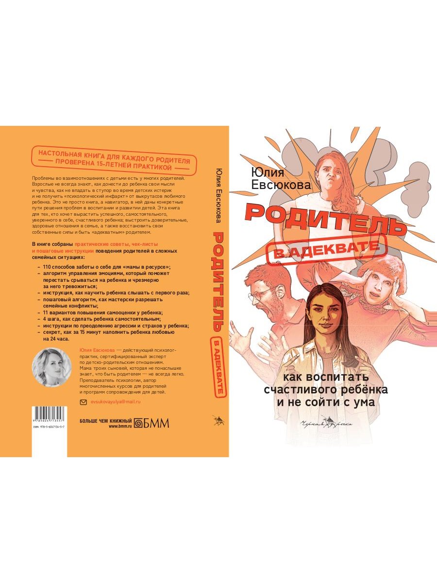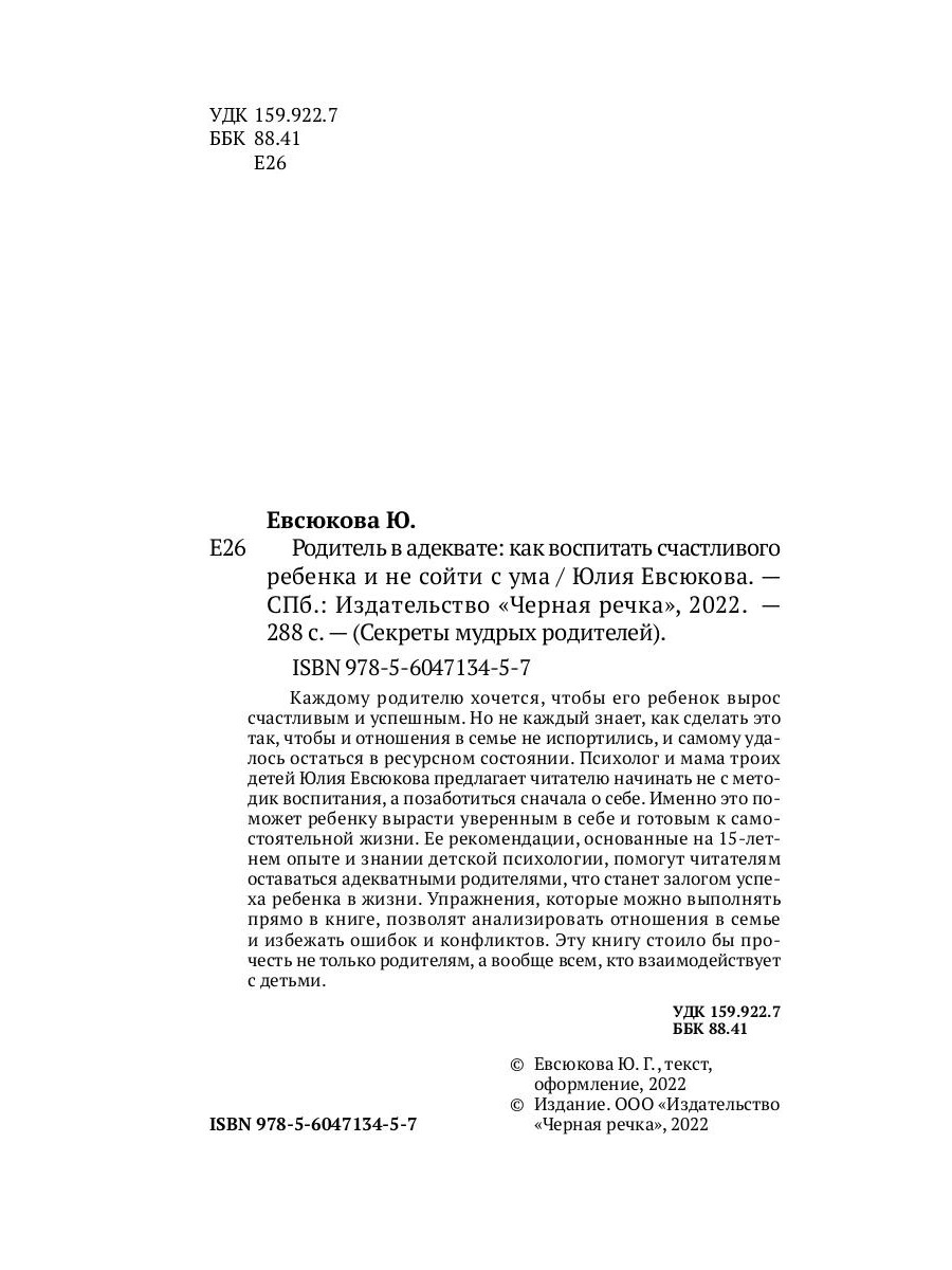 Каждому родителю хочется, чтобы его ребенок вырос счастливым и успешным. Но не каждый знает, как сделать это так, чтобы и отношения в семье не испортились, и самому удалось остаться в ресурсном состоянии. Психолог и мама троих детей Юлия Евсюкова предлагает читателю начинать не с методик воспитания, а позаботиться сначала о себе. Именно это поможет ребенку вырасти уверенным в себе и готовым к самостоятельной жизни. Ее рекомендации, основанные на 15-летнем опыте и знании детской психологии, помогут читателям оставаться адекватными родителями, что станет залогом успеха ребенка в жизни. Упражнения, которые можно выполнять прямо в книге, позволят анализировать отношения в семье и избежать ошибок и конфликтов. Эту книгу стоило бы прочесть не только родителям, а вообще всем, кто взаимодействует с детьми.| Издательство | Черная речка |