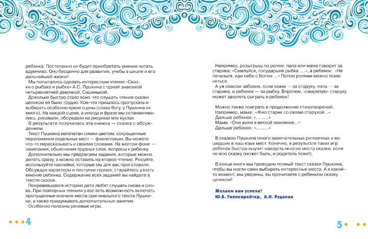 Чтение сказок детям - давняя замечательная традиция в наших семьях. Сказки полезно не только читать, но и обсуждать с ребенком. Их можно пересказывать своими словами, разыгрывать сцены, объяснять характеры героев. Опыт такого разнообразного «общения» с одной из самых любимых сказок А.С. Пушкина, «Сказкой о рыбаке и рыбке», вы найдете в этой книге. Вам встретятся замечания, объяснения трудных слов, вопросы и задания для вашего ребенка. В книге можно рисовать и использовать специальные наклейки, которые вы тоже найдете внутри.