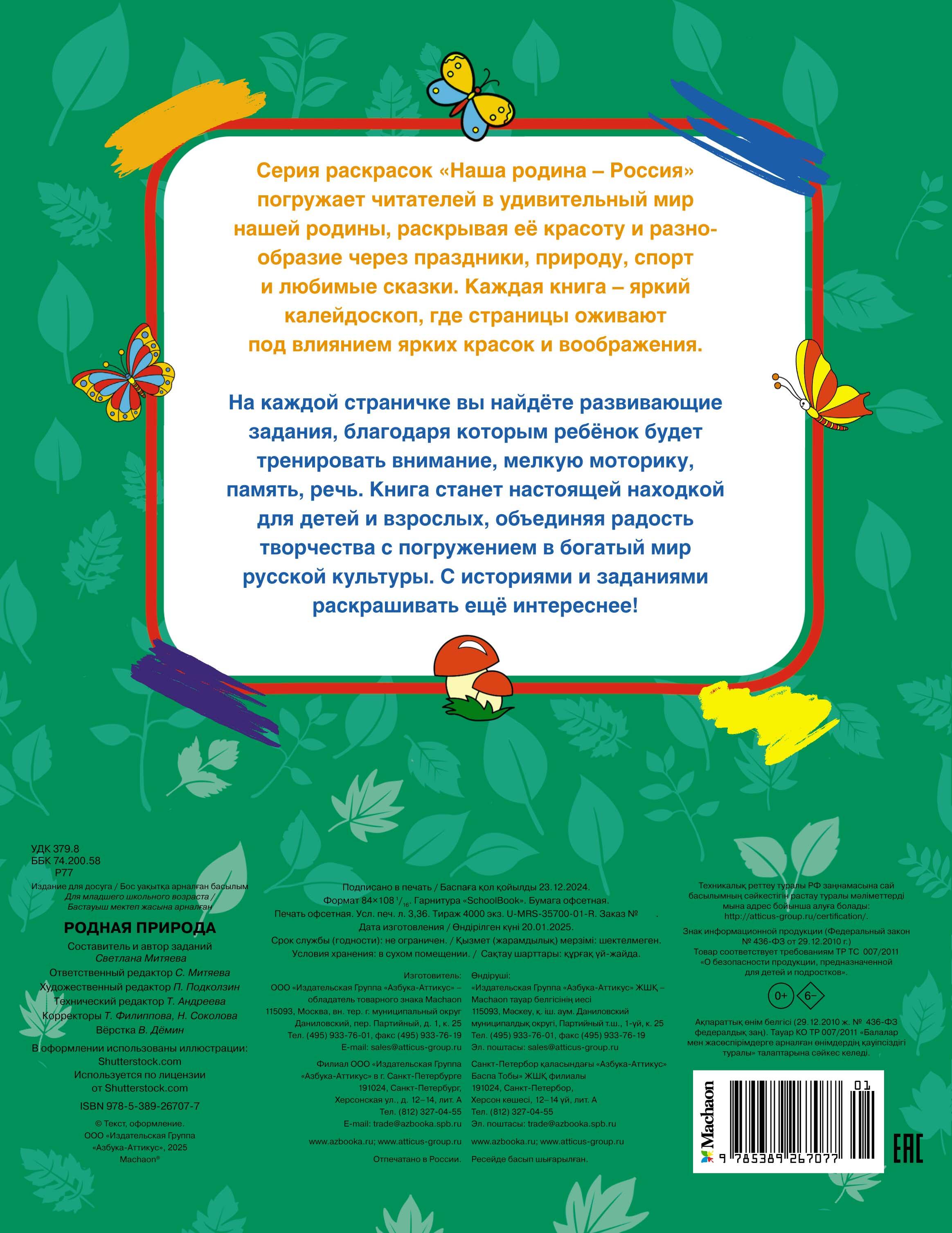 Эта раскраска - не просто развивающая книга, а целая вселенная для открытия и изучения! Она погрузит читателей в удивительный мир нашей родины, раскрывая ее красоту и разнообразие. Вы познакомитесь с животными, обитающими в нашей стране, а также с растениями, которые нас окружают. А еще она включает интересные задания: лабиринты, поиск отличий и составление слов из букв, что делает её уникальным инструментом для развития мышления. Рисование, соединение точек по числам и обводка рисунков по точкам помогают укреплять мелкую моторику, что в дальнейшем улучшает навыки письма. Прекрасная возможность провести время с ребенком: раскрашивайте, обсуждайте увлекательные факты и выполняйте задания. Откройте дверь в захватывающий мир родной природы!| Издательство | Издательство АЗБУКА ООО |