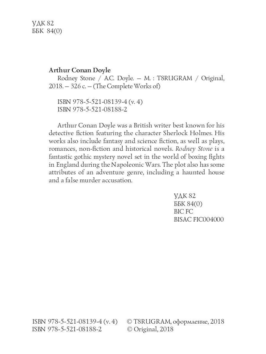 Arthur Conan Doyle was a British writer best known for his detective fiction featuring the character Sherlock Holmes. His works also include fantasy and science fiction, as well as plays, romances, non-fiction and historical novels. Rodney Stone is a fantastic gothic mystery novel set in the world of boxing fights in England during the Napoleonic Wars. The plot also has some attributes of an adventure genre, including a haunted house and a false murder accusation.| Издательство | Т8 RUGRAM |