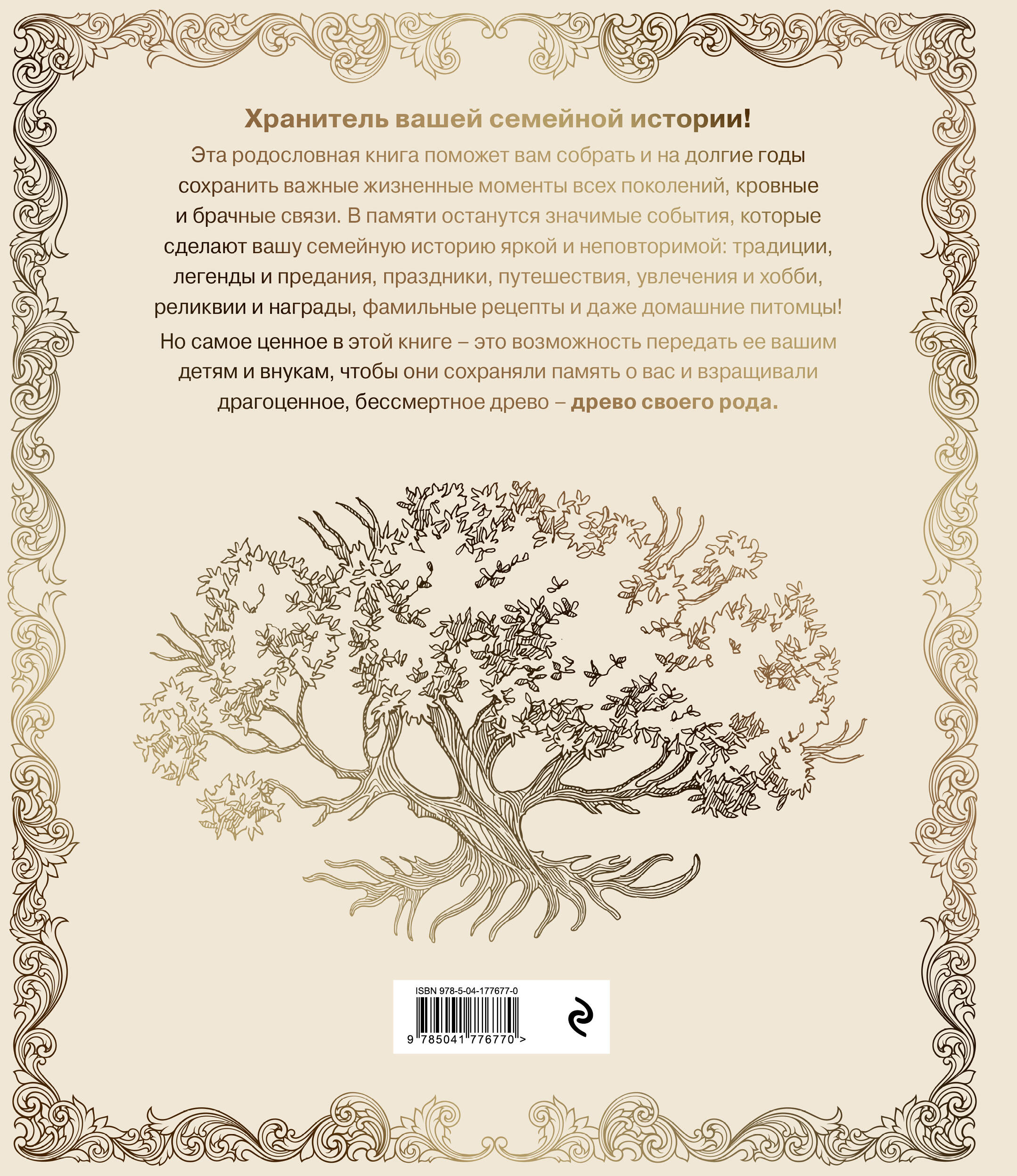Перед вами - родословная книга, которая может стать настоящей реликвией вашей семьи. Из тех, которые хранят десятилетиями, а то и веками, с особенным волнением и уважением. Эта книга поможет вам собрать воедино и систематизировать историю вашей семьи. Она надежно сохранит информацию о родоначальнике и истоках вашего рода, важных жизненных вехах его представителей, сведения о занятиях и образе жизни поколений, бесценные фотографии. Останутся в памяти и другие вещи, которые сделают вашу семейную историю яркой и неповторимой: традиции, легенды и предания, праздники, путешествия, увлечения и хобби, реликвии и награды, фамильные рецепты и даже домашние питомцы. Но самое ценное в этой книге - это возможность передать ее своим детям и внукам, чтобы они продолжили взращивать драгоценное, бессмертное древо своего рода.| Издательство | ООО "Издательство "Эксмо" |