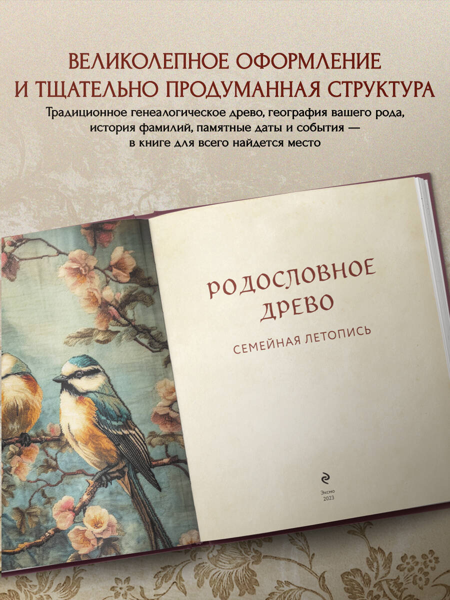 Уникальная родословная книга, которая не только поможет восстановить и бережно сохранить историю вашей семьи, но и создаст полный портрет ее нынешнего поколения, живущего в настоящем! Традиционное генеалогическое древо, география вашего рода, история фамилий, памятные даты и события - для всего найдется место на ее красивых страницах. А еще свой след оставят ваши родные и близкие, по крупицам восстанавливая и фиксируя каждую черточку, присущую вашей семье! Фамильные рецепты и поговорки, портреты любимых питомцев, самые яркие путешествия, совместные праздники - обо всем этом узнают ваши внуки и правнуки, листая эту роскошную книгу. Гаджеты устареют, а память о вас останется! Летопись вашего рода будет продолжаться. А это значит, уже сейчас стоит позаботится о ее красоте и сохранности на долгие годы. В этой книге будет жить именно ваша история!
