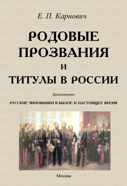 Содержание: Родовые прозвания в россии, Титулы в России, Титулы царствующего дома, Почетные дворянские титулы, Княжеские титулы в России, Графские титулы, Титулы светлости и сиятельства, Баронский титул, Слияние иноземцев с русскими, Русские чиновники в былое и настоящее время. Евгений Петрович Карнович (1823-1885) - русский писатель, историк, журналист. С 1860 года стали появляться в разных газетах и журналах многочисленные его статьи публицистические, юридические, исторические, критические и беллетристические. В последние годы Карнович занялся исключительно историей. Написал ряд исторических трудов, посвящённых истории России в XVII-XVIII веках.