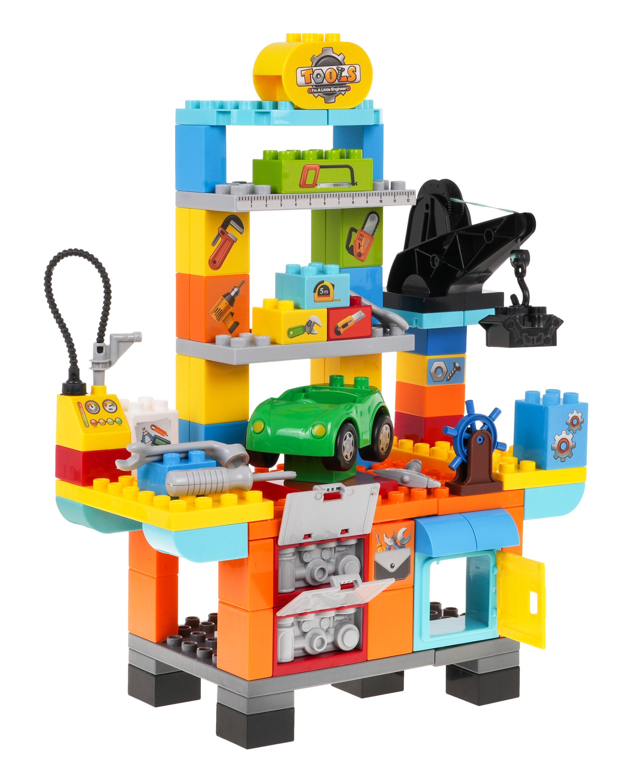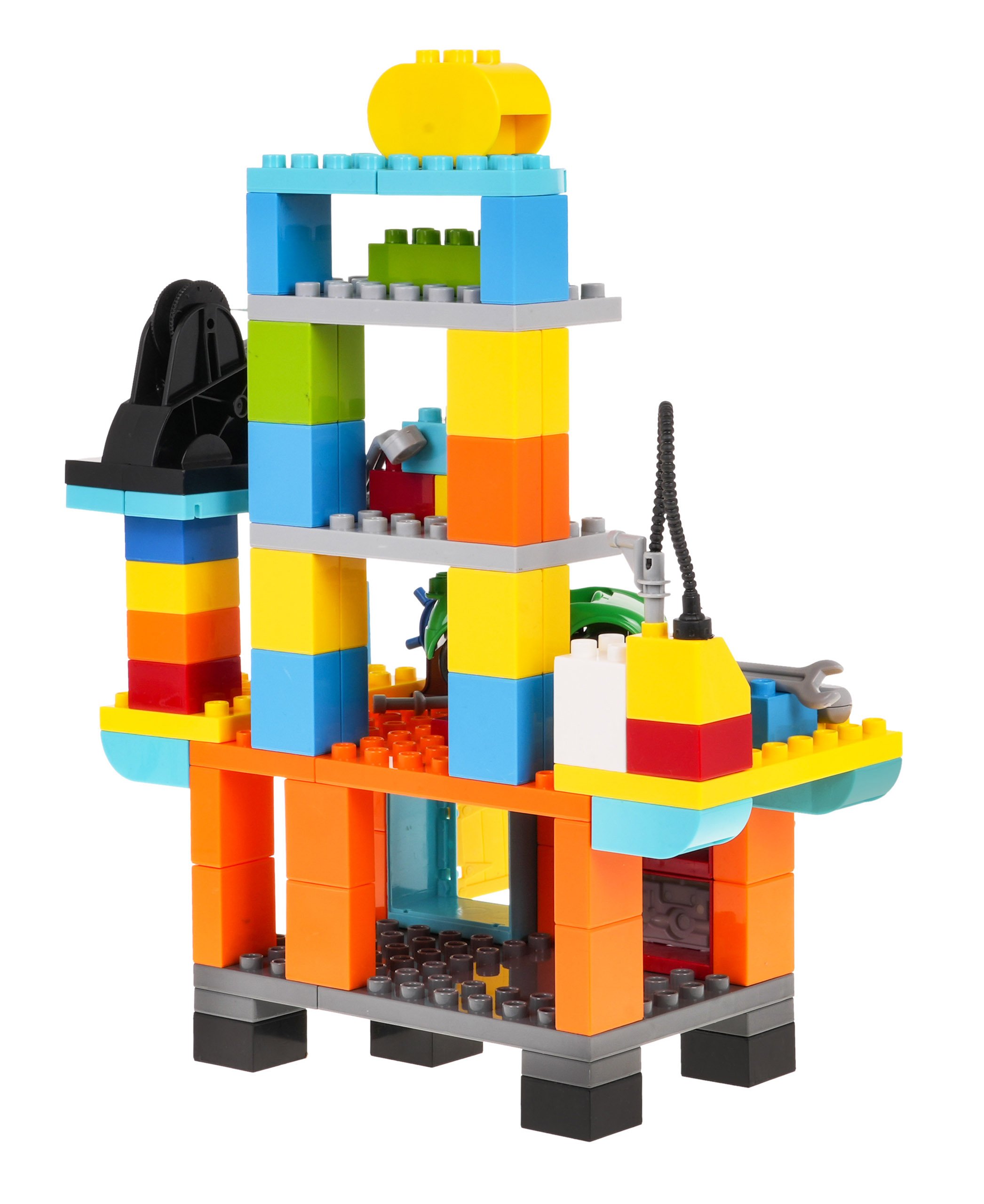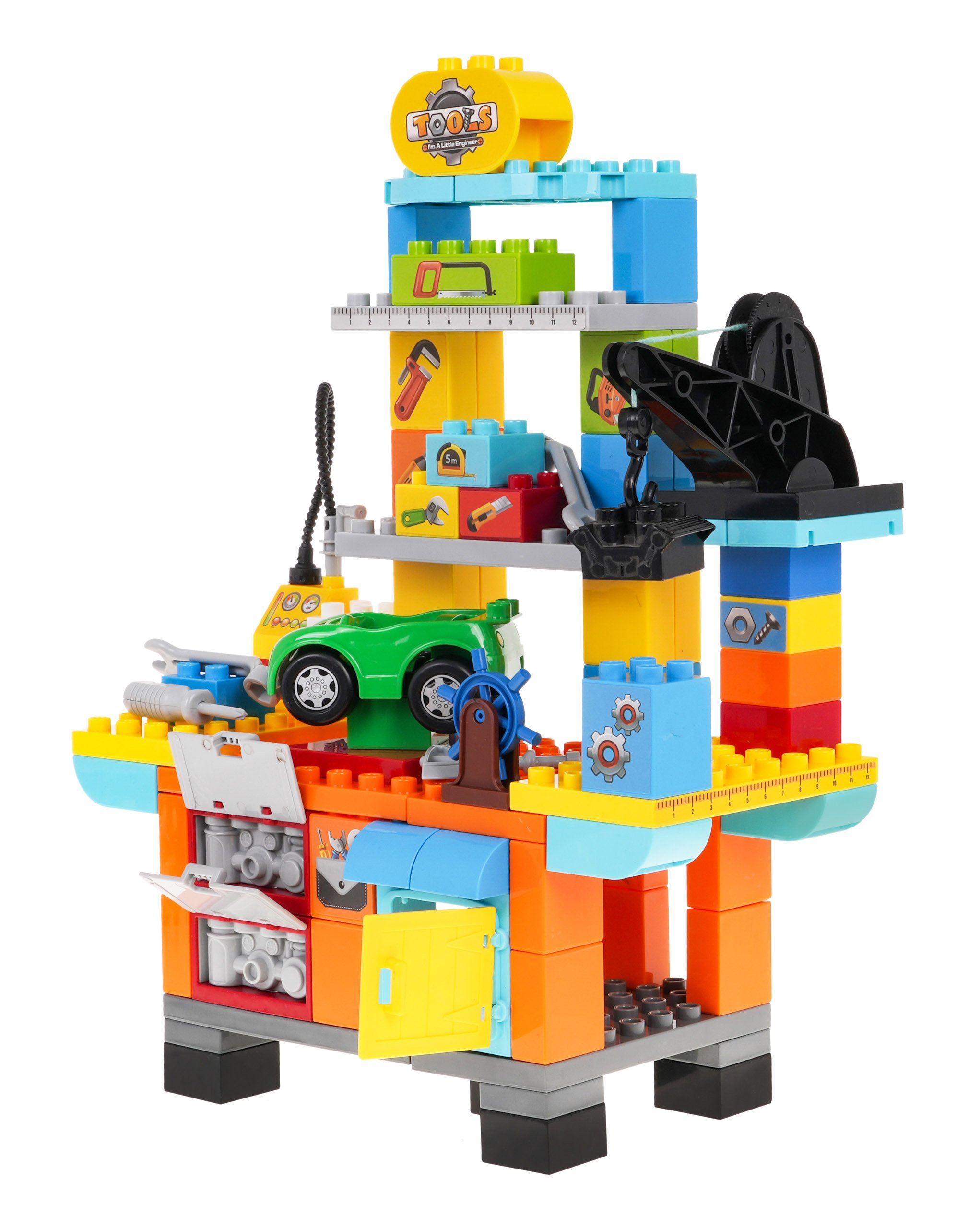 Набор строительных блоков для создания мастерской для детей от 3 лет. Блоки изготовлены из самых качественных материалов, они безопасны для детей и очень красочны. В мастерскую поместилась одна машинка, инструменты - отвертка, гаечный ключ, домкрат и даже машинка с пистолетом для накачивания колес воздухом. Весь набор состоит из 92 элементов. |
