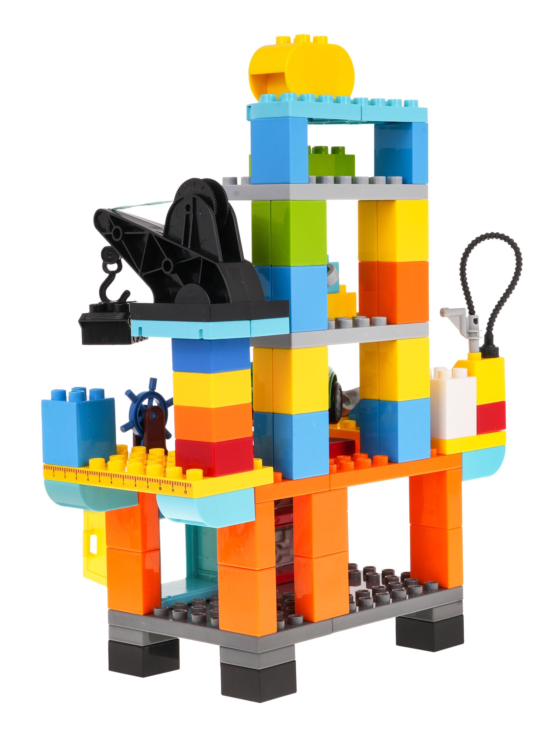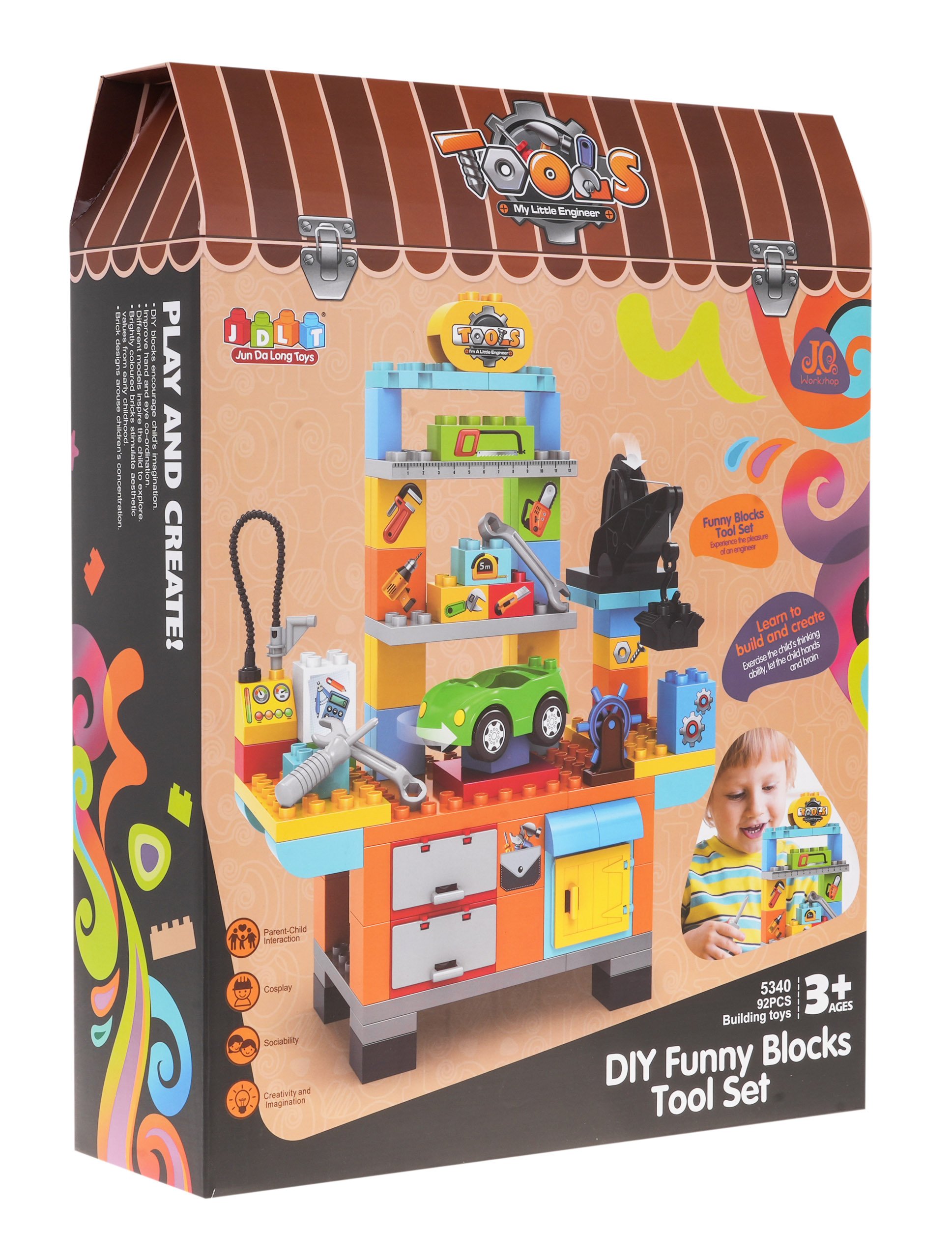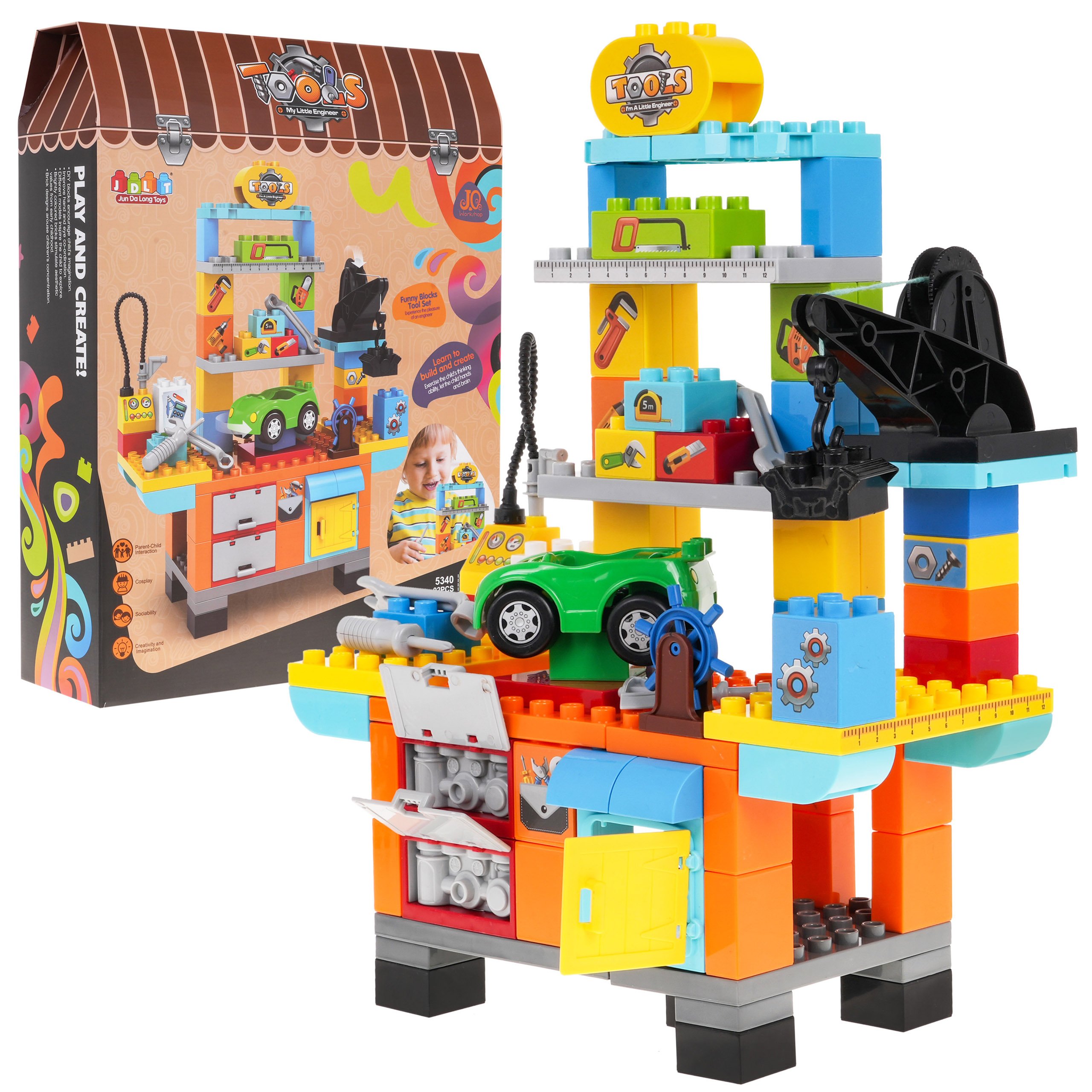 Набор строительных блоков для создания мастерской для детей от 3 лет. Блоки изготовлены из самых качественных материалов, они безопасны для детей и очень красочны. В мастерскую поместилась одна машинка, инструменты - отвертка, гаечный ключ, домкрат и даже машинка с пистолетом для накачивания колес воздухом. Весь набор состоит из 92 элементов. |