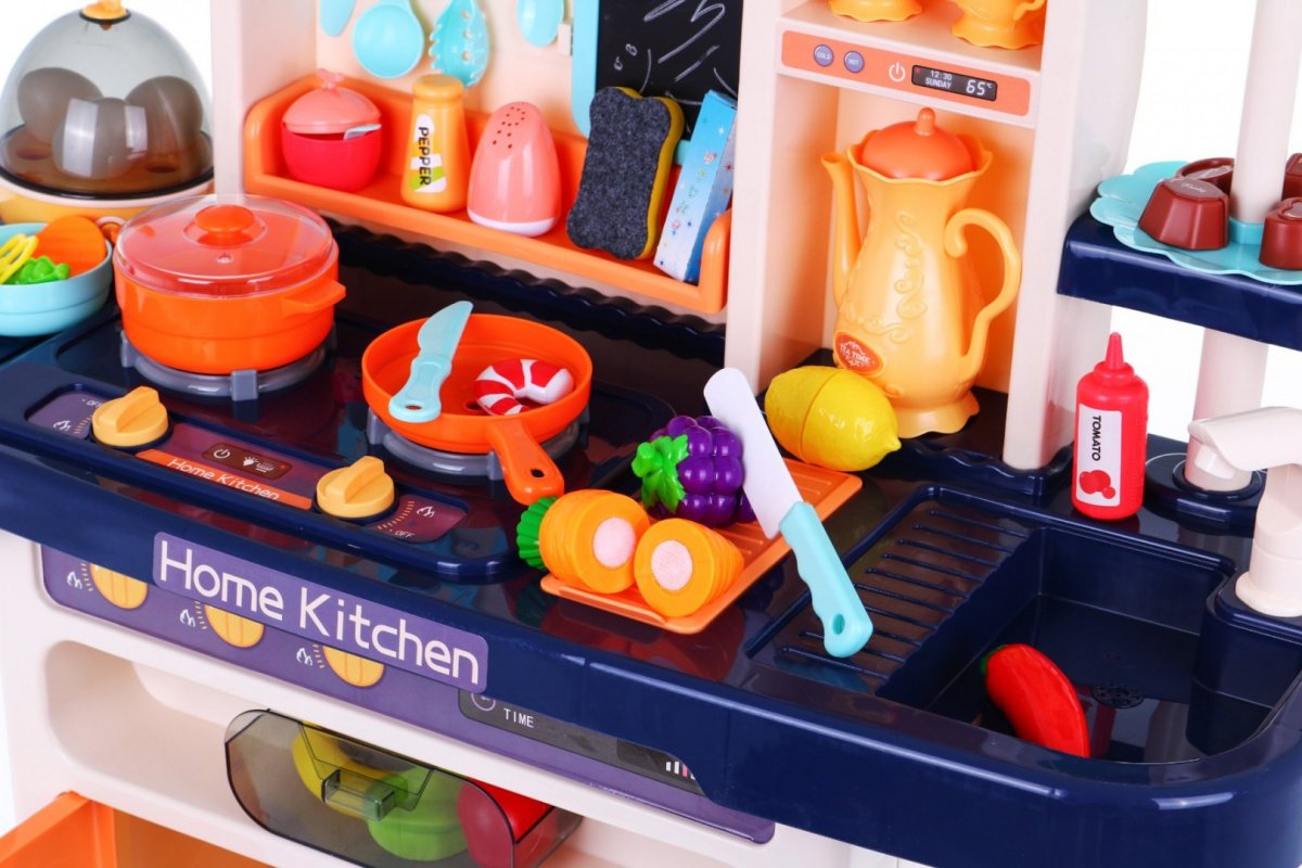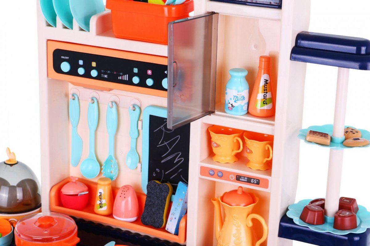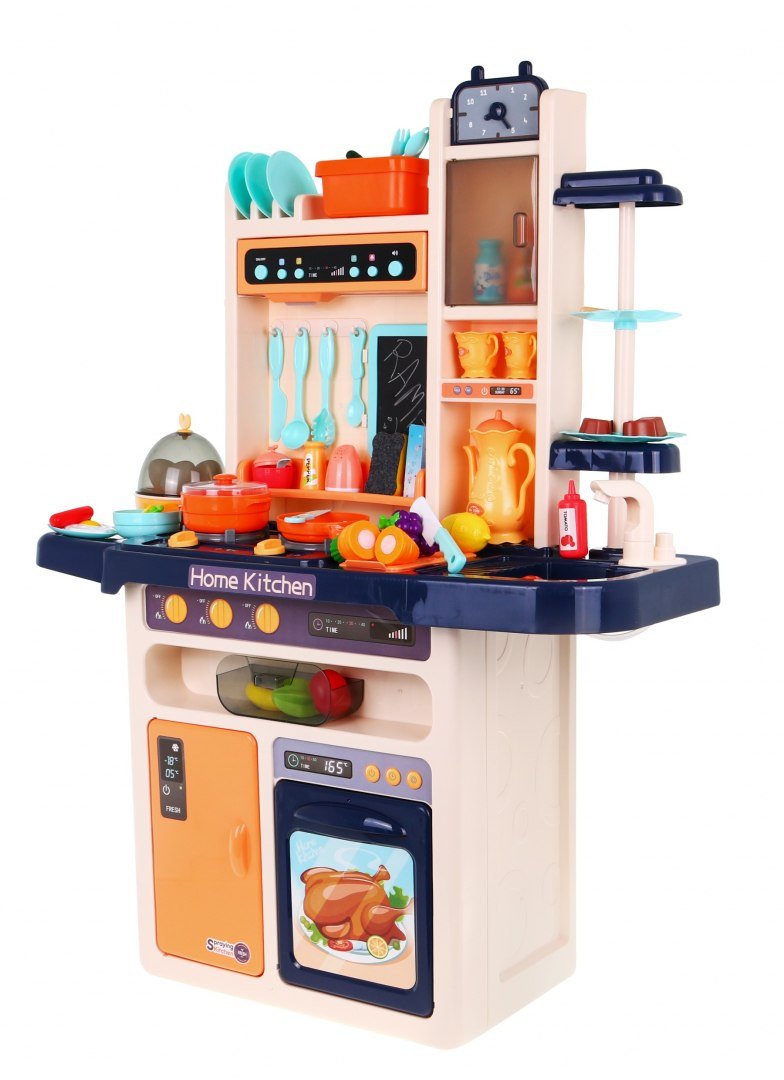| Великолепная, хорошо оборудованная, большая многофункциональная кухня. На кухне есть мойка с краном с водой, конфорки с подсветкой, звуками готовки и жарки, одна из конфорок имеет функцию генерации пара, подвижные ручки, вытяжка с лампой и музыкальная панель, открывающаяся духовка, открывающийся холодильник, часы, полки и многочисленные аксессуары. Кухонная посуда (65 элементов). Кухонные аксессуары включают мин. яйцеварку, которая «варит» яйца, издавая звуки, и доску с мелом и губкой. . Набор предназначен для детей от 3 лет и питается от 8 батареек типа АА, которые не входят в комплект. |