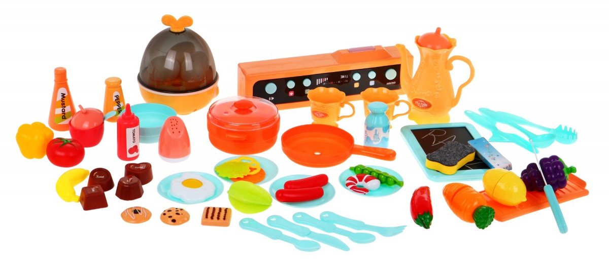| - большая кухня, - меловая доска, - мел, - губка, - яйцеварка со звуковыми и световыми эффектами, - часы с движущимися стрелками, - кастрюля с крышкой, - сковорода, - контейнер для кухонных принадлежностей, - миска, - сахарница, - чайник, - 2 чайные чашки, - солонка, - перечница, - томатный соус, - молоко, - горчица, - 4 шоколадные конфеты, - 3 печенья, - 4 тарелки, - овощи и фрукты с репой: виноград , перец, морковь, лимон - сосиски, 3 яйца, яичница, креветки, помидоры, огурцы, капуста, перец, банан, кусочек перца, кусочек моркови, лист салата, горошек, карамбола - 2 чайные ложки, - вилка , - 2 ножа, - половник, - дуршлаг, - лопаточка, - набор наклеек. |