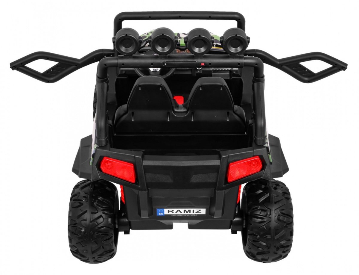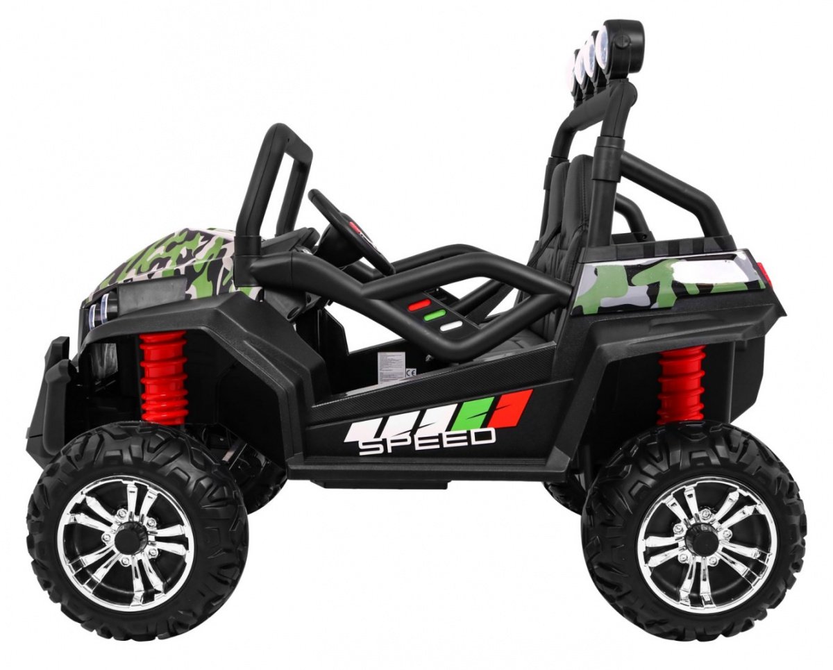Электромобиль RoGer Grand Buggy 4x4 STRONG LIFT - полностью оборудованная, практичная и безопасная внедорожная модель для детей. Он идеально подходит для езды по пересеченной местности, поскольку имеет большие колеса из мягкой пены EVA. Амортизаторы на задних колесах и удобное сиденье из вентилируемой эко-кожи для комфортной езды вашего ребенка. Он оснащен четырьмя мощными двигателями мощностью 45 Вт и мощным аккумулятором 24 В/5 Ач. Автомобиль изготовлен из прочного пластика премиум-класса и оснащен светодиодными фонарями спереди.