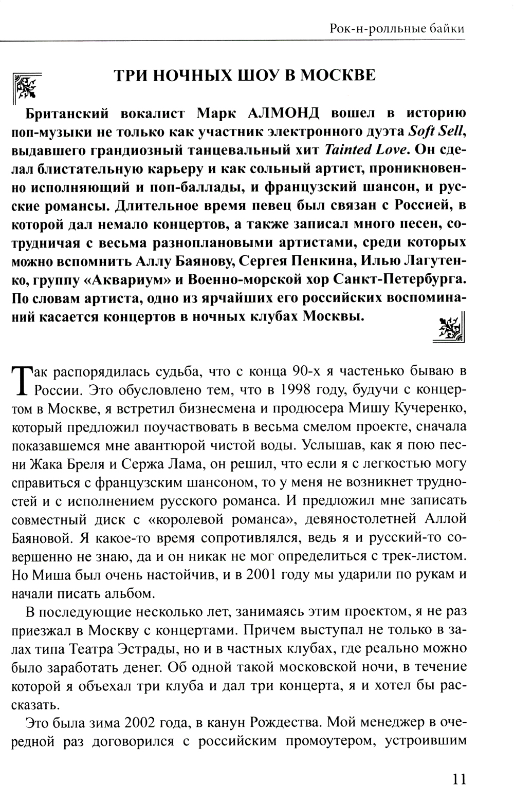 Истории о различных музыкальных событиях, рассказанных автору представителями шоу-бизнеса в течение eго многолетней журналистской работы. В их числе и забавные, и познавательные, и поучительные, но все они четко отражают современный музыкальный ландшафт - каковым он был в прошлом веке, и каким стал в наше непростое для творческих изысков время. Автор выступил также в роли фотографа, сделавшего портреты поделившихся своими историями рассказчиков. Книга предназначена для широкого круга читателей.| Издательство | Rock-ExPress.ru |