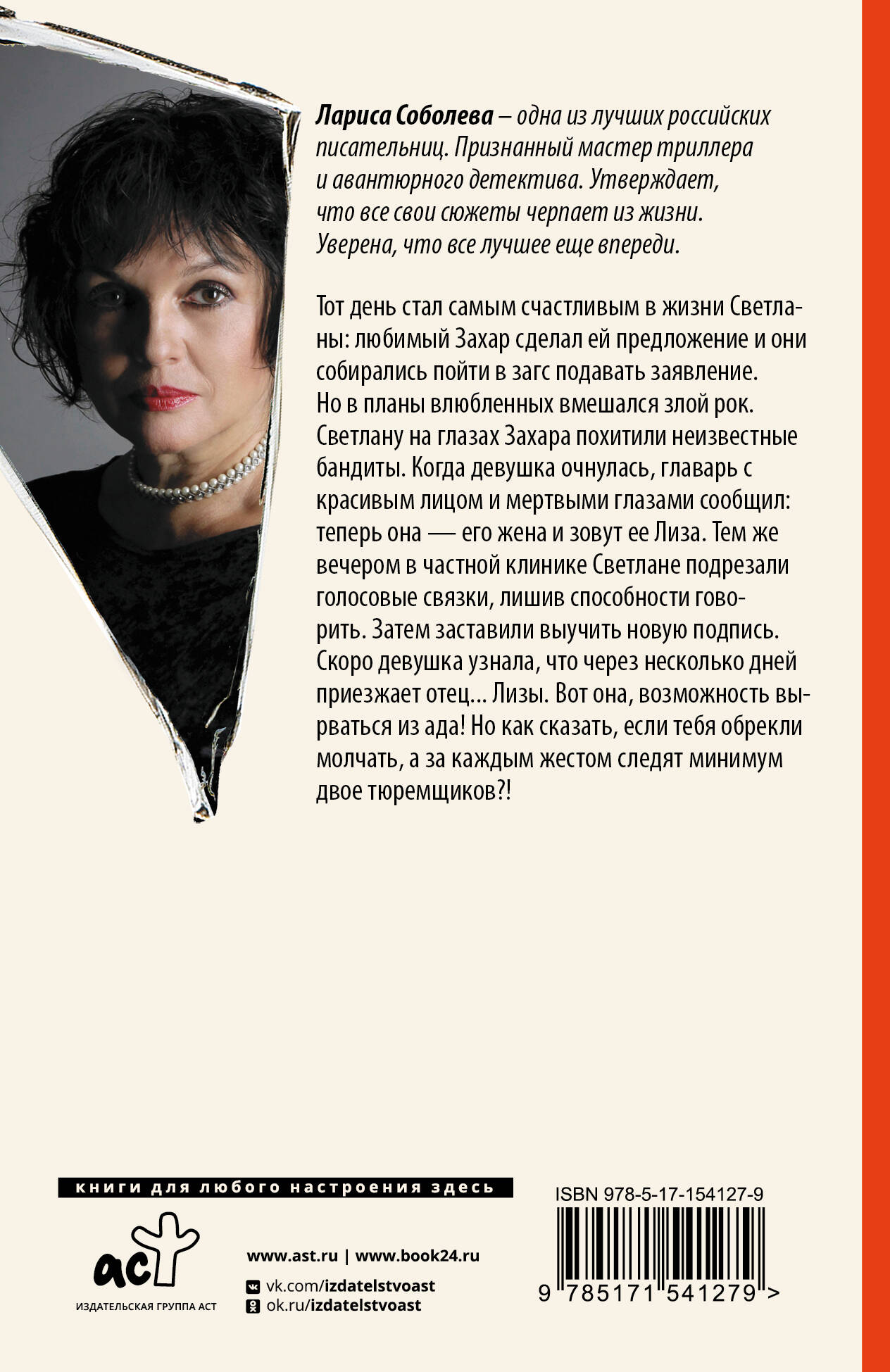 Тот день стал самым счастливым в жизни Светланы: любимый Захар сделал ей предложение и они собирались пойти в загс подавать заявление. Но в планы влюбленных вмешался злой рок. Светлану на глазах Захара похитили неизвестные бандиты. Когда девушка очнулась, главарь с красивым лицом и мертвыми глазами сообщил: теперь она - его жена и зовут ее Лиза. Тем же вечером в частной клинике Светлане подрезали голосовые связки, лишив способности говорить. Затем заставили выучить новую подпись. Скоро девушка узнала, что через несколько дней приезжает отец… Лизы. Вот она, возможность вырваться из ада! Но как сказать, если тебя обрекли молчать, а за каждым жестом следят минимум двое тюремщиков?!| Издательство | ИЗДАТЕЛЬСТВО "АСТ" |