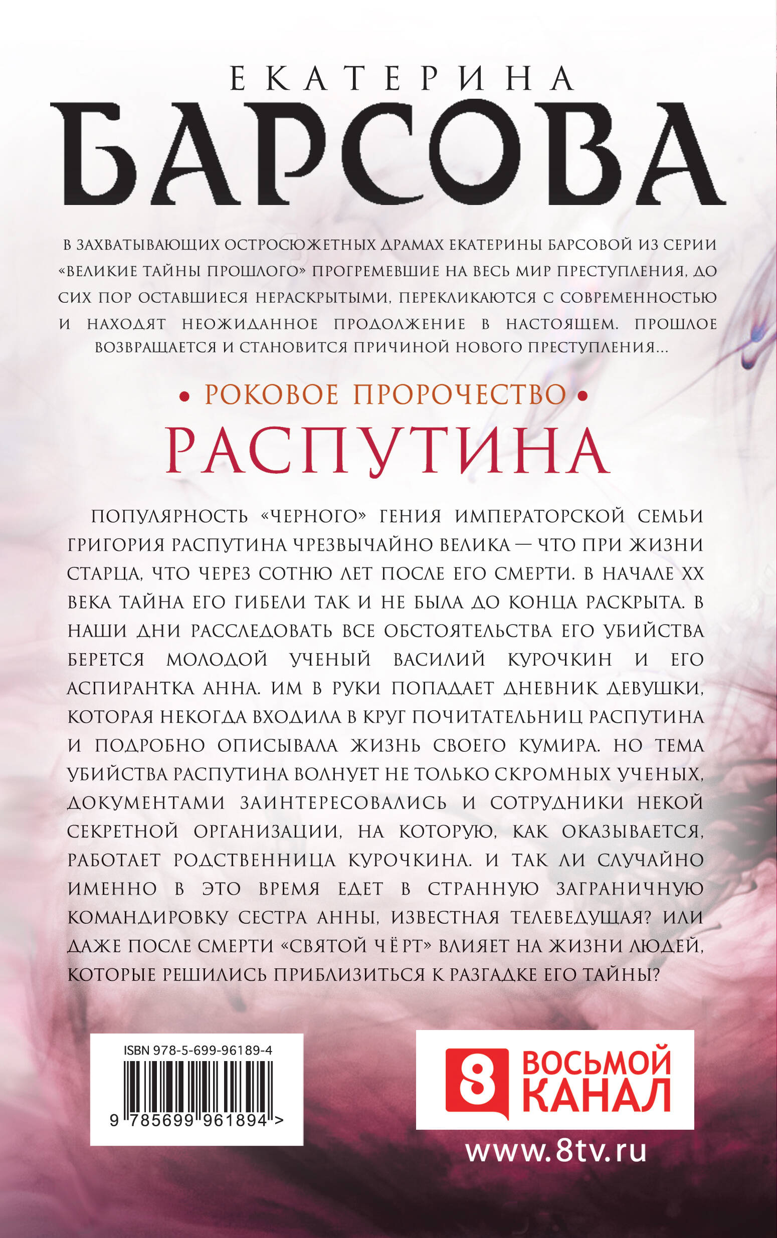 Жанр Остросюжетный исторический детектив. Особенности Громкое политическое убийство вековой давности обретает в романе актуальное звучание. Детективный сюжет разворачивается вокруг реальных исторических событий. В нем переплетаются судьбы людей из дореволюционной России и наших современников. Читателю предстоит вместе с героями приподнять завесу тайны, покрывающую жизнь и смерть одной из наиболее одиозных фигур начала ХХ века. О книге Убийство старца Григория Распутина, фаворита семьи последнего российского императора, наделало в свое время много шума, но так и осталось до конца не раскрытым. В наши дни найти разгадку, опираясь только на исторические факты и документы, берется молодой ученый Василий Курочкин. Неожиданно открывшиеся старинные записи становятся предметом интереса и некоей секретной организации, и бизнесмена, «повернутого» на фигуре Распутина. Жизни Курочкина и его аспирантки Анны Рыжиковой оказываются под угрозой, и спастись они смогут, только раньше других разгадав и обнародовав тайну старца. Об авторе Екатерина Барсова - автор в жанре остросюжетной литературы, уже известный российскому читателю. Действие ее исторических детективов протекает в двух временных пластах: громкие события прошлого находят неожиданный отклик в судьбах современных людей. Разгадка древней тайны собирается, как сложная мозаика, в которой для каждой детали нужно найти свое место.| Издательство | ООО "Издательство "Эксмо" |