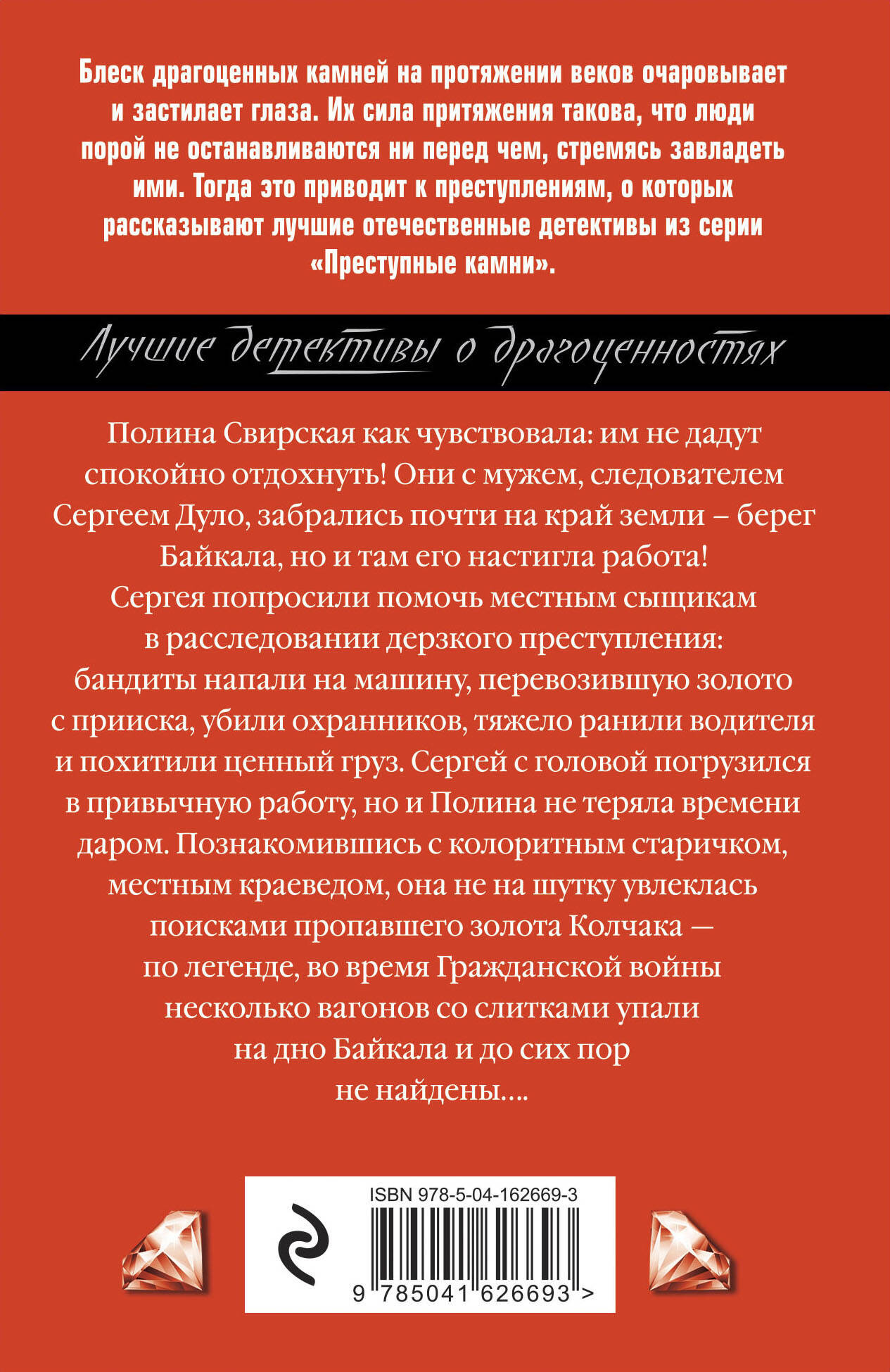 Полина Свирская как чувствовала: им не дадут спокойно отдохнуть! Они с мужем, следователем Сергеем Дуло, забрались почти на край земли - берег Байкала, но и там его настигла работа! Сергея попросили помочь местным сыщикам в расследовании дерзкого преступления: бандиты напали на машину, перевозившую золото с прииска, убили охранников, тяжело ранили водителя и похитили ценный груз. Сергей с головой погрузился в привычную работу, но и Полина не теряла времени даром. Познакомившись с колоритным старичком, местным краеведом, она не на шутку увлеклась поисками пропавшего золота Колчака - по легенде во время Гражданской войны несколько вагонов со слитками упали на дно Байкала и до сих пор не найдены… В остросюжетных романах Анны Князевой расследуются преступления, следы которых уводят в прошлое и позволяют пролить свет на его загадки. Вслед за героями вы отправитесь навстречу старинным тайнам и увлекательным приключениям!| Издательство | Эксмо |