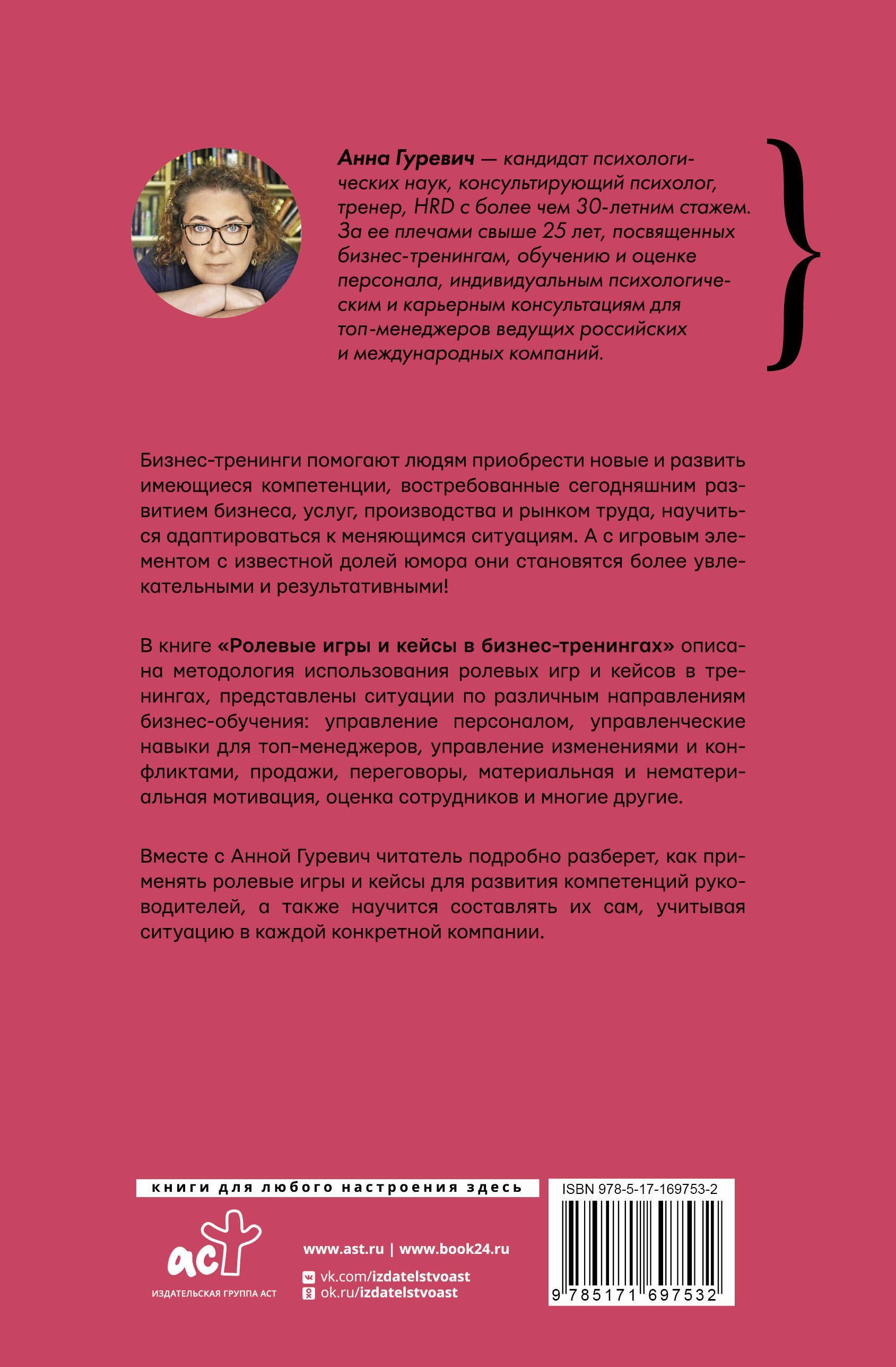 Анна Гуревич -- кандидат психологических, наук консультирующий психолог, тренер, HRD с более чем 30-летним стажем. За ее плечами свыше 25 лет, посвященных бизнес-тренингам, обучению и оценке персонала, индивидуальным психологическим и карьерным консультациям для топ-менеджеров ведущих российских и международных компаний. Бизнес-тренинги помогают людям приобрести новые и развить имеющиеся компетенции, востребованные сегодняшним развитием бизнеса, услуг, производства и рынком труда, научиться адаптироваться к меняющимся ситуациям. А с игровым элементом с известной долей юмора они становятся более увлекательными и результативными! В книге "Ролевые игры и кейсы в бизнес-тренингах" описана методология использования ролевых игр и кейсов в тренингах, представлены ситуации по различным направлениям бизнес-обучения: управление персоналом, управленческие навыки для топ-менеджеров, управление изменениями и конфликтами, продажи, переговоры, материальная и нематериальная мотивация, оценка сотрудников и многие другие. Вместе с Анной Гуревич читатель подробно разберет, как применять ролевые игры и кейсы для развития компетенций руководителей, а также научится составлять их сам, учитывая ситуацию в каждой конкретной компании.| Издательство | Издательство "АСТ" |