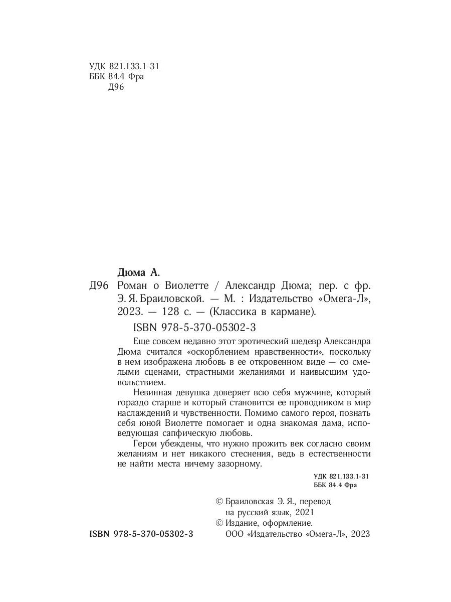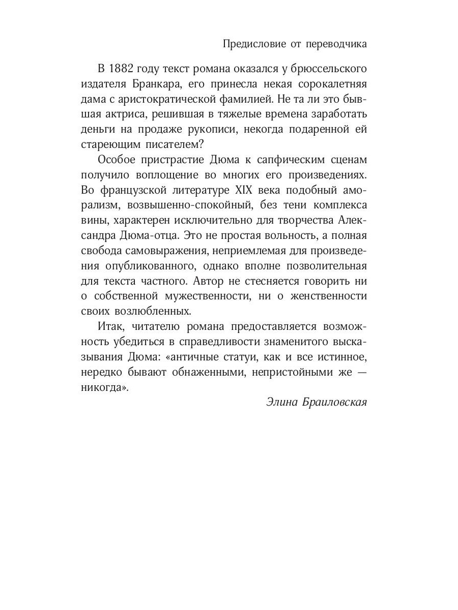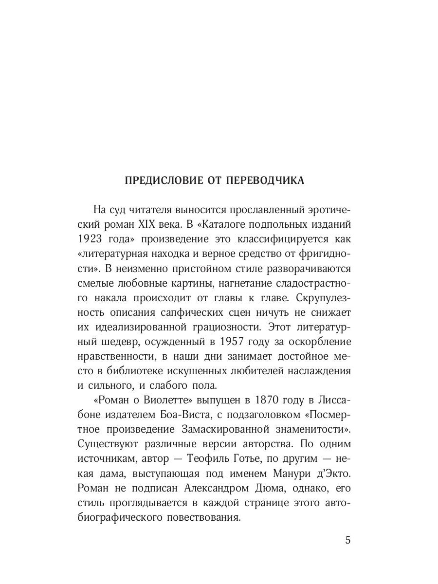 Еще совсем недавно этот эротический шедевр Александра Дюма считался "оскорблением нравственности", поскольку в нем изображена любовь в ее откровенном виде - со смелыми сценами, страстными желаниями и наивысшим удовольствием. Невинная девушка доверяет всю себя мужчине, который гораздо старше и который становится ее проводником в мир наслаждений и чувственности. Помимо самого героя, познать себя юной Виолетте помогает и одна знакомая дама, исповедующая сапфическую любовь. Герои убеждены, что нужно прожить век согласно своим желаниям и нет никакого стеснения, ведь в естественности не найти места ничему зазорному.| Издательство | Омега-Л |