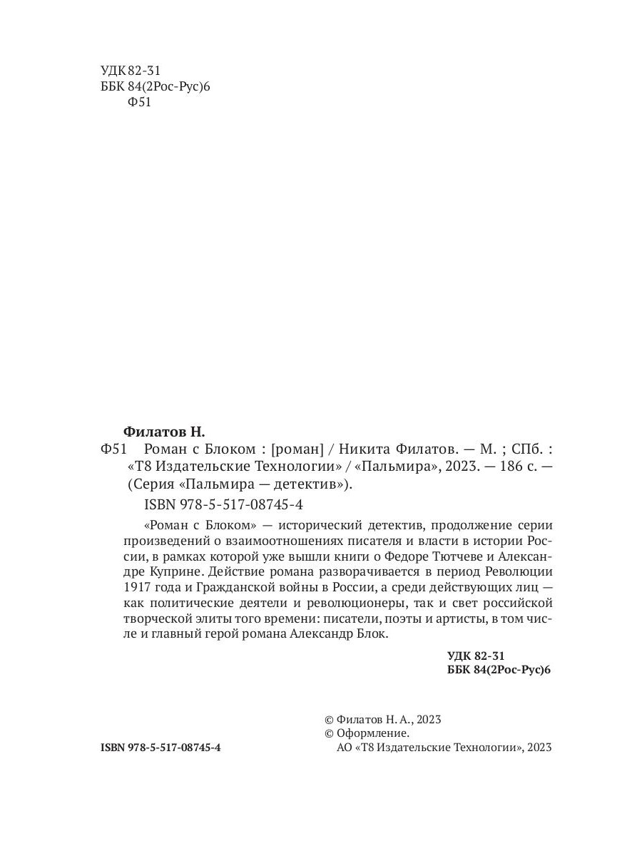 Никита Филатов (р.1961) - российский писатель и адвокат, в прошлом участник арктических экспедиций и оперативный работник МВД. Он автор более четырех десятков детективных произведений тиражом до миллиона экземпляров; его произведения переведены на несколько мировых языков и экранизированы в рамках нашумевшего сериала "Убойная сила". Член Международной ассоциации писателей детективного жанра (AIEP), основатель Петербургского детективного клуба, лауреат российских и международных литературных премий. "Роман с Блоком" - исторический детектив, продолжение серии произведений о взаимоотношениях писателя и власти в истории России, в рамках которой уже вышли книги о Федоре Тютчеве и Александре Куприне. Действие романа разворачивается в период Революции 1917 года и Гражданской войны в России, а среди действующих лиц как политические деятели и революционеры, так и свет российской творческой элиты того времени: писатели, поэты и артисты, в том числе и главный герой романа - Александр Блок.| Издательство | Т8 RUGRAM |