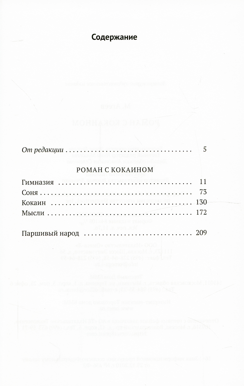 «Роман с кокаином» - история порочного юноши, исследующего мир в облаке кокаинового дурмана - одна из самых ярких и поэтичных книг русской эмиграции, вызвавшая немало споров, кривотолков и разногласий. Долгое время авторство романа приписывали Владимиру Набокову, настолько великолепно он был исполнен. Лишь спустя время выяснилось, что создателем произведений был другой талантливый прозаик - загадочный Марк Леви. В книгу также вошел рассказ «Паршивый народ». Впервые эти два произведения были опубликованы под псевдонимом М. Агеев в 1930-е годы в эмигрантской периодике Парижа.| Издательство | Омега-Л |