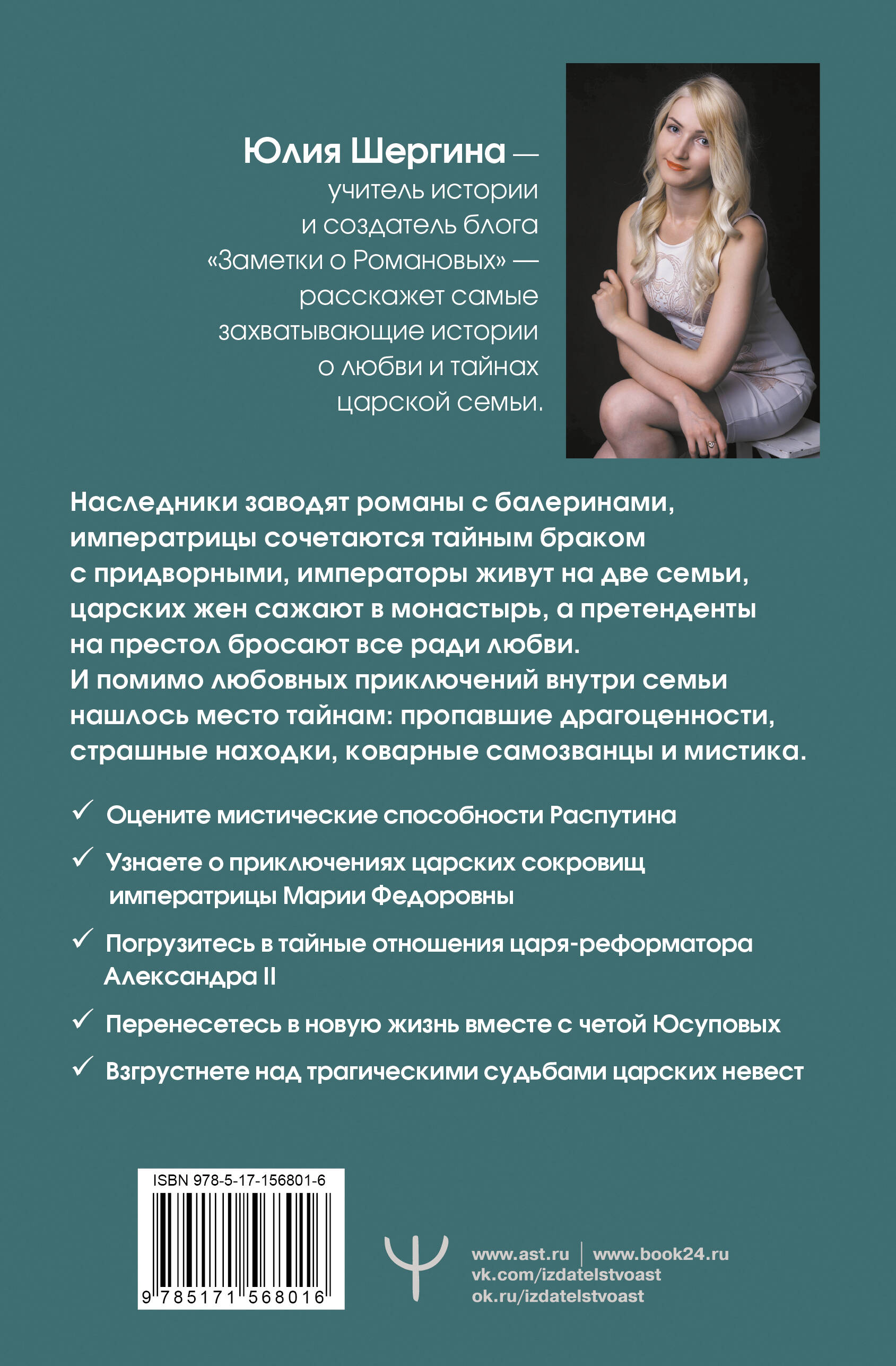 Книга Юлии Шергиной - учителя истории, создателя блога о царской семье "Заметки о Романовых" - сборник историй любви и интригах внутри царского дома от его основания до падения. • Самые захватывающие истории о любви и тайнах венценосного семейства под одной обложкой - лучше Нетфликса! • В книге использованы мемуары, воспоминания и переписка - яркие истории из уст самих участников и непосредственных свидетелей. • Цари и царицы, великие князья и княгини, императоры и императрицы - живые люди со своими страстями и особенными судьбами окажутся перед вами. • Автор нежно и бережно относится к своим героям, но не скрывает от нас их негативные стороны - вы сами решаете, кто герой, а кто злодей. • Мистика, самозванцы, исчезновение сокровищ - кроме любовных лабиринтов вы попадете в бурю приключений.| Издательство | ИЗДАТЕЛЬСТВО "АСТ" |