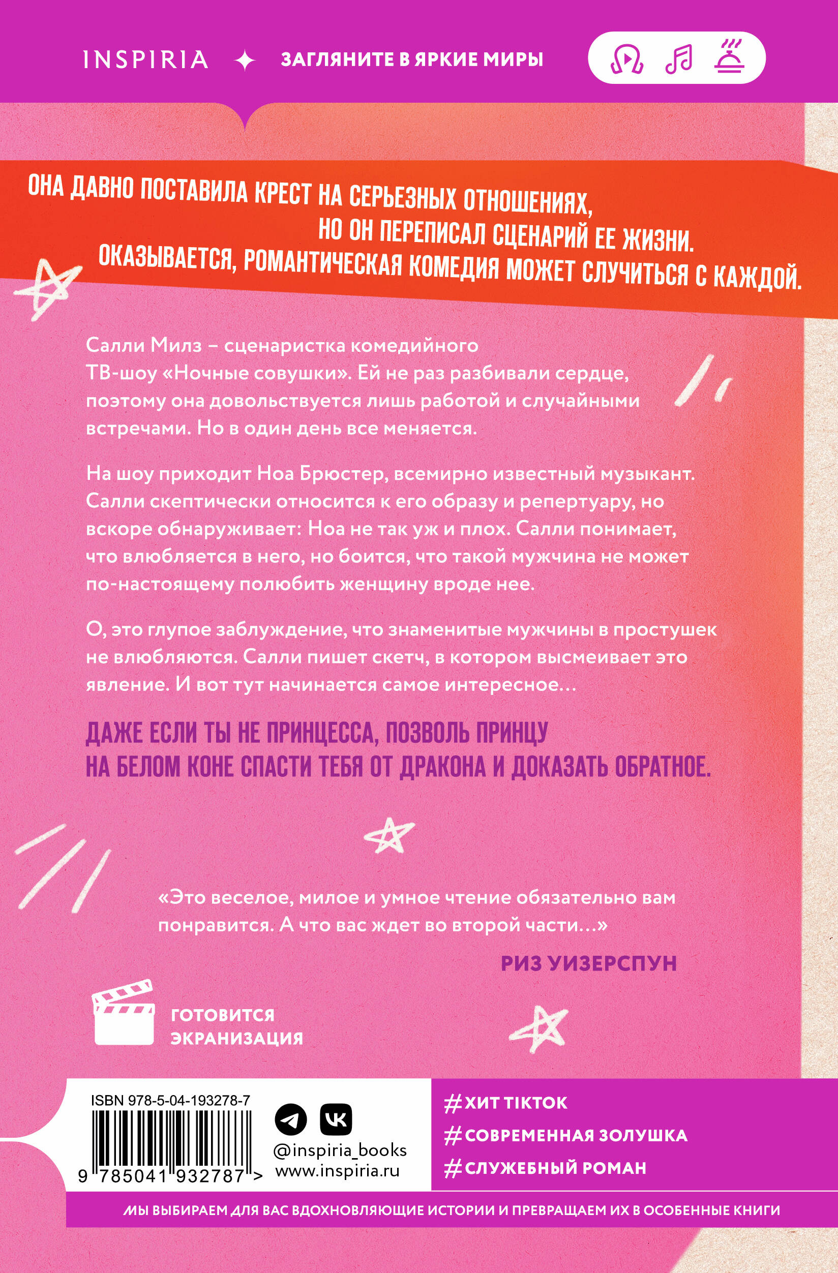 Даже если ты не принцесса, позволь принцу на белом коне спасти тебя от дракона и доказать обратное. Эта история современной Золушки взорвала TikTok. Готовится экранизация. Покет большого формата с запечатанными форзацами, дополнительным контентом к книге и эксклюзивным подарком только в первом тираже. Идеальная книга для тех, кто решил устроить себе внеплановый отпуск. Салли Милз - сценаристка комедийного ТВ-шоу «Ночные совушки». Ей не раз разбивали сердце, поэтому она довольствуется лишь работой и случайными встречами. Но в один день все меняется. На шоу приходит Ноа Брюстер, всемирно известный музыкант. Салли скептически относится к его образу и репертуару, но вскоре обнаруживает: Ноа не так уж и плох. Салли понимает, что влюбляется в него, но боится, что такой мужчина не может по-настоящему полюбить женщину вроде нее. О, это глупое заблуждение, что знаменитые мужчины в простушек не влюбляются. Салли пишет скетч, в котором высмеивает это явление. И вот тут начинается самое интересное… «Это веселое, милое и умное чтение обязательно вам понравится. А что вас ждет во второй части…» - Риз Уизерспун| Издательство | ООО "Издательство "Эксмо" |