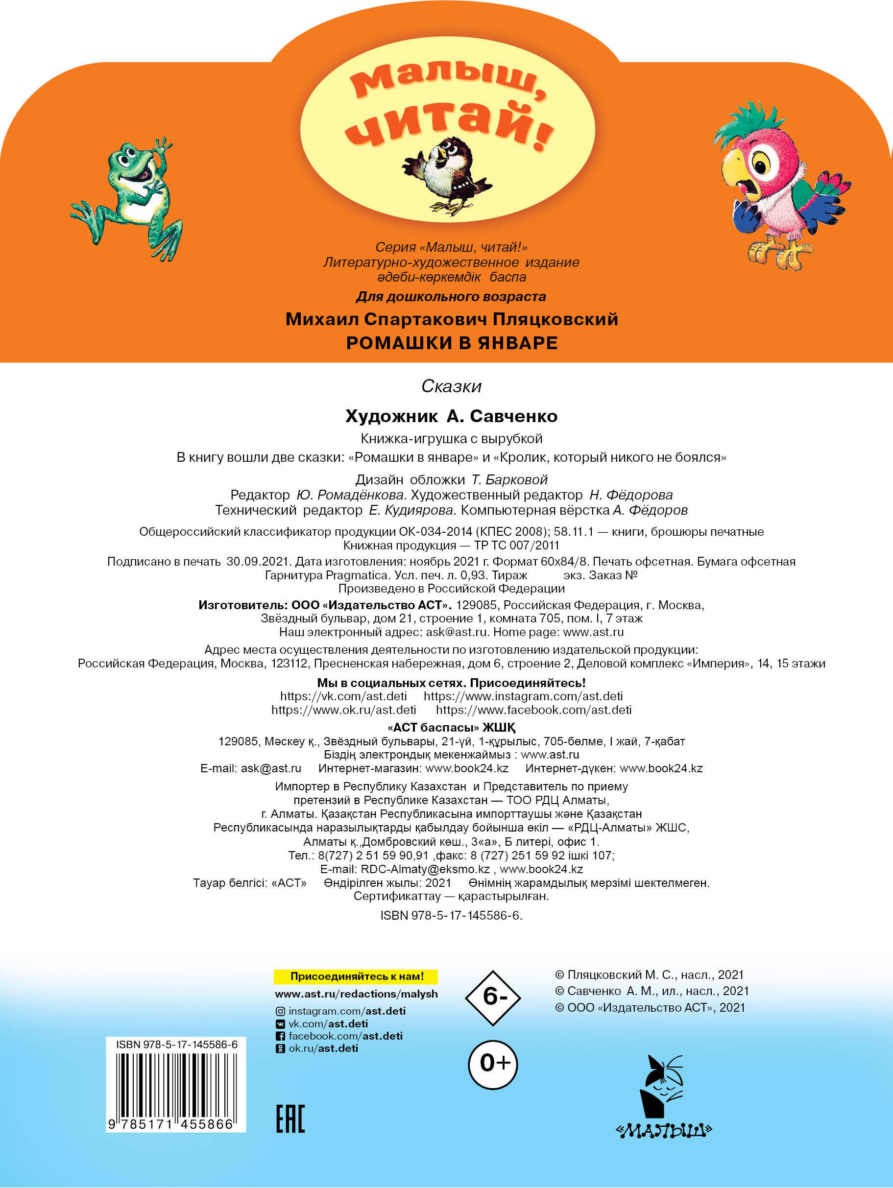 Михаил Пляцковский - поэт-песенник, драматург и детский писатель. Он сочинил известные детские песни: "Улыбка", "Чему учат в школе", "Дважды два - четыре" и многие другие. В нашей книге читатели познакомятся с М. Пляцковским как с писателем-сказочником. В книгу вошли две сказки: "Ромашки в январе" и "Кролик, который никого не боялся".| Издательство | ИЗДАТЕЛЬСТВО "АСТ" |