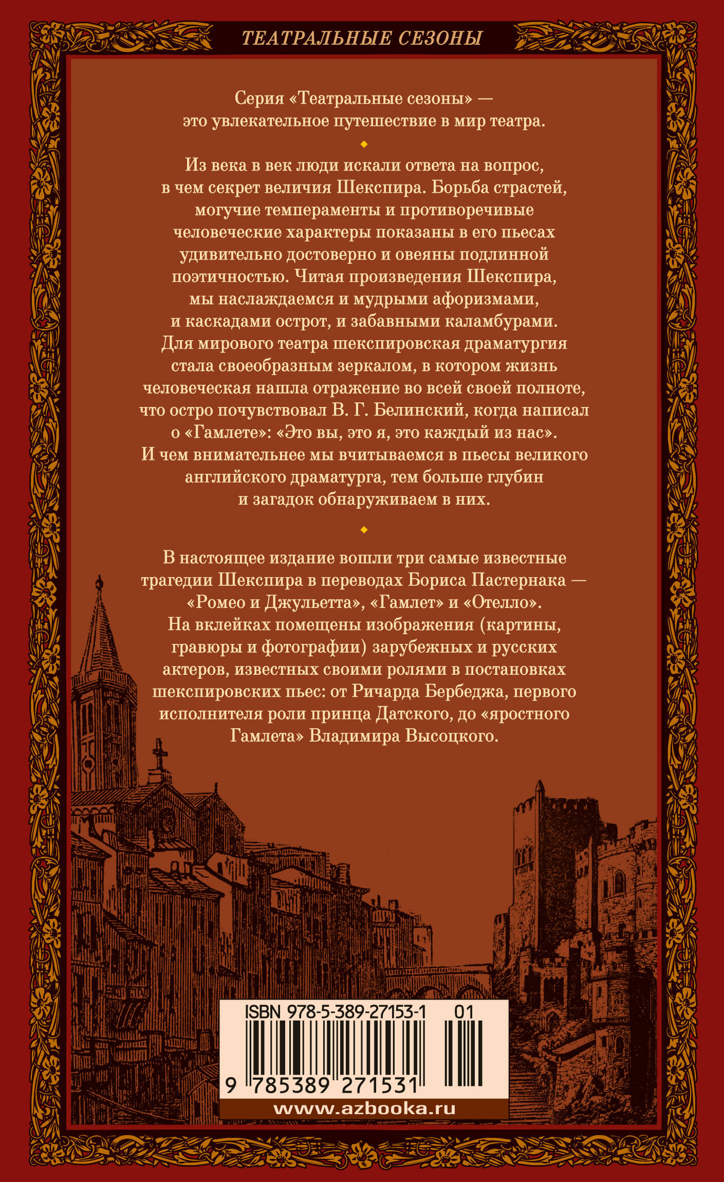 Из века в век люди искали ответа на вопрос, в чем секрет величия Шекспира. Борьба страстей, могучие темпераменты и противоречивые человеческие характеры показаны в его пьесах удивительно достоверно и овеяны подлинной поэтичностью. Читая произведения Шекспира, мы наслаждаемся и мудрыми афоризмами, и каскадами острот, и забавными каламбурами. Для мирового театра шекспировская драматургия стала своеобразным зеркалом, в котором жизнь человеческая нашла отражение во всей своей полноте, что остро почувствовал В. Г. Белинский, когда написал о "Гамлете": "Это вы, это я, это каждый из нас". И чем внимательнее мы вчитываемся в пьесы великого английского драматурга, тем больше глубин и загадок обнаруживаем в них. В настоящее издание вошли три самые известные трагедии Шекспира в переводах Бориса Пастернака - "Ромео и Джульетта", "Гамлет" и "Отелло". На вклейках помещены изображения (картины, гравюры и фотографии) зарубежных и русских актеров, известных своими ролями в постановках шекспировских пьес: от Ричарда Бербеджа, первого исполнителя роли принца Датского, до "яростного Гамлета" Владимира Высоцкого.