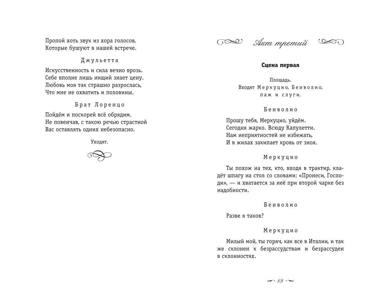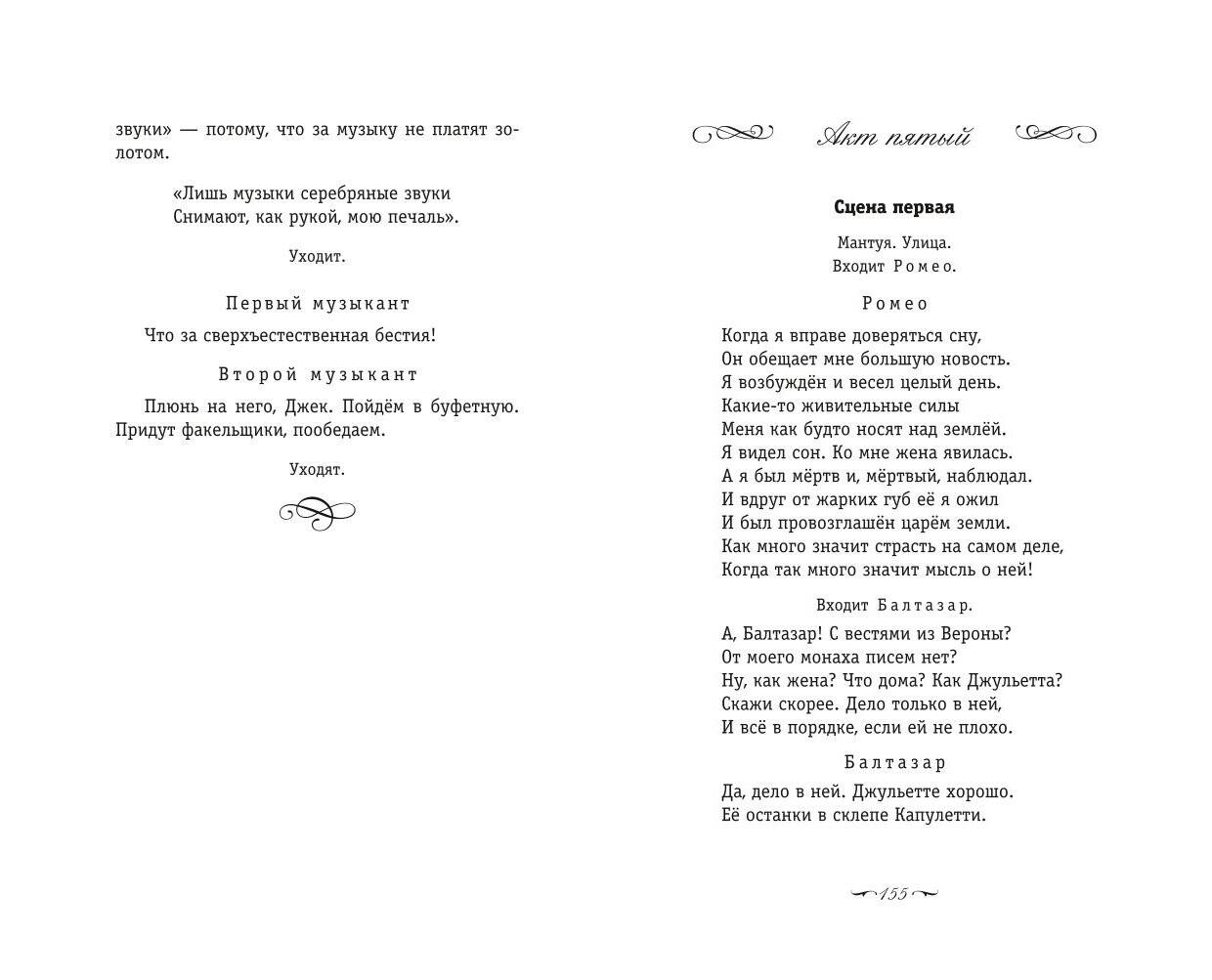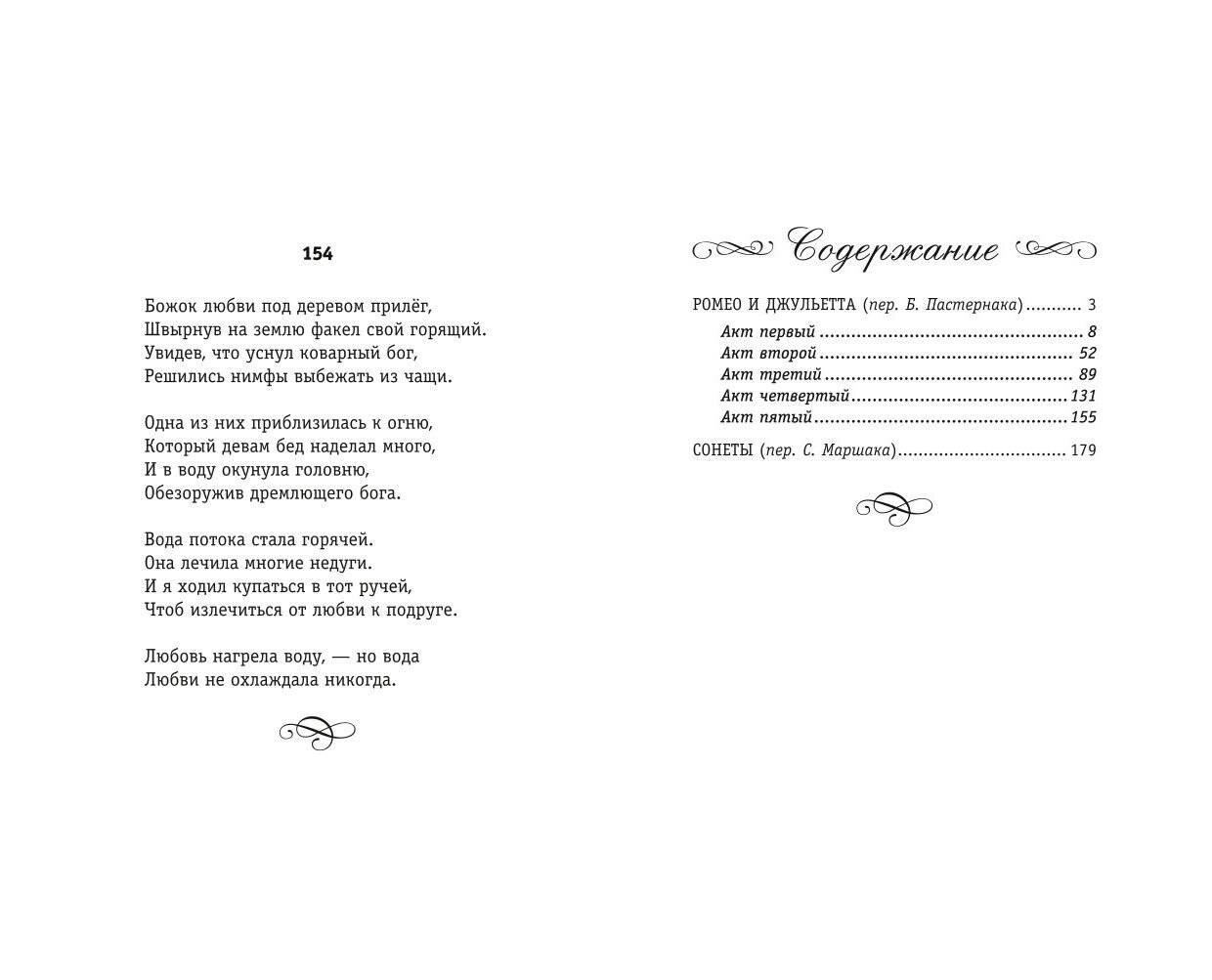Изящная серия идеально подойдёт тем, кто при выборе издания обращает внимание не только на проникновенное содержание, но и на изысканное оформление. Книга компактного формата в твёрдом переплёте. Оригинальный дизайн, тактильная обложка с тканевой фактурой. Белая бумага, удобный для чтения шрифт. Книги этой серии вызывают ассоциации с «прекрасной эпохой» и становятся тем необходимым элементом, который, почти по совету Коко Шанель, должен быть в сумочке каждой женщины. Чтобы всегда чувствовать себя уверенно, выглядеть элегантно и раскрывать свою уникальность. Состав серии порадует любителей искренних и глубоко волнующих романов. В ней собраны лучшие романтические произведения мировой литературы в переводах признанных мастеров. Это «Гордость и предубеждение», «Маленький принц», «Страдания юного Вертера», «Портрет Дориана Грея», «Великий Гэтсби», а также жемчужины русской классики - «Мастер и Маргарита», любовная лирика Сергея Есенина и Александра Пушкина. Эти книги проникают в глубины человеческой души и исследуют каждое движение трепещущего сердца. В книгу вошли великие произведения Вильяма Шекспира: пьеса «Ромео и Джульетта», сонеты. В «Ромео и Джульетте» история любви двух молодых людей рассказана так выразительно и динамично, что на протяжении веков ее ставят во всех театрах мира, а с появлением кинематографа - экранизируют ведущие режиссеры. Имена влюбленных из Вероны стали символом безграничной любви. А строки сонетов по-прежнему звучат в нас эхом собственных мыслей и переживаний. Каждому понятны слова, обращенные к любимому: «И кажется великолепной тьма, когда в нее ты входишь светлой тенью». Мало кто из писателей умел столь просто и ясно говорить с человеком о человеке, чтобы спустя столетия быть близким и понятным читателю. Пьеса и сонеты представлены в переводах талантливых поэтов: Бориса Пастернака и Самуила Маршака. Оба перевода объединяют современный язык, выразительность и лаконичность. Потому они по праву считаются лучшими.