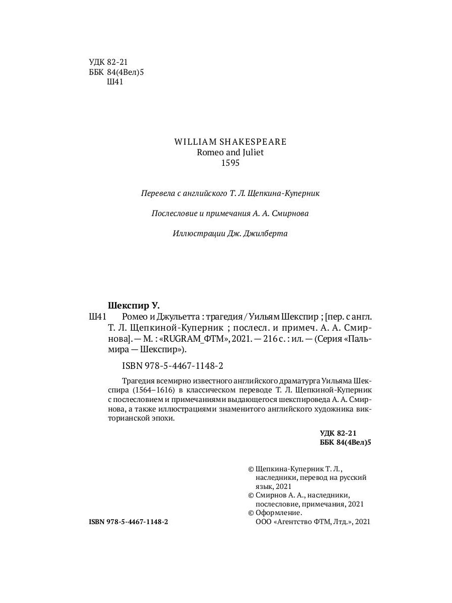 Трагедия всемирно известного английского драматурга Уильяма Шекспира (1564-1616) в классическом переводе Т. Л. Щепкиной-Куперник с послесловием и примечаниями выдающегося шекспироведа А. А. Смирнова, а также иллюстрациями знаменитого английского художника викторианской эпохи.| Издательство | Т8 RUGRAM |