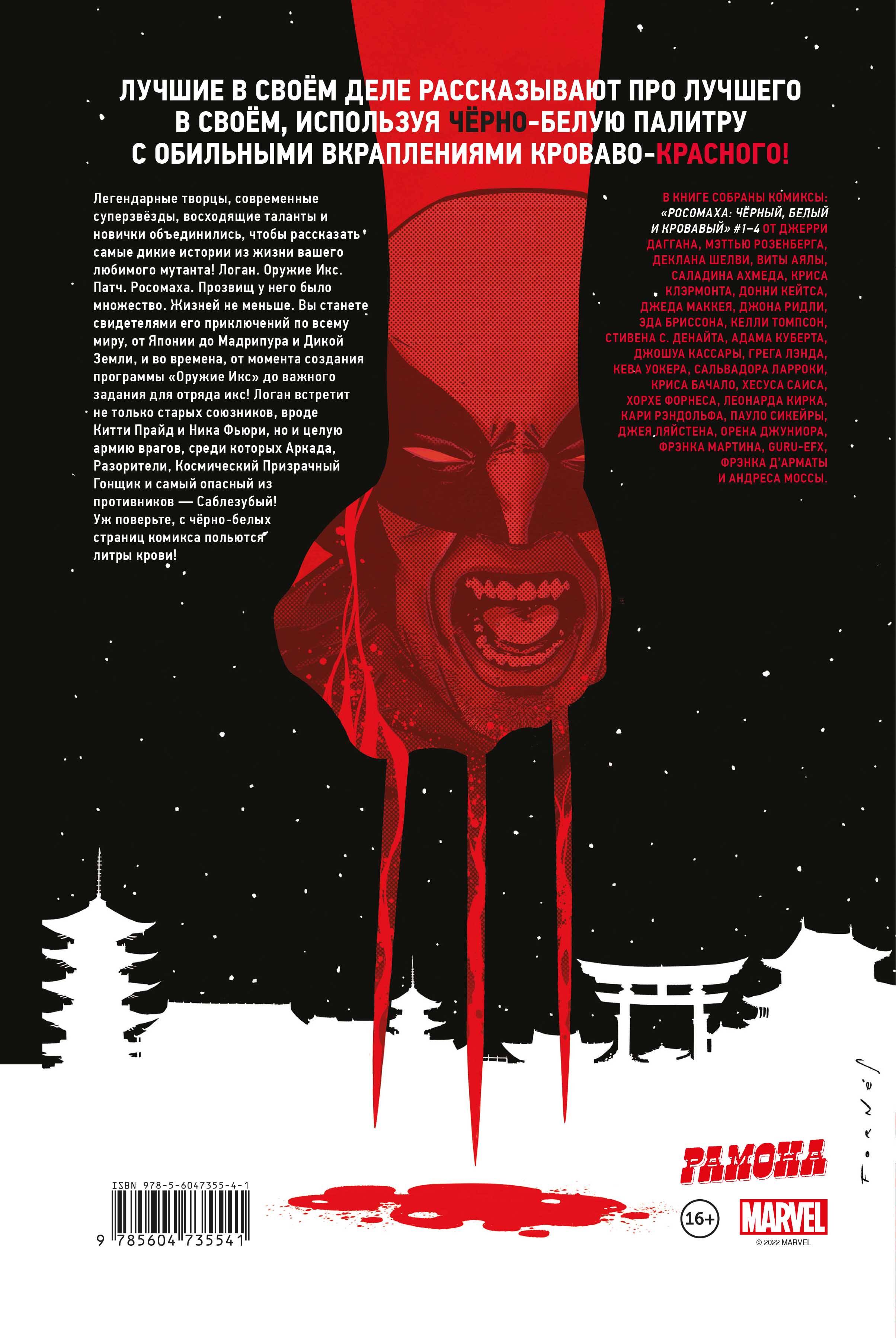 Легендарные творцы, современные суперзвёзды, восходящие таланты и новички объединились, чтобы рассказать самые дикие истории из жизни вашего любимого мутанта! Логан. Оружие Икс. Патч. Росомаха. Прозвищ у него было множество. Жизней не меньше. Вы станете свидетелями его приключений по всему миру, от Японии до Мадрипура и Дикой Земли, и во времена, от момента создания программы «Оружие Икс» до важного задания для отряда икс! Логан встретит не только старых союзников, вроде Китти Прайд и Ника Фьюри, но и целую армию врагов, среди которых Аркада, Разорители, Космический Призрачный Гонщик и самый опасный из противников - Саблезубый! Уж поверьте, с чёрно-белых страниц комикса польются литры крови!| Издательство | Эксмо |