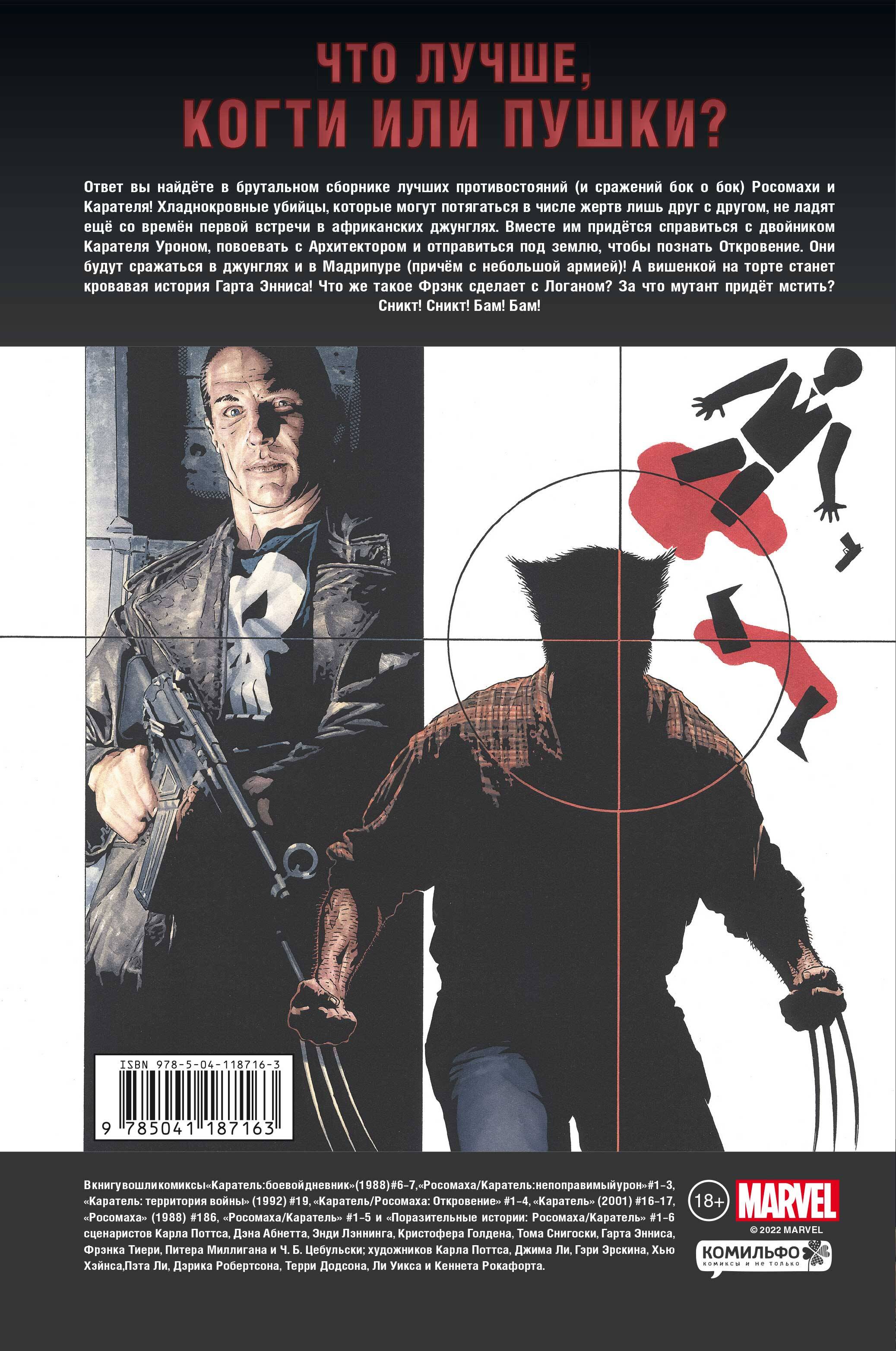 Что лучше, когти или пушки? Ответ вы найдёте в брутальном сборнике лучших противостояний (и сражений бок о бок) Росомахи и Карателя! Хладнокровные убийцы, которые могут потягаться в числе жертв лишь друг с другом, не ладят ещё со времён первой встречи в африканских джунглях. Вместе им придётся справиться с двойником Карателя Уроном, повоевать с Архитектором и отправиться под землю, чтобы познать Откровение. Они будут сражаться в джунглях и в Мадрипуре (причём с небольшой армией)! А вишенкой на торте станет кровавая история Гарта Энниса! Что же такое Фрэнк сделает с Логаном? За что мутант придёт мстить? Сникт! Сникт! Бам! Бам! В книгу вошли комиксы «Каратель: боевой дневник» (1988) #6-7, «Росомаха/Каратель: непоправимый урон» #1-3, «Каратель: территория войны» (1992) #19, «Каратель/Росомаха: Откровение» #1-4, «Каратель» (2001) #16-17, «Росомаха» (1988) #186, «Росомаха/Каратель» #1-5 и «Поразительные истории: Росомаха/Каратель» #1-6 сценаристов Карла Поттса, Дэна Абнетта, Энди Лэннинга, Кристофера Голдена, Тома Снигоски, Гарта Энниса, Фрэнка Тиери, Питера Миллигана и Ч. Б. Цебульски; художников Карла Поттса, Джима Ли, Гэри Эрскина, Хью Хэйнса, Пэта Ли, Дэрика Робертсона, Терри Додсона, Ли Уикса и Кеннета Рокафорта.| Издательство | ООО "Издательство "Эксмо" |