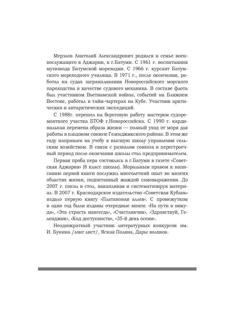 В новый сборник Анатолия Мерзлова вошли рассказы, написанные сегодня, но затрагивающие значительный пласт противоречивой истории страны, представляющие собой размышления о том, что является частью жизни, - о любви, о влюбленности, о настоящей дружбе, о предательстве. Здесь разговор о пошлости жизни содержанки сменяется непреходящей памятью о погибшем в бою друге, беседы случайных попутчиков в поезде - рассказом о тяжелой судьбе девушки Груни, ее любовь, ее история не оставляют равнодушным героя, и он находит свидетеля героизма Груни.