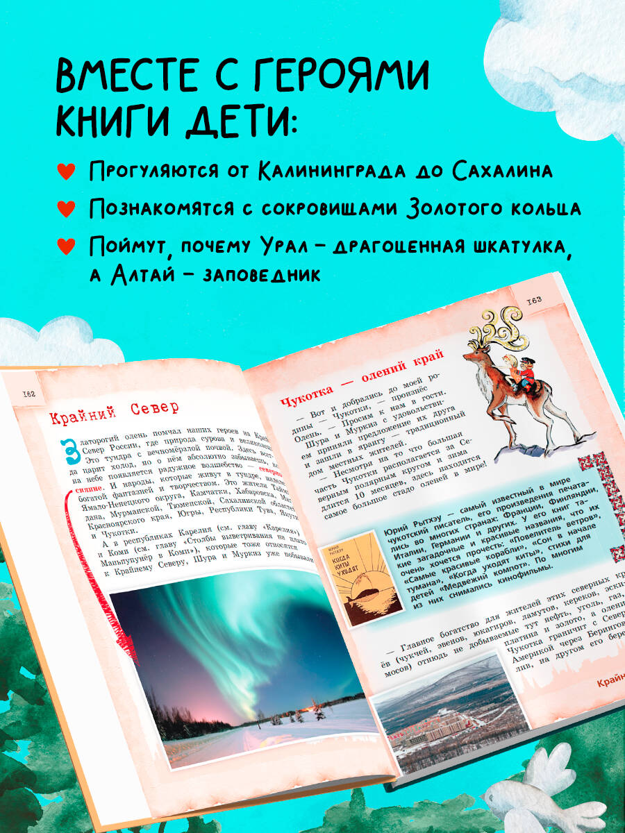 Захватывающее путешествие двух героев по самым интересным местам нашей необъятной родины! Вместе с ними дети узнают, чем славятся города Золотого кольца, где в России находятся пряничный рай и танцующий лес, почему Урал - это драгоценная шкатулка России, а Алтай - самое заповедное место, и что скрывается за загадочными названиями «Карелия», «Камчатка» и «Чукотка». Также вы посетите самую высокую в России гору Эльбрус, самое холодное место и самое глубокое на планете озеро Байкал. Книга включает в себя увлекательные задания и игры, а также оригинальные иллюстрации, созданные специально для издания. Издание полностью обновлено и дополнено, подготовлено с учетом всех санитарно-технических требований и абсолютно безопасно для детей.| Издательство | ООО "Издательство "Эксмо" |