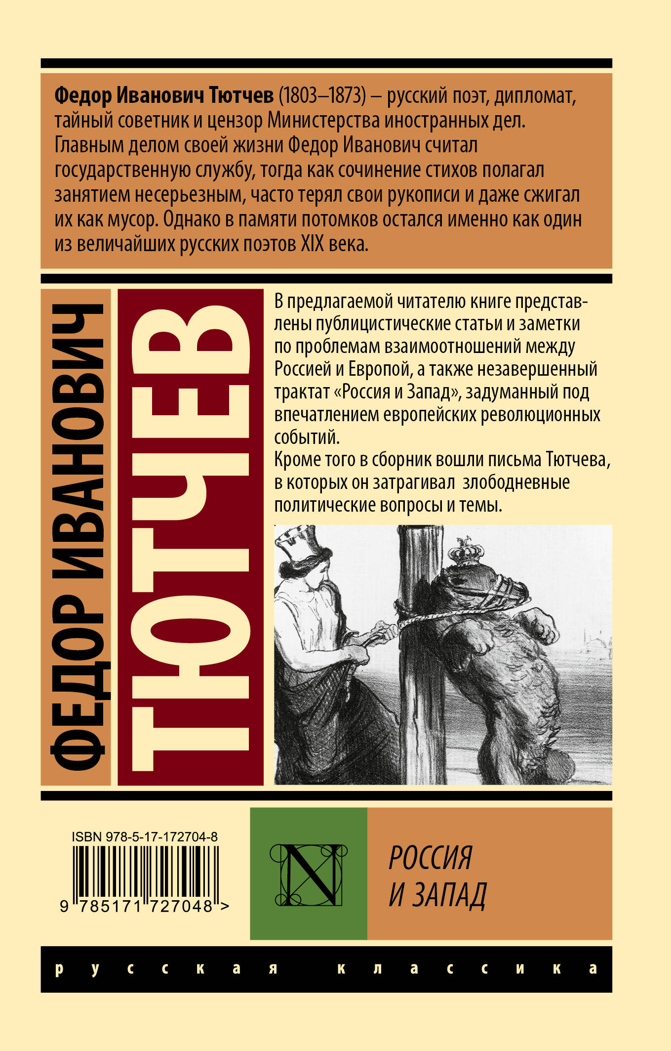 - Вошедшие в данное издание произведения представляют собой синтез глубокого анализа политики великих держав XIX века от выдающегося русского поэта и дипломата своего времени. - В «России и Западе» Тютчев демонстрирует различия между западноевропейским и русским менталитетом, культурой и ценностными ориентирами, многие из которых актуальны по сей день. - Книга позволяет увидеть развитие международных отношений глазами одного из виднейших дипломатов царской эпохи. - Сборник помогает лучше понять исторические корни современной международной обстановки. - Издание в серии «Эксклюзив: Русская классика» - в удобном карманном формате и узнаваемом оформлении.| Издательство | Издательство "АСТ" |