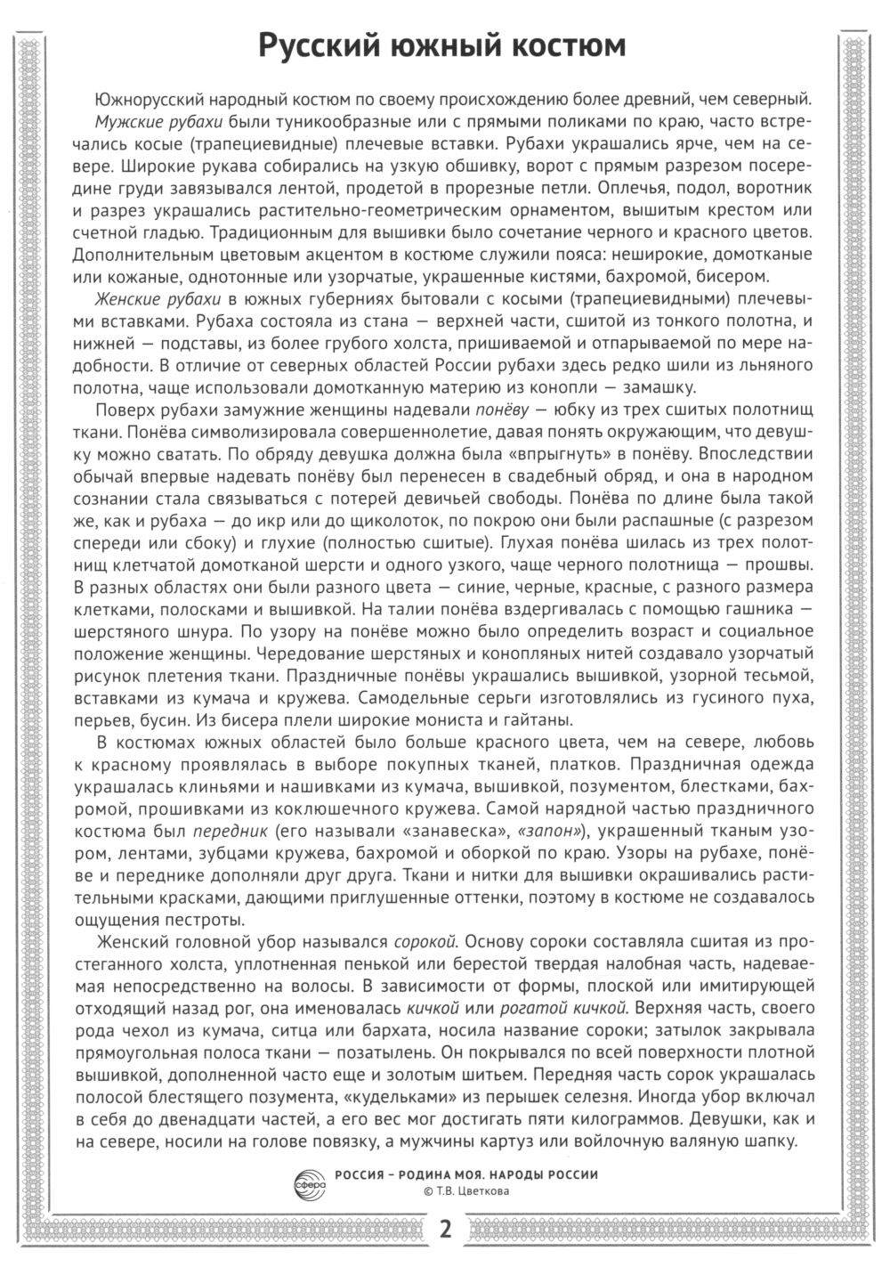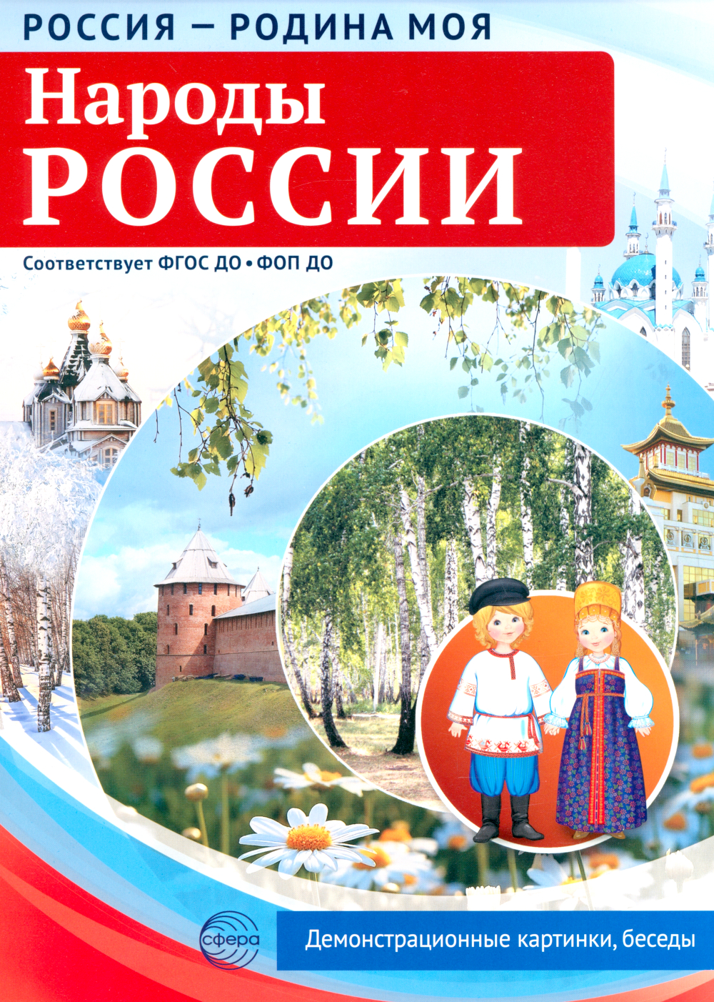 В комплекте демонстрационных материалов «Народы России» рассматриваются традиционные костюмы народов России. Костюмы каждого народа отличались большим разнообразием, менялись от губернии к губернии, их детали различались, поэтому на карточках представлены обобщенные варианты костюмов. Знания даются сжато, но в достаточном для ребёнка 6-11 лет объёме. Работа с материалами поможет дошкольникам и младшим школьникам расширить кругозор и больше узнать о народах, населяющих нашу страну. Пособие подходит для индивидуальной и групповой работы.| Издательство | Творческий центр Сфера |
