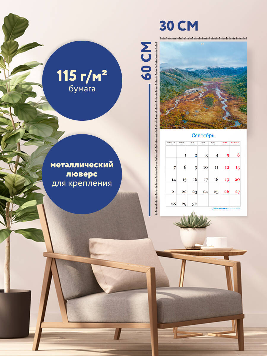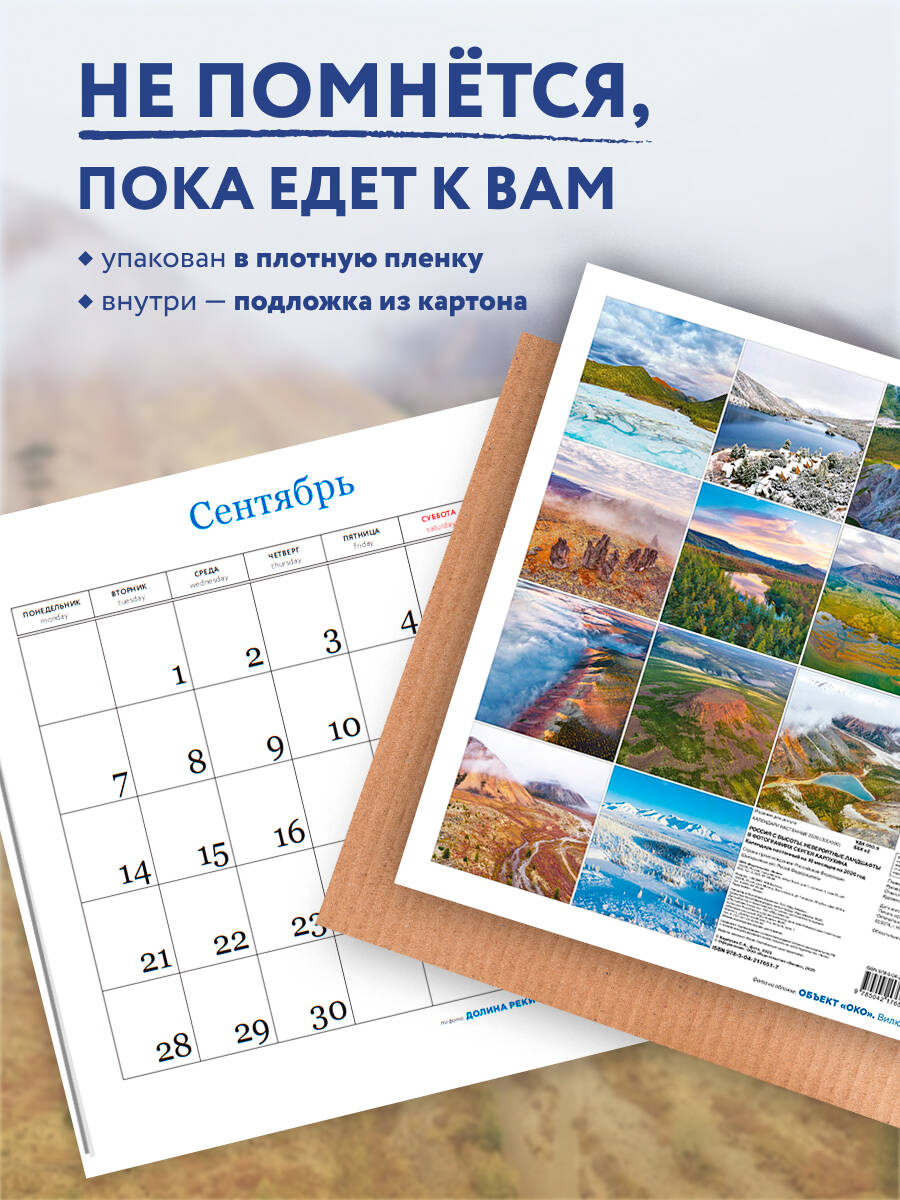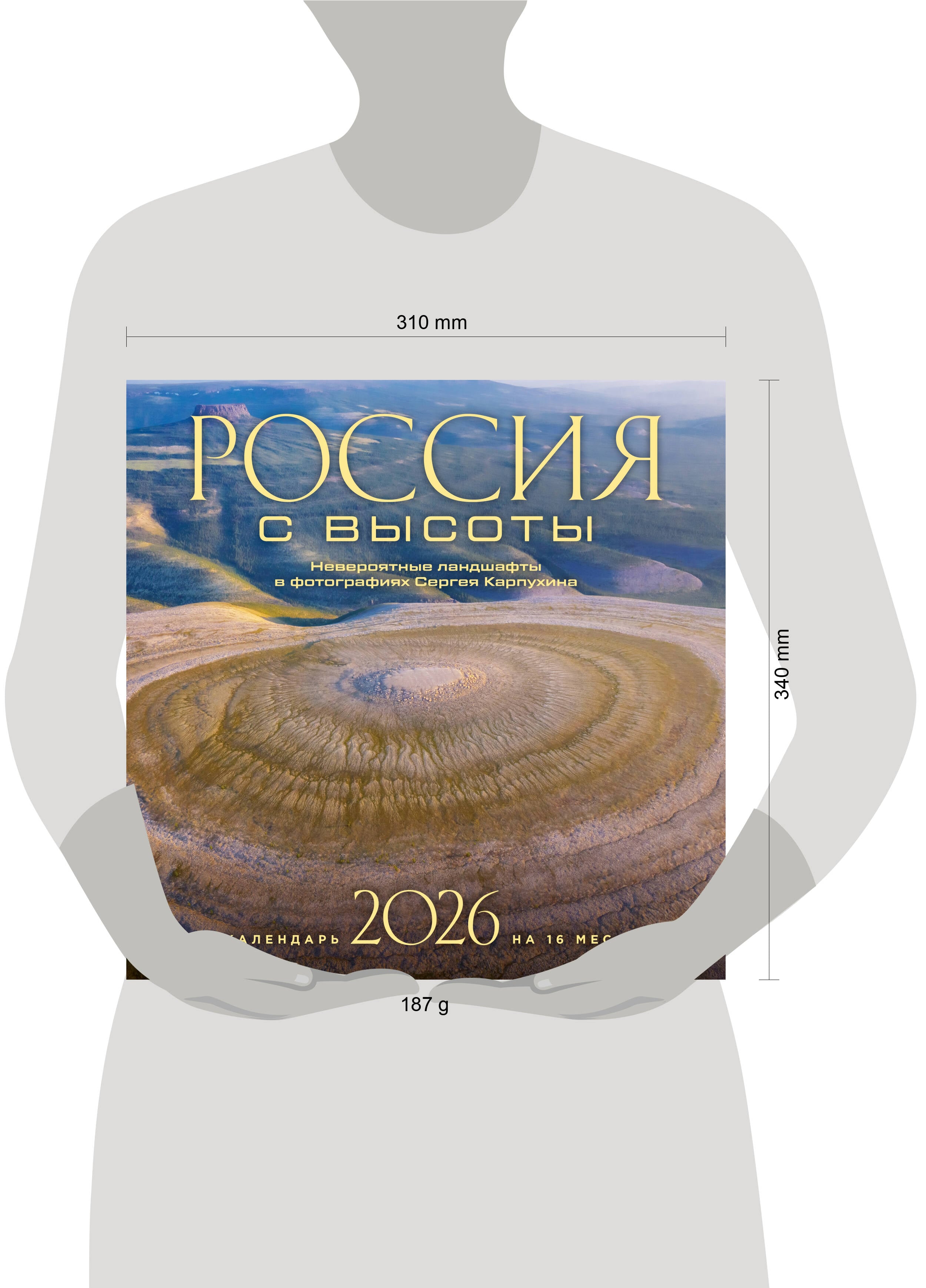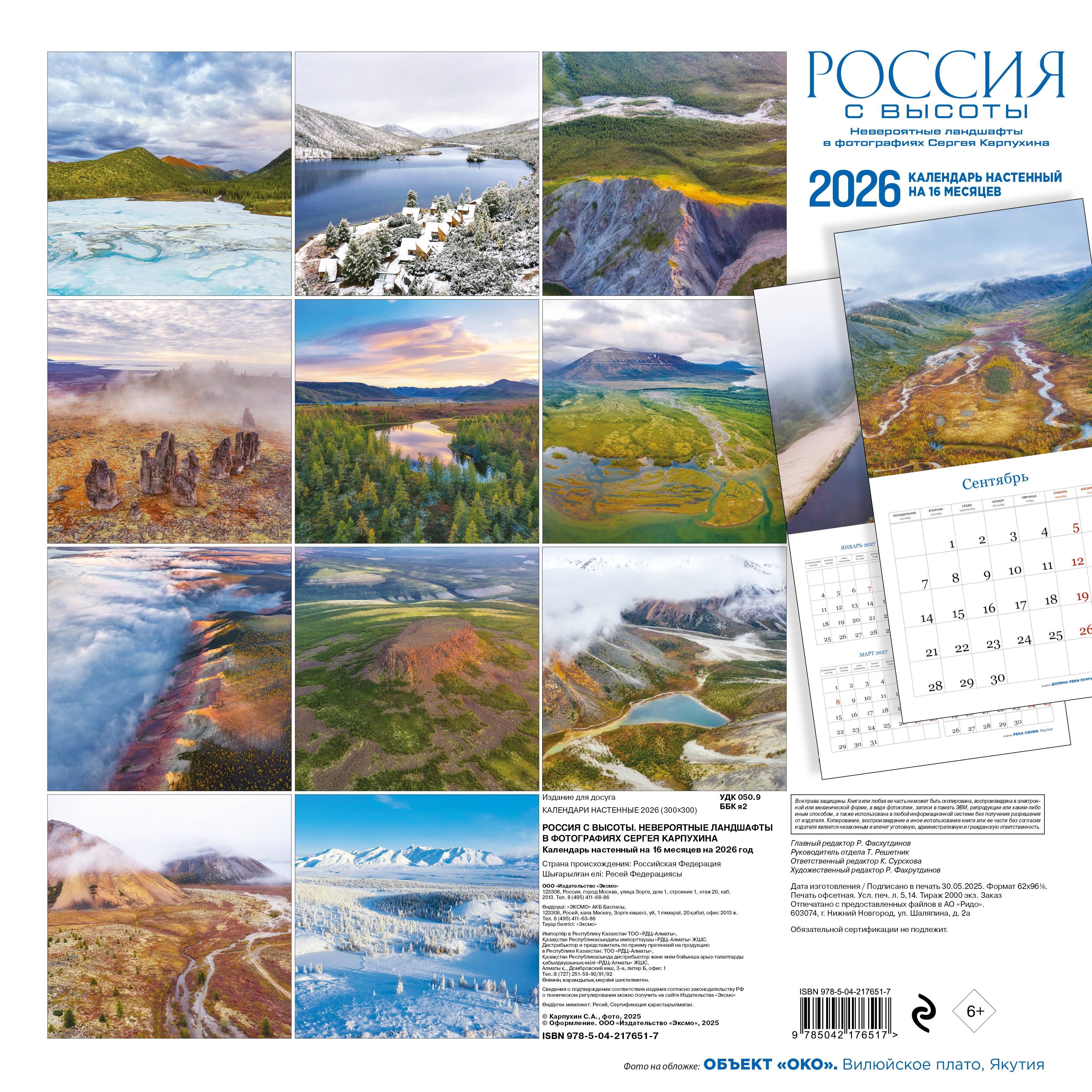 О серии: Наши настенные календари отличаются высоким качеством исполнения! Тщательно подобранные иллюстрации, напечатанные на глянцевой бумаге высочайшего качества, станут настоящим украшением дома, а в календарной сетке найдется место для ваших планов: большие клетки позволят делать записи и организовать свой год! В календаре также отмечены все государственные праздники. В серии настенных календарей издательства «ЭКСМО» каждый найдет тему по вкусу: великие художники, великолепные подборки с самыми знаменитыми произведениями искусства, легендарные кинематографические саги и игры, главные книжные авторы и бестселлеры, фотографии и иллюстрации любимых животных и многое-многое другое! О календаре: В календаре подобраны невероятные фотографии неизведанных уголков нашей страны с высоты: просторы Красноярского края, красоты Якутии, уникальные природные объекты и многое другое. Невероятная природа нашей страны точно вдохновит вас на увлекательное и атмосферное путешествие по России. Автор снимков - известный фотограф, член Русского Географического Общества и основатель проекта PhotoGeographic Сергей Карпухин. Посмотрите на Россию его глазами, ведь Сергей видит нашу страну так, что оторваться от его снимков невозможно! Также в календарь включен дополнительный разворот с первыми четырьмя месяцами 2027 года! Для кого: Невероятные фотографии для любителей путешествий и нашей прекрасной страны. Технические параметры: - Тип календаря - настенный перекидной. - Год - 2026. - Календарная сетка - с разбивкой по месяцам. - Вид скрепления - скрепка. - Ширина - 30 см. - Высота - 30 см. - Внутренний блок - мелованная бумага 115 г/м2. - Подложка - плотный гофрокартон для поддержания формы. - Индивидуальная упаковка в плотный целлофановый пакет.| Издательство | ООО "Издательство "Эксмо" |