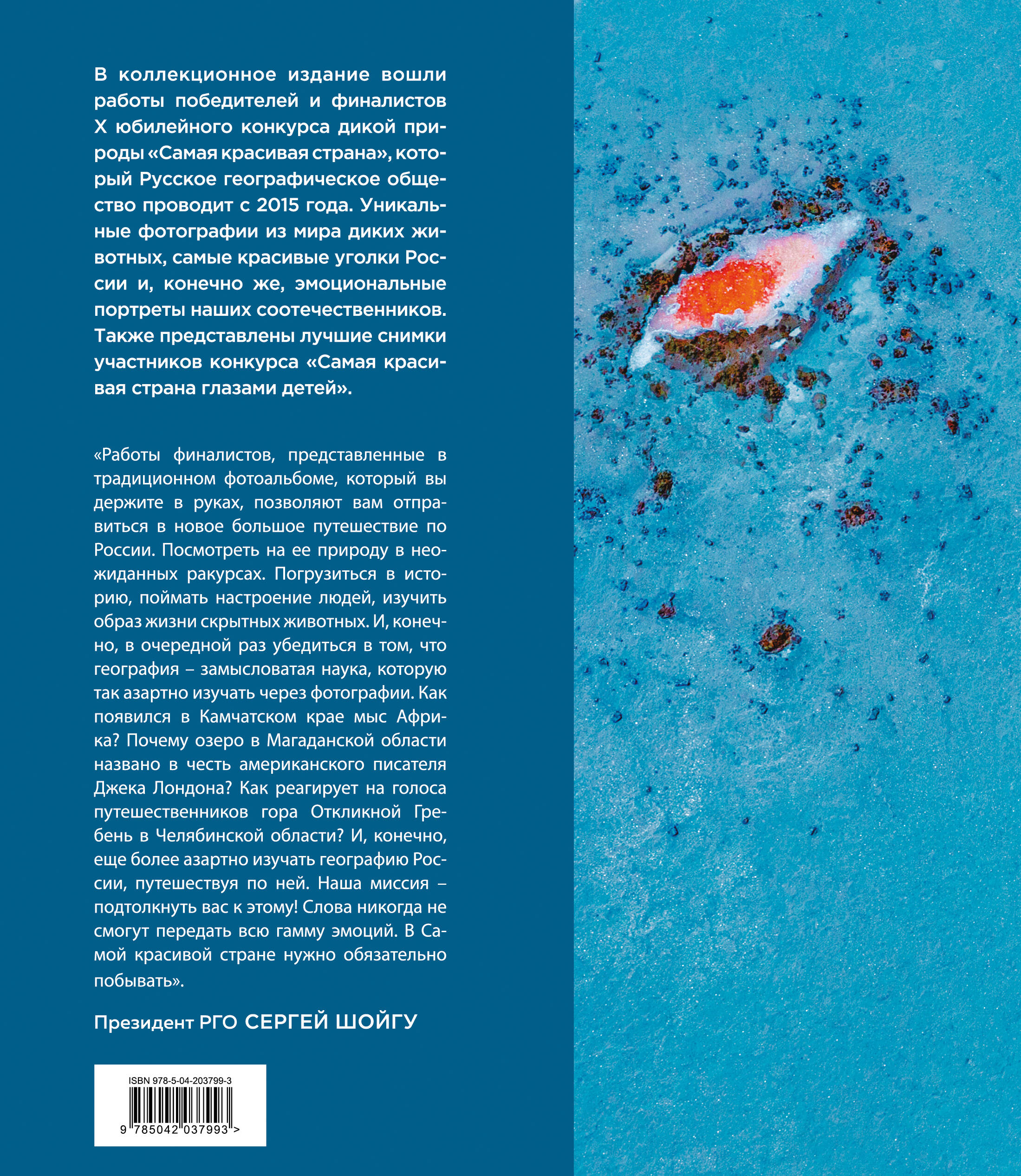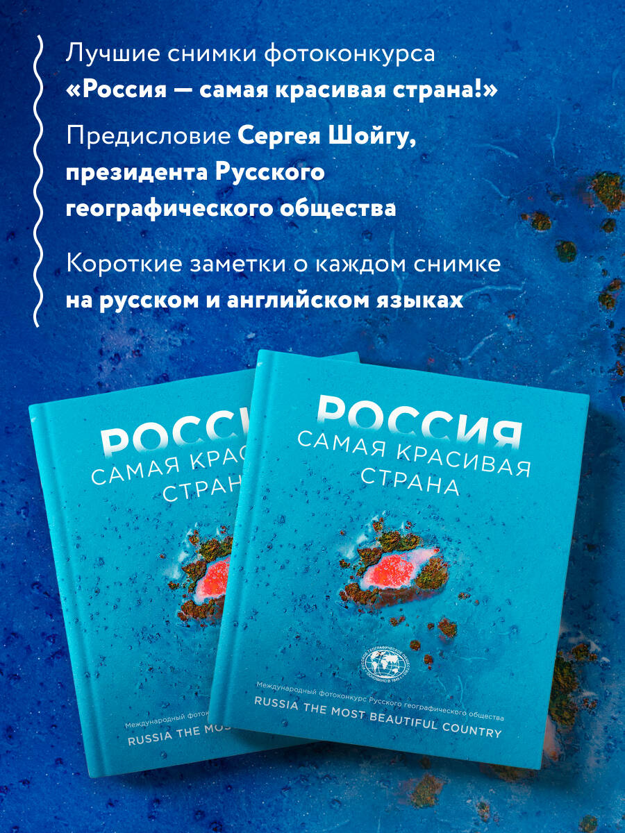 Книга «Россия самая красивая страна» - это роскошное коллекционное издание с лучшими фотографиями со всех уголков России, которые были отобраны Русским географическим обществом из множества присланных работ на конкурс 2024 года. Лето в горах Адыгеи, знакомство с дальневосточными леопардами в Приморье, удивительное Печорское море, сказочные камчатские медведи, незабываемые пейзажи и эмоциональные портреты. Все это - финалисты и победители X фотоконкурса «Самая красивая страна». Это издание будет непревзойденным подарком для всех ценителей прекрасного! «Работы финалистов, представленные в традиционном фотоальбоме, который вы держите в руках, позволяют вам отправиться в новое большое путешествие по России. Посмотреть на ее природу в неожиданных ракурсах. Погрузиться в историю, поймать настроение людей, изучить образ жизни скрытных животных. И, конечно, в очередной раз убедиться в том, что география - замысловатая наука, которую так азартно изучать через фотографии. Как появился в Камчатском крае мыс Африка? Почему озеро в Магаданской области названо в честь американского писателя Джека Лондона? Как реагирует на голоса путешественников гора Откликной Гребень в Челябинской области? Еще более азартно изучать географию России, путешествуя по ней. Наша миссия - подтолкнуть вас к этому!» - Сергей Шойгу, Президент РГО