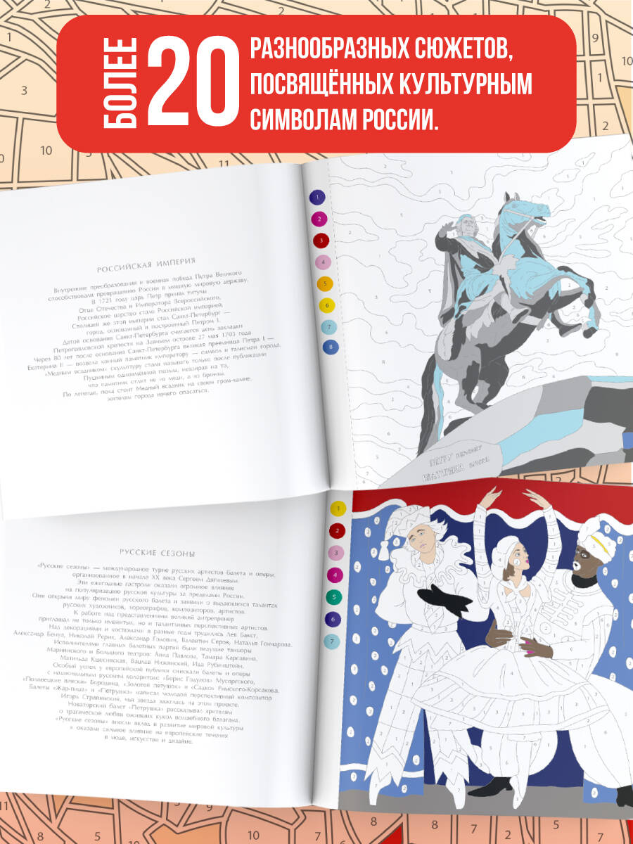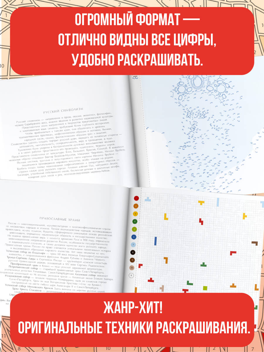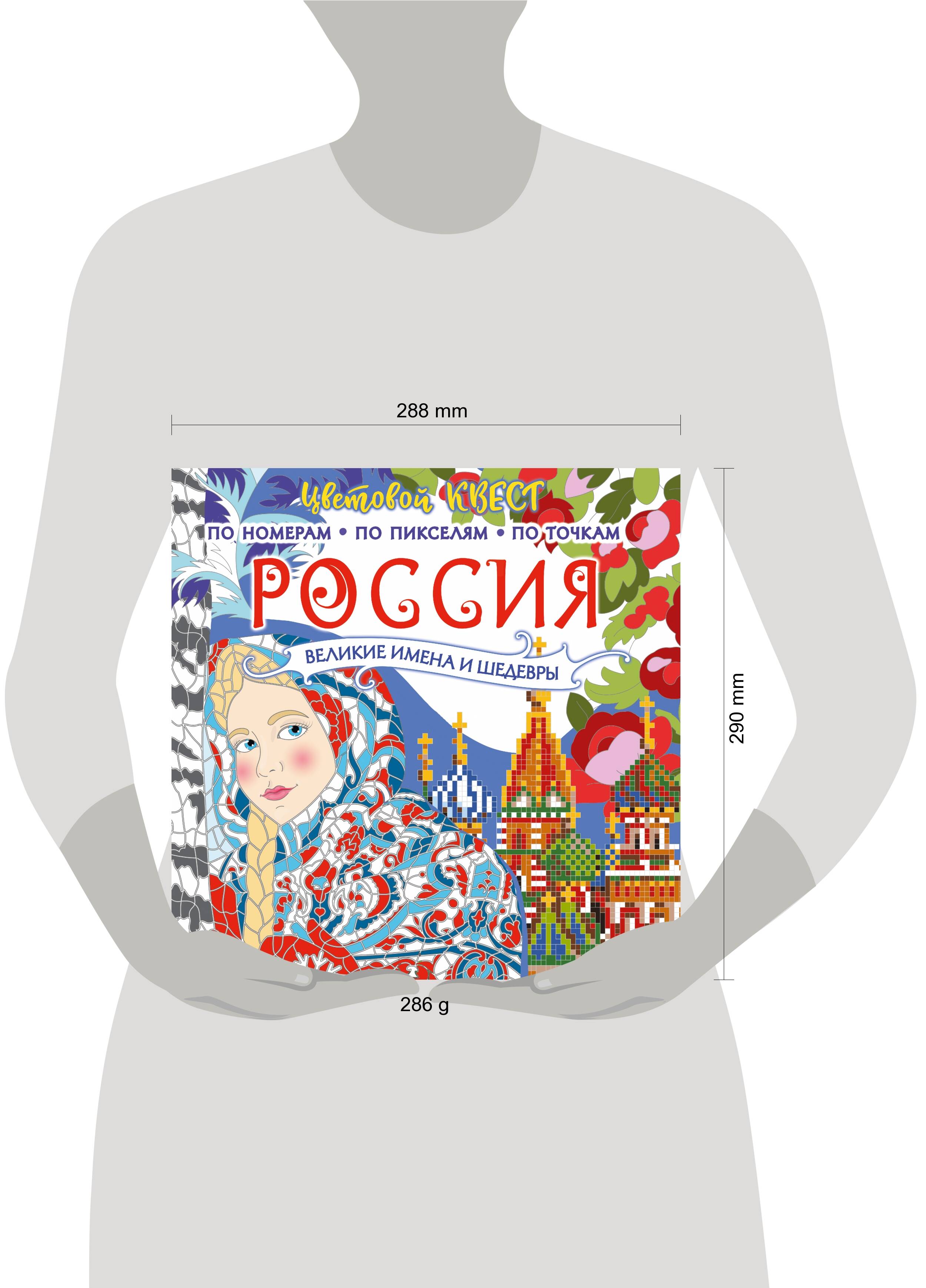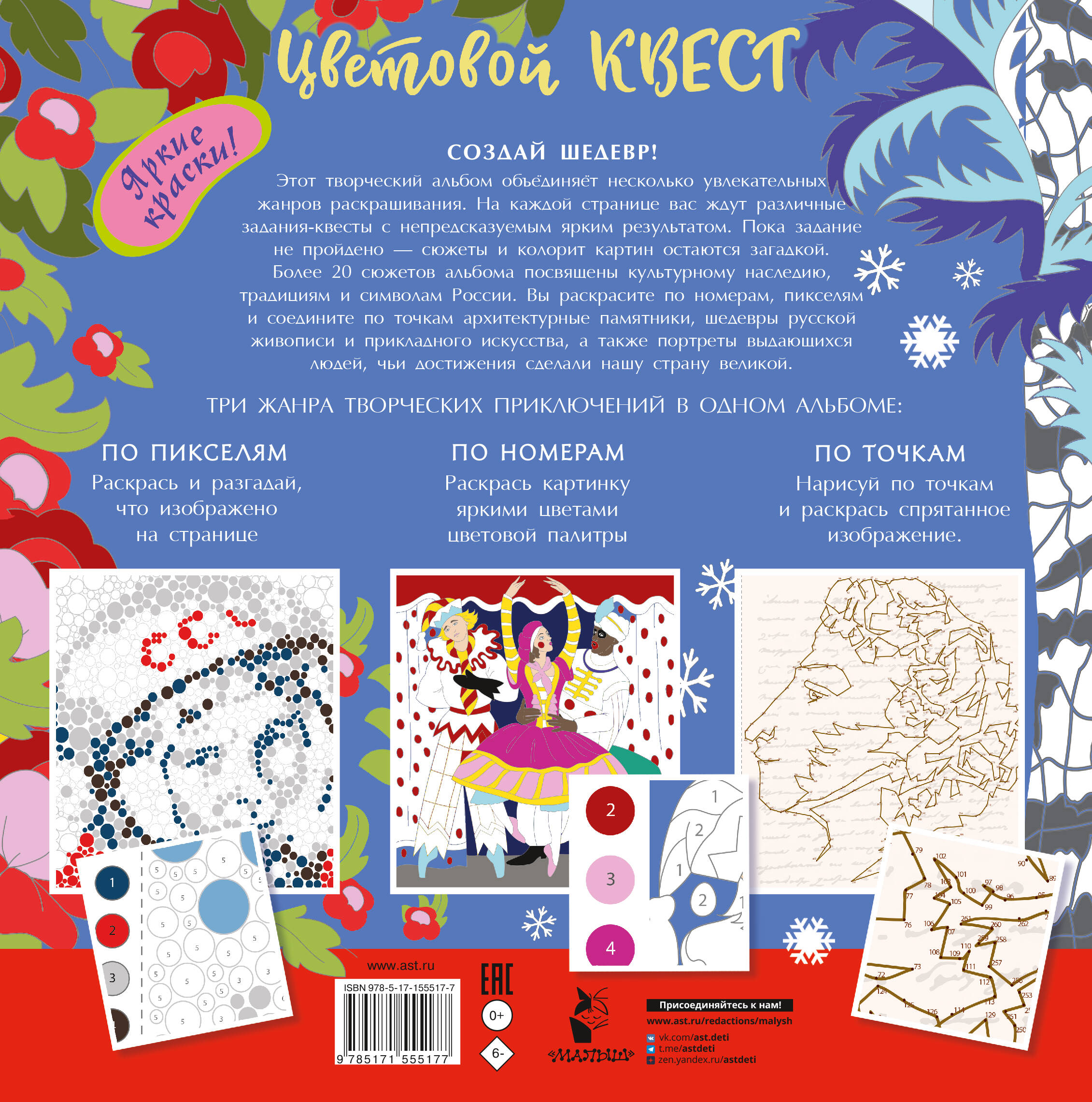 Долгожданная арт-раскраска для детей и взрослых. Все самые популярные арт-квесты в одном издании. Создай свой шедевр! "Цветовой квест" - серия альбомов для креативного раскрашивания. В каждой книге объединены и адаптированы для детей жанры любимых арт-квестов для взрослых: раскраски по номерам, по пикселям, по точкам. - квест по номерам. Раскрась пронумерованные детали рисунка контрастными цветами, специально подобранными художником, - и увидишь неожиданный яркий результат. - квест по пикселям. Заполняй цветом части мозаики и наблюдай, как проявляется скрытая картинка. - квест по точкам. Последовательно соедини точки, чтобы разгадать сюжет картинки - раскрась по собственному вкусу. Этот творческий альбом объединяет несколько увлекательных жанров раскрашивания. На каждой странице вас ждут различные задания-квесты с непредсказуемым ярким результатом. Пока задание не пройдено - сюжеты и колорит картин остаются загадкой. Более 20 сюжетов альбома посвящены культурному наследию, традициям и символам России. Вы раскрасите по номерам, пикселям и соедините по точкам архитектурные памятники, шедевры русской живописи и прикладного искусства, а также портреты выдающихся людей, чьи достижения сделали нашу страну великой.