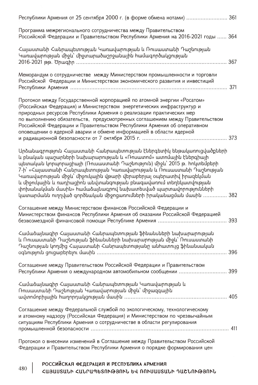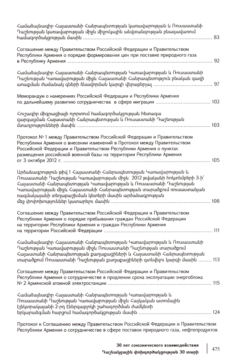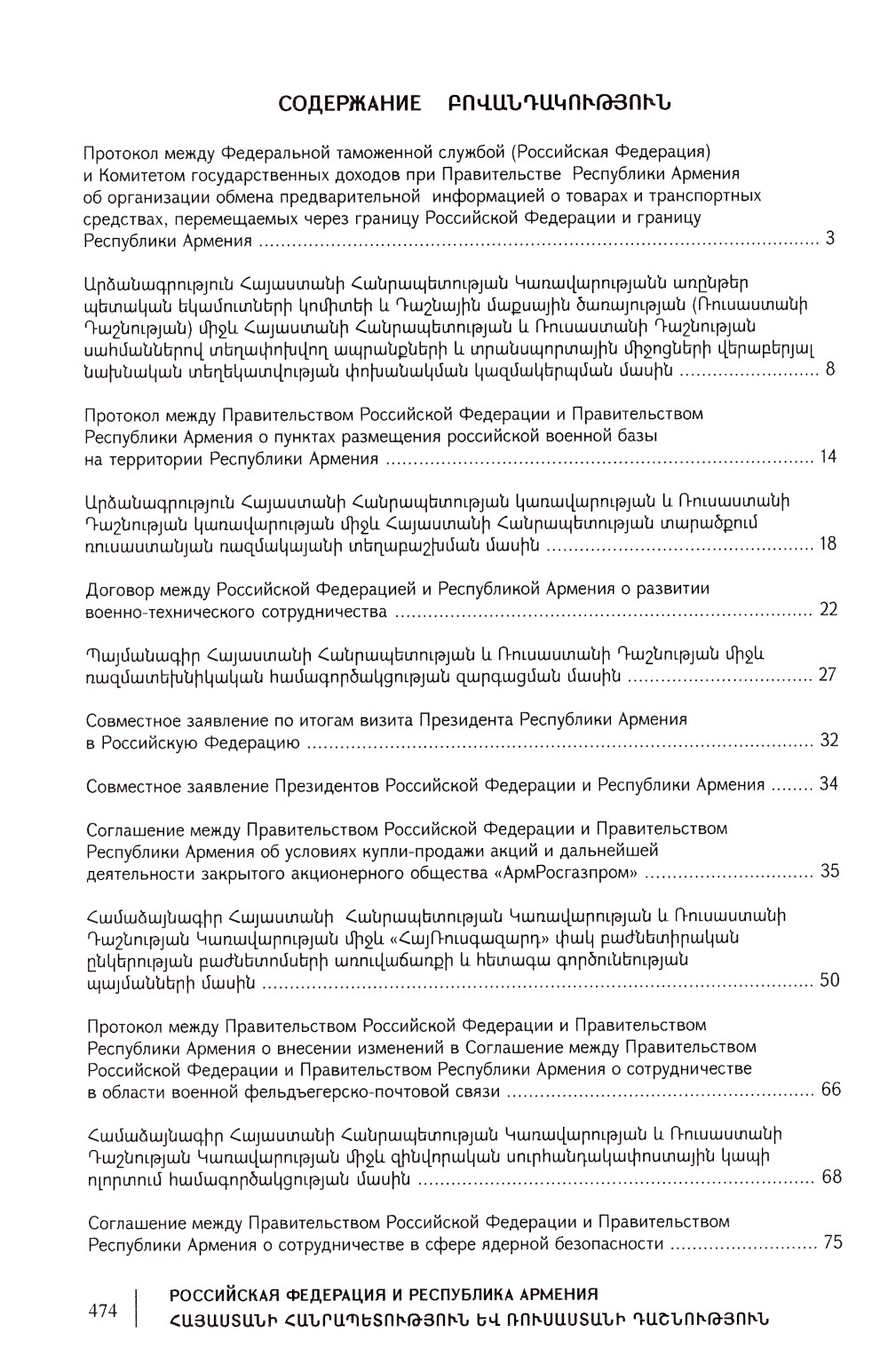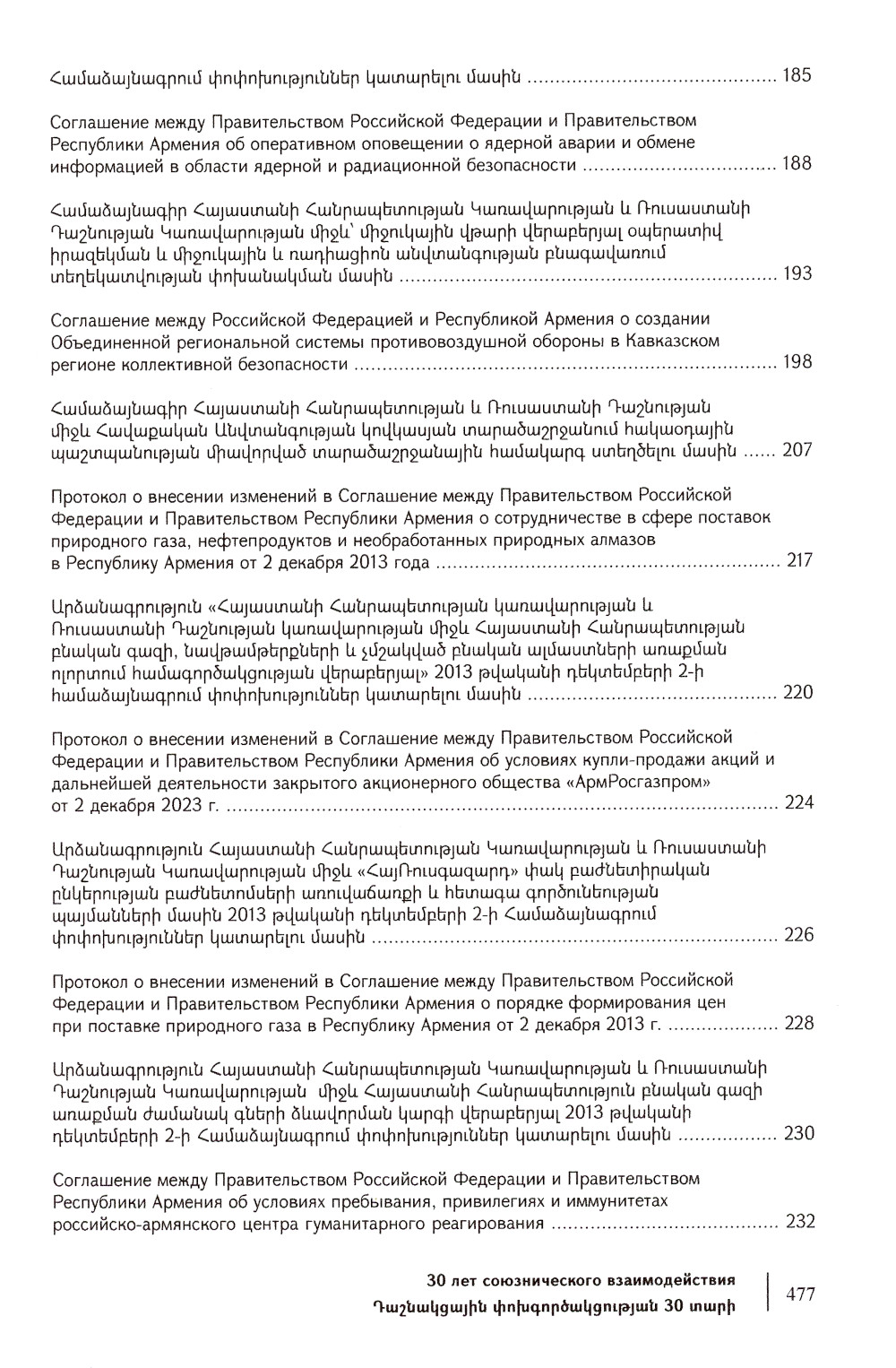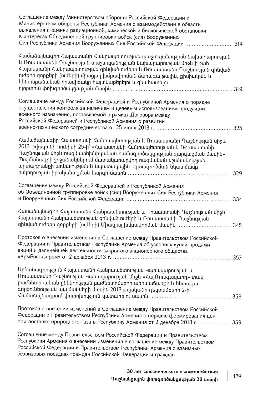 Сборник договоров и соглашений. Т. 2 (2002-2011) на русс.и армян.яз»: Настоящий трехтомный сборник составлен и издан по случаю тридцатилетия установления дипломатических отношений между Российской Федерацией и Республикой Армения. В сборник вошли тексты основных двусторонних документов между Российской Федерацией и Республикой Армения в период с 1992 по 2021 гг. на русском и армянском языках. Сборник составлен усилиями представителей Четвертого департамента стран СНГ- МИД Российской Федерации, Посольства Республики Армения в Москве и Общественной организации «ДИАЛОГ». Он издан при содействии «Дома русской книги» в Ереване.