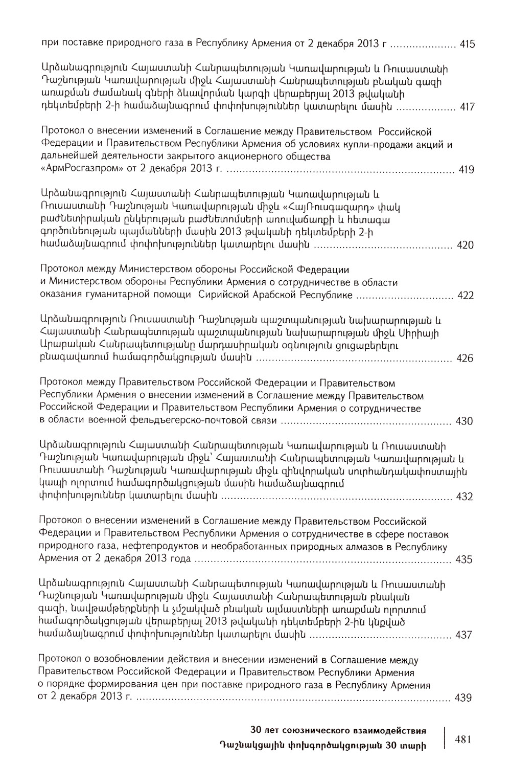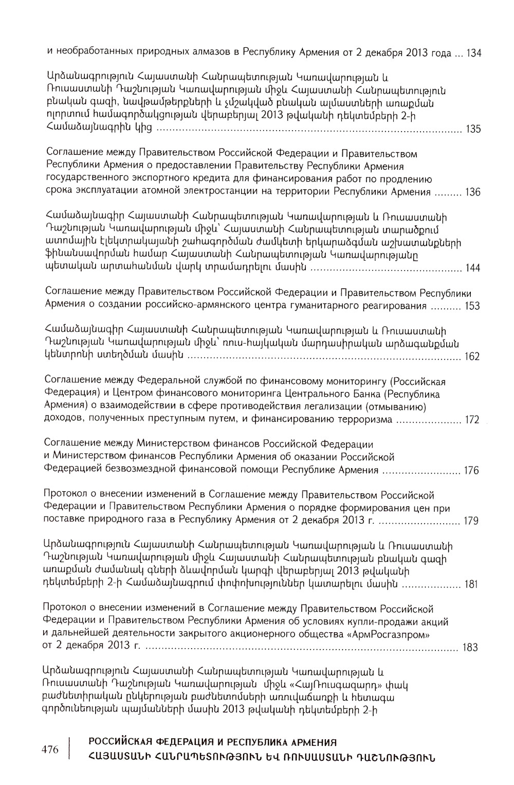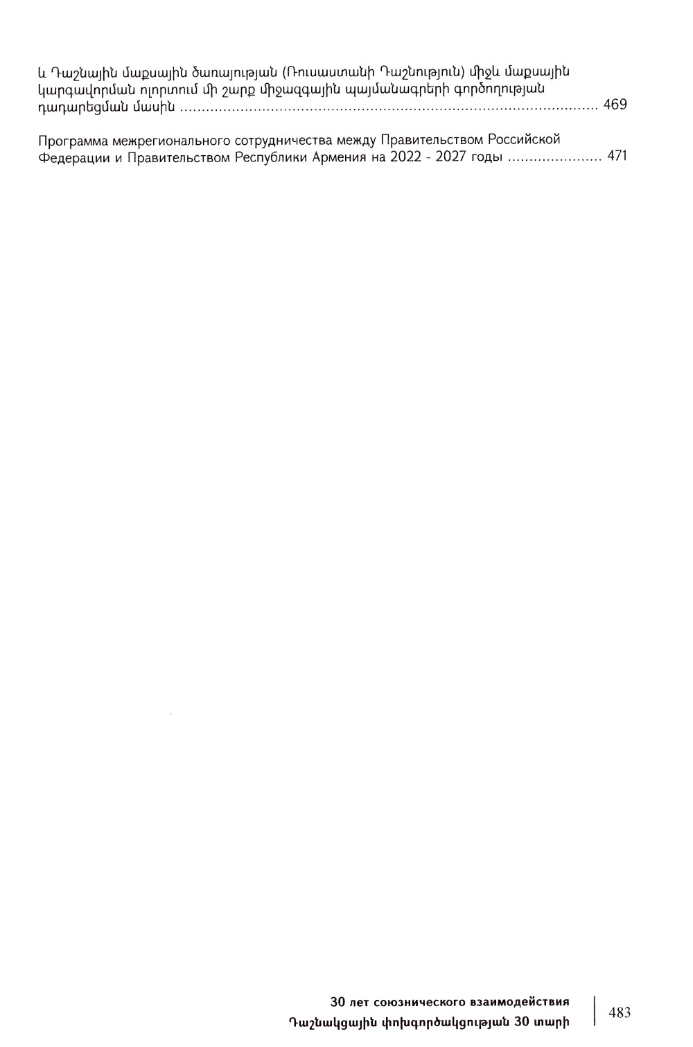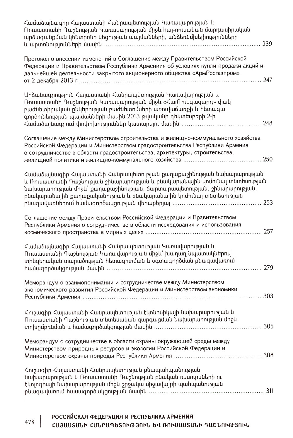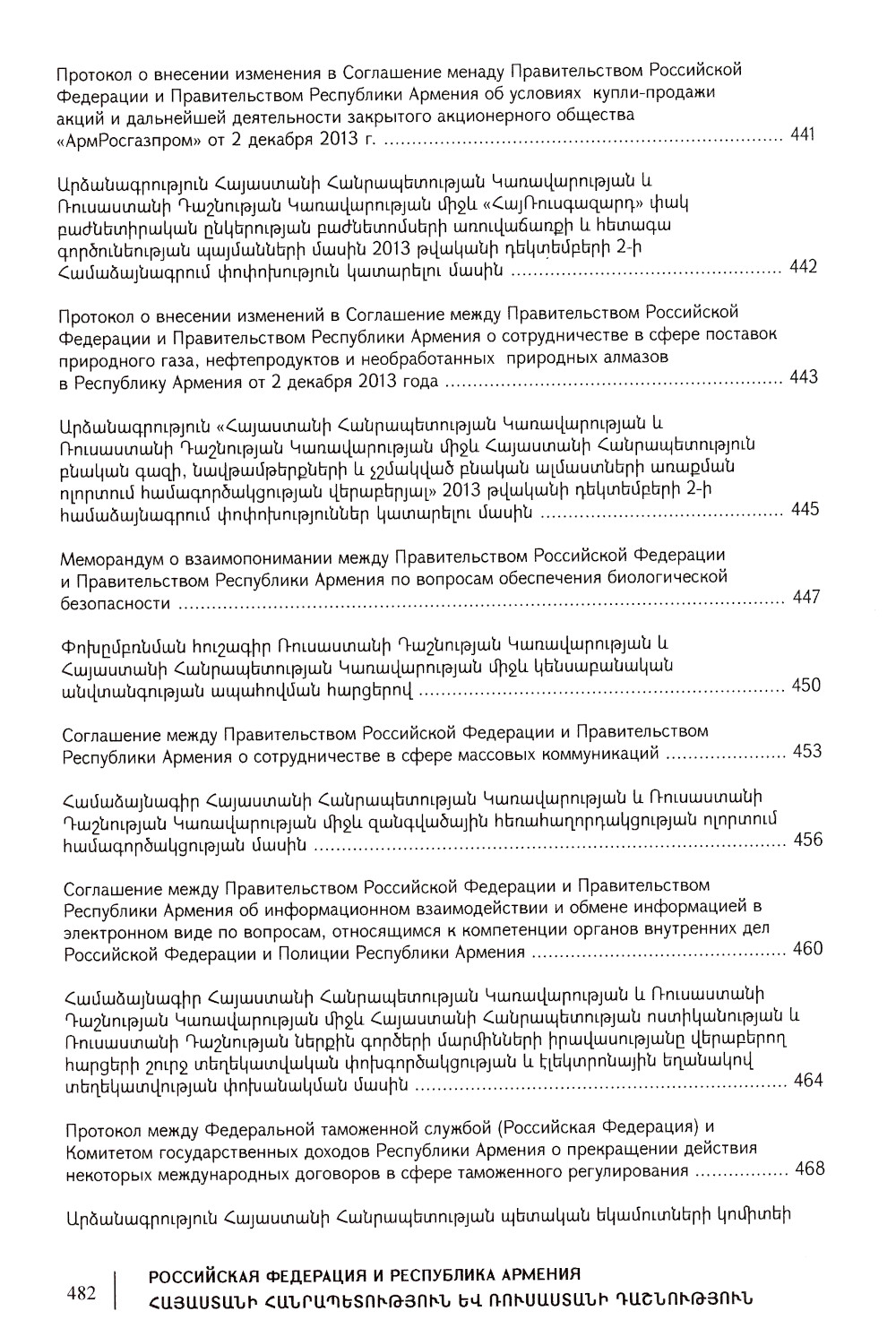 Сборник договоров и соглашений. Т. 2 (2002-2011) на русс.и армян.яз»: Настоящий трехтомный сборник составлен и издан по случаю тридцатилетия установления дипломатических отношений между Российской Федерацией и Республикой Армения. В сборник вошли тексты основных двусторонних документов между Российской Федерацией и Республикой Армения в период с 1992 по 2021 гг. на русском и армянском языках. Сборник составлен усилиями представителей Четвертого департамента стран СНГ- МИД Российской Федерации, Посольства Республики Армения в Москве и Общественной организации «ДИАЛОГ». Он издан при содействии «Дома русской книги» в Ереване.